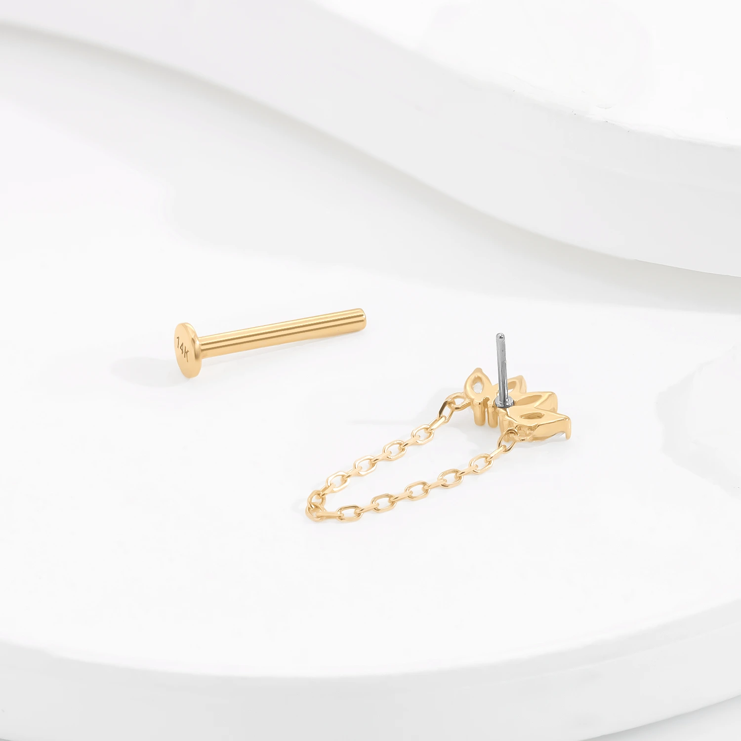 GU15G dazzles as a threadless 14K gold labret stud, featuring clear CZ stones with a chic chain accent, paired with a secure steel push pin.