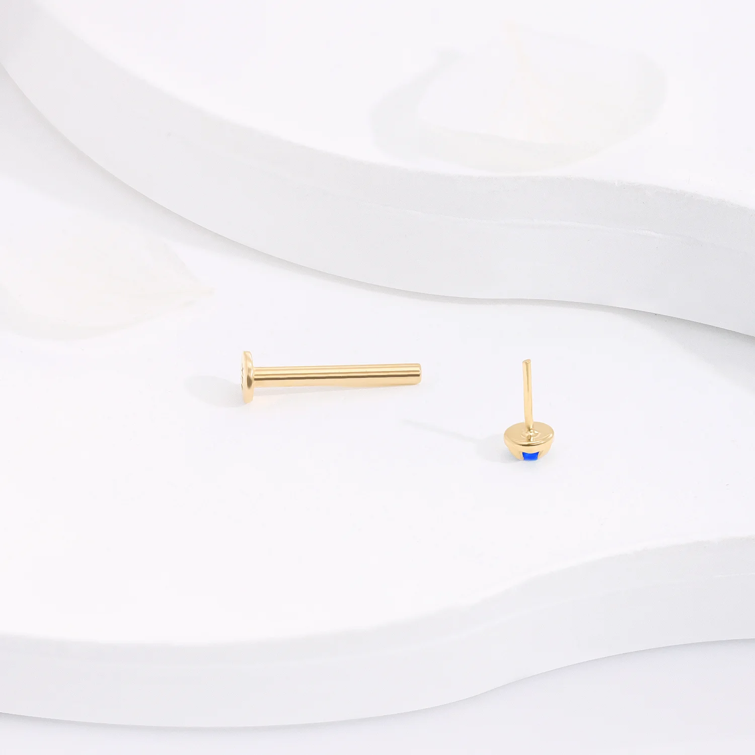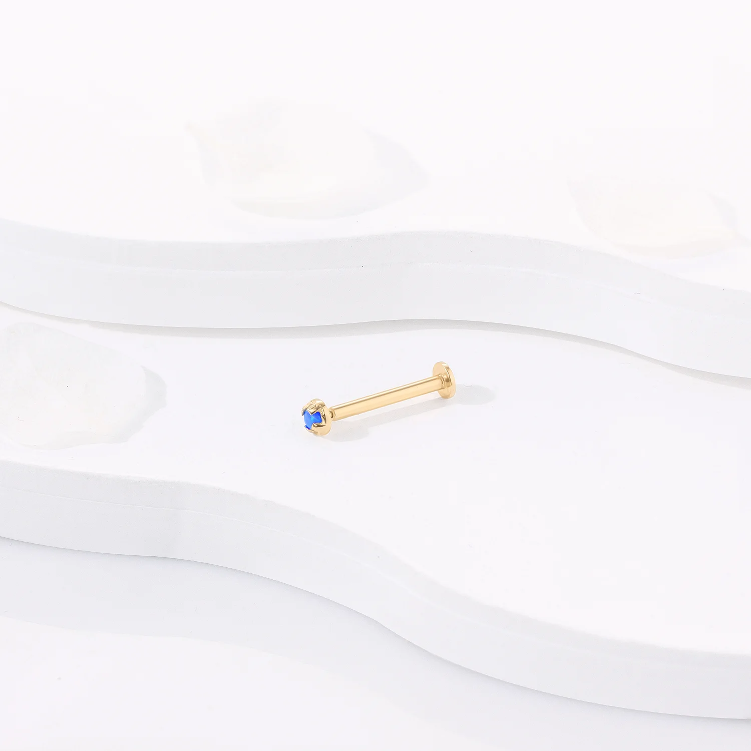 GU162G-OP05 captivates with a 2mm blue opal set in 14K solid gold, making this threadless labret stud a timeless addition to your collection.