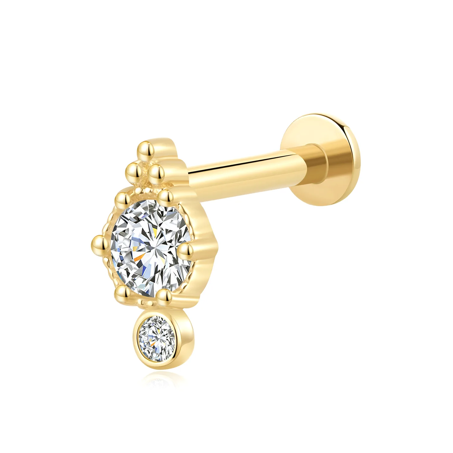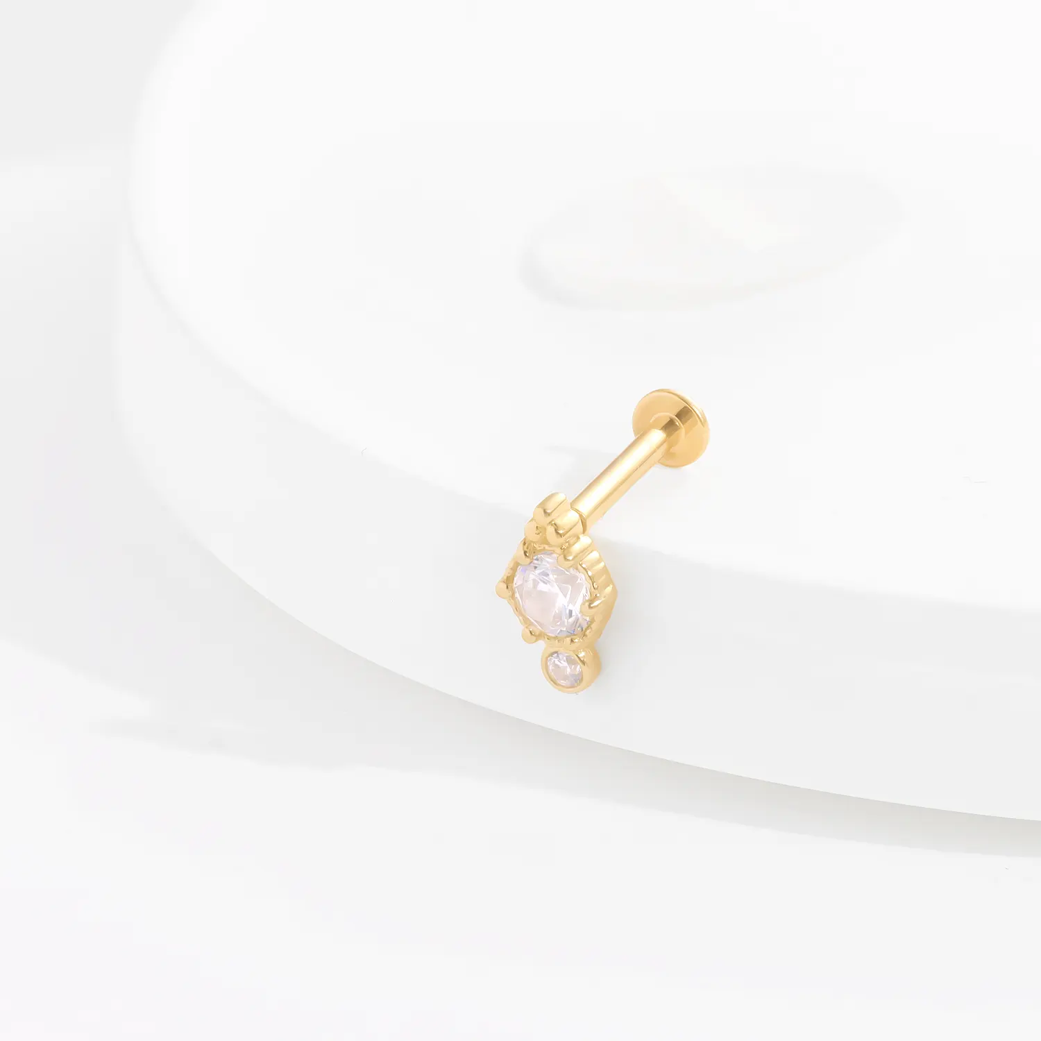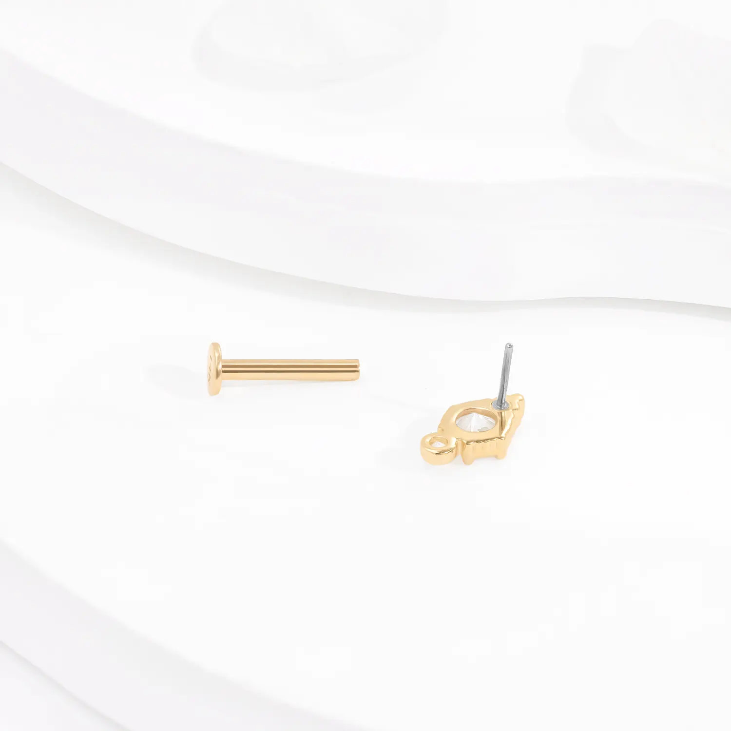 GU73G adorns with a regal touch, featuring a 14K gold threadless labret stud with a stainless steel post and a crown-set round CZ stone.