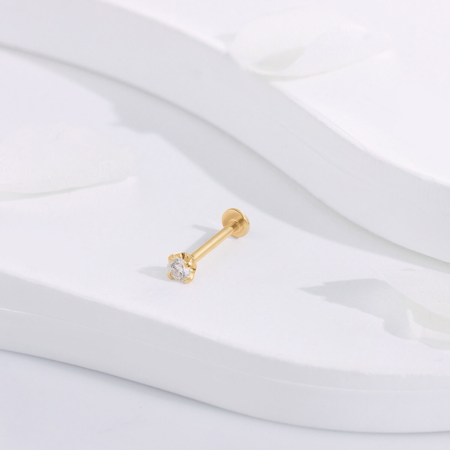 Elevate your style with our exquisite 18K solid gold threadless end, featuring a dazzling SI/H natural diamond, meticulously crafted to enhance its radiant sparkle. The sleek stainless steel push pin ensures a secure and comfortable fit, perfect for an understated yet luxurious statement. Model: 18GU01T-D-2.5