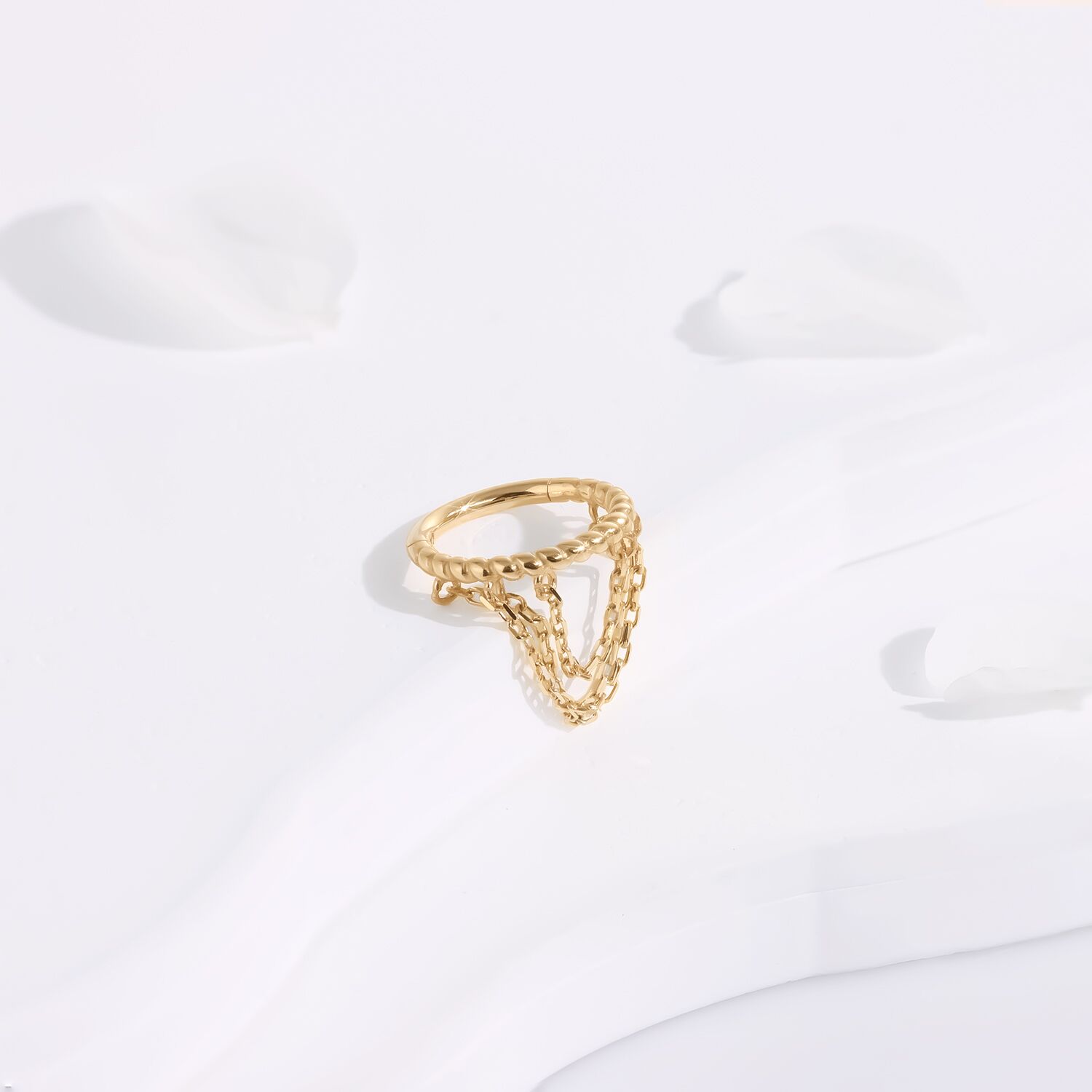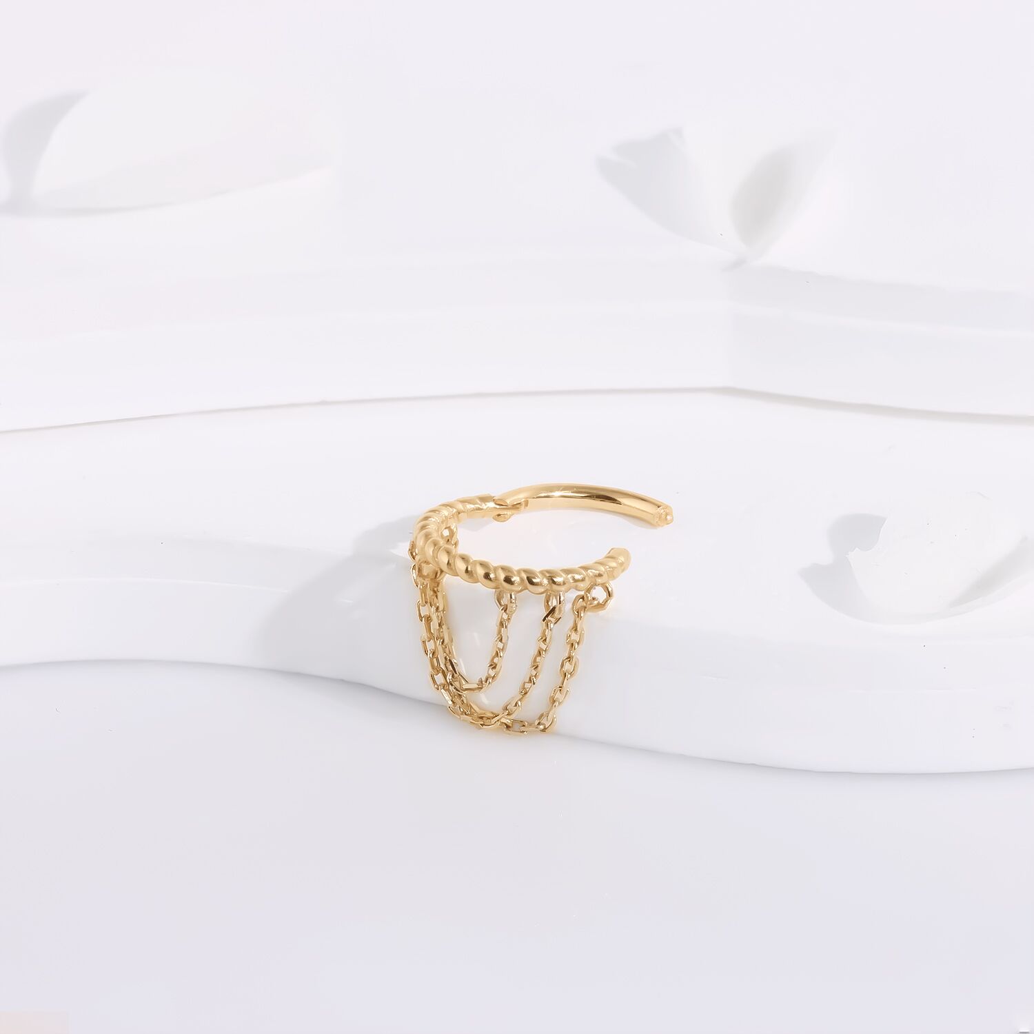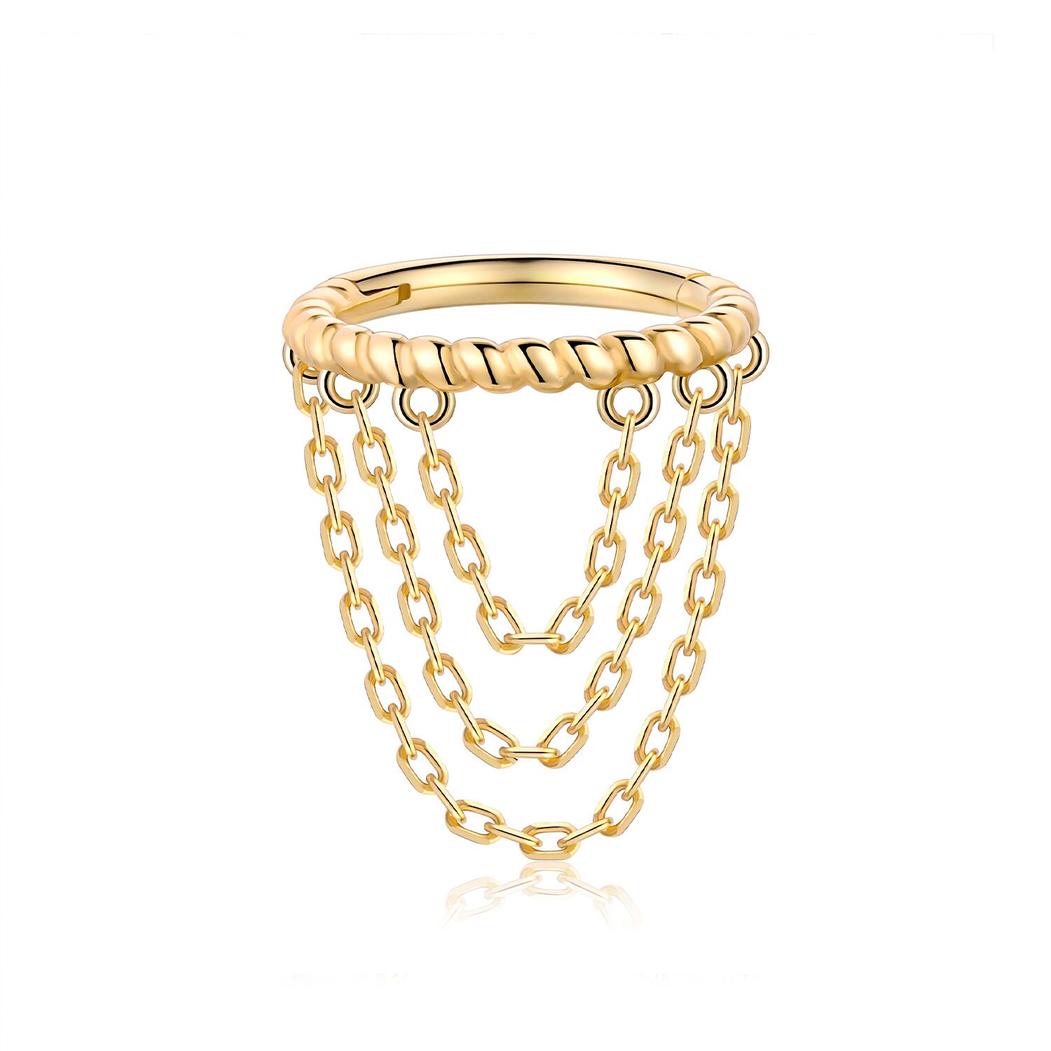 Introducing the KAZ04-1608, a masterpiece of elegance and simplicity. This Hinged Segment Ring is crafted from the finest 14K solid gold, designed to capture the essence of luxury in a subtle yet striking manner. Each ring is meticulously fashioned with a precision hinge, ensuring a seamless fit that is both comfortable and secure. Adorned with dainty dangle chains, this piece moves gracefully with you, offering a touch of sophistication that elevates any attire. Ideal for those who appreciate the delicate balance of classic style with modern flair, the KAZ04-1608 is more than jewelry—it’s a statement of timeless beauty