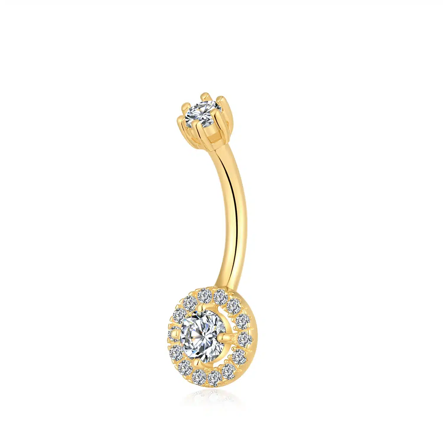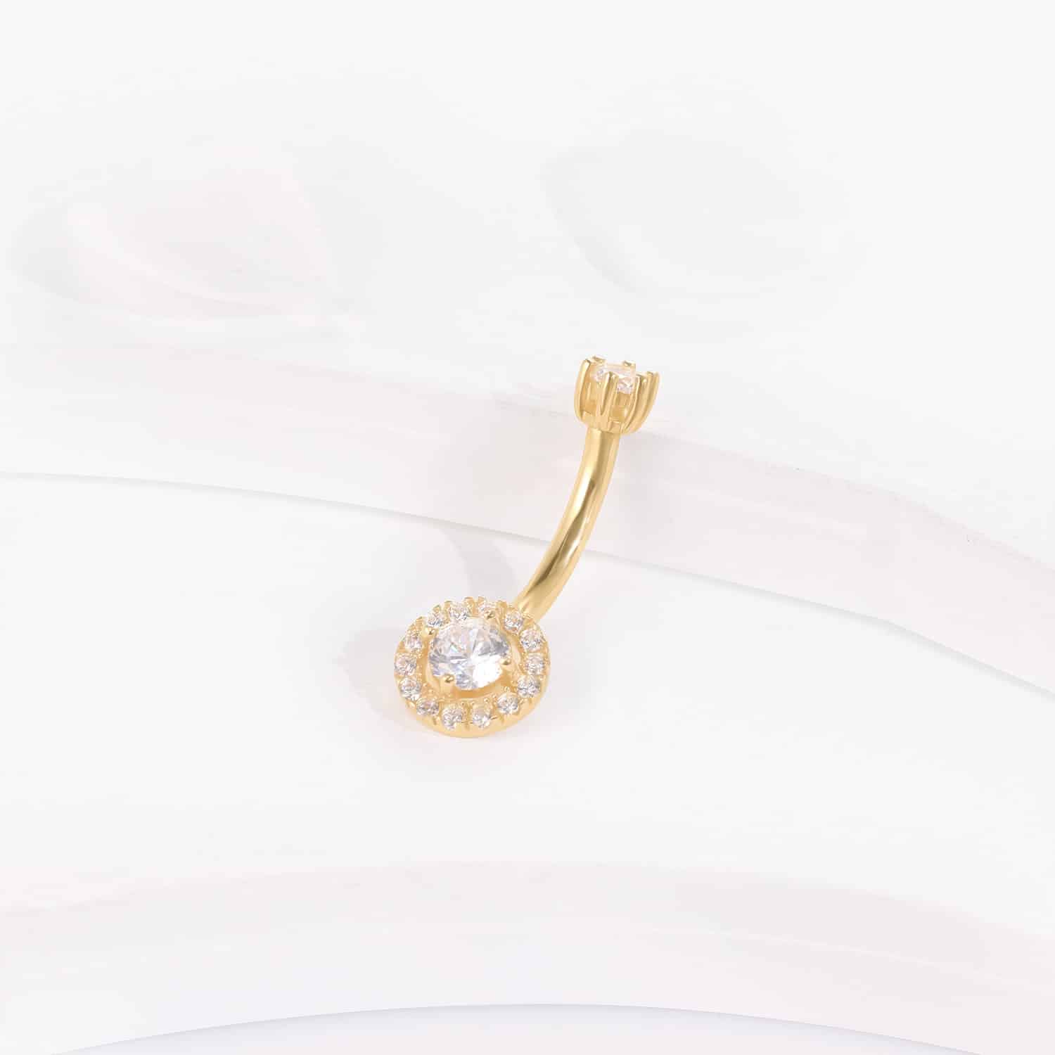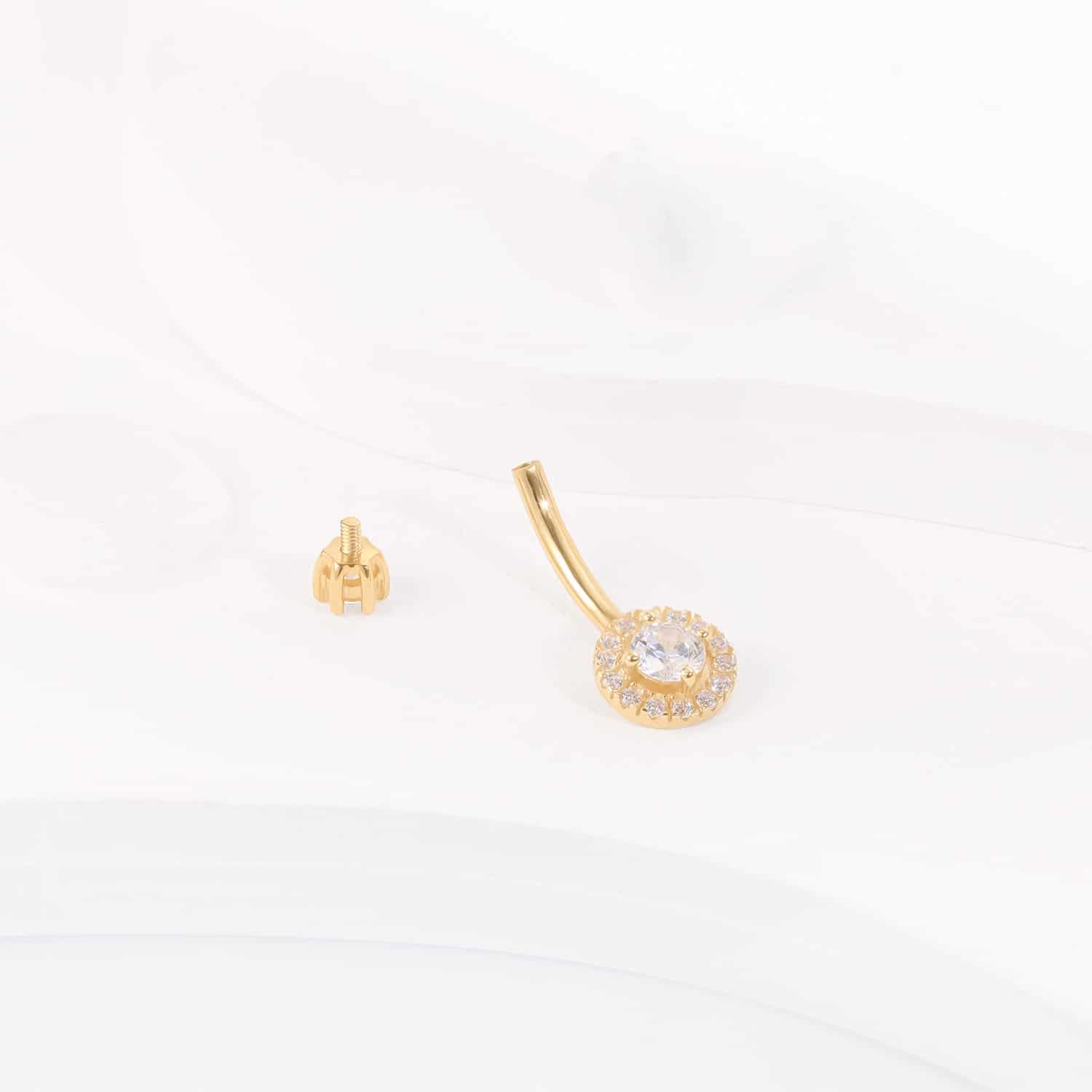 Adorn your navel with the GW24G-1410, a 14K yellow gold ring that glistens with a halo of cubic zircon. Its internal threading ensures a comfortable fit for a piece that’s both stunning and secure.