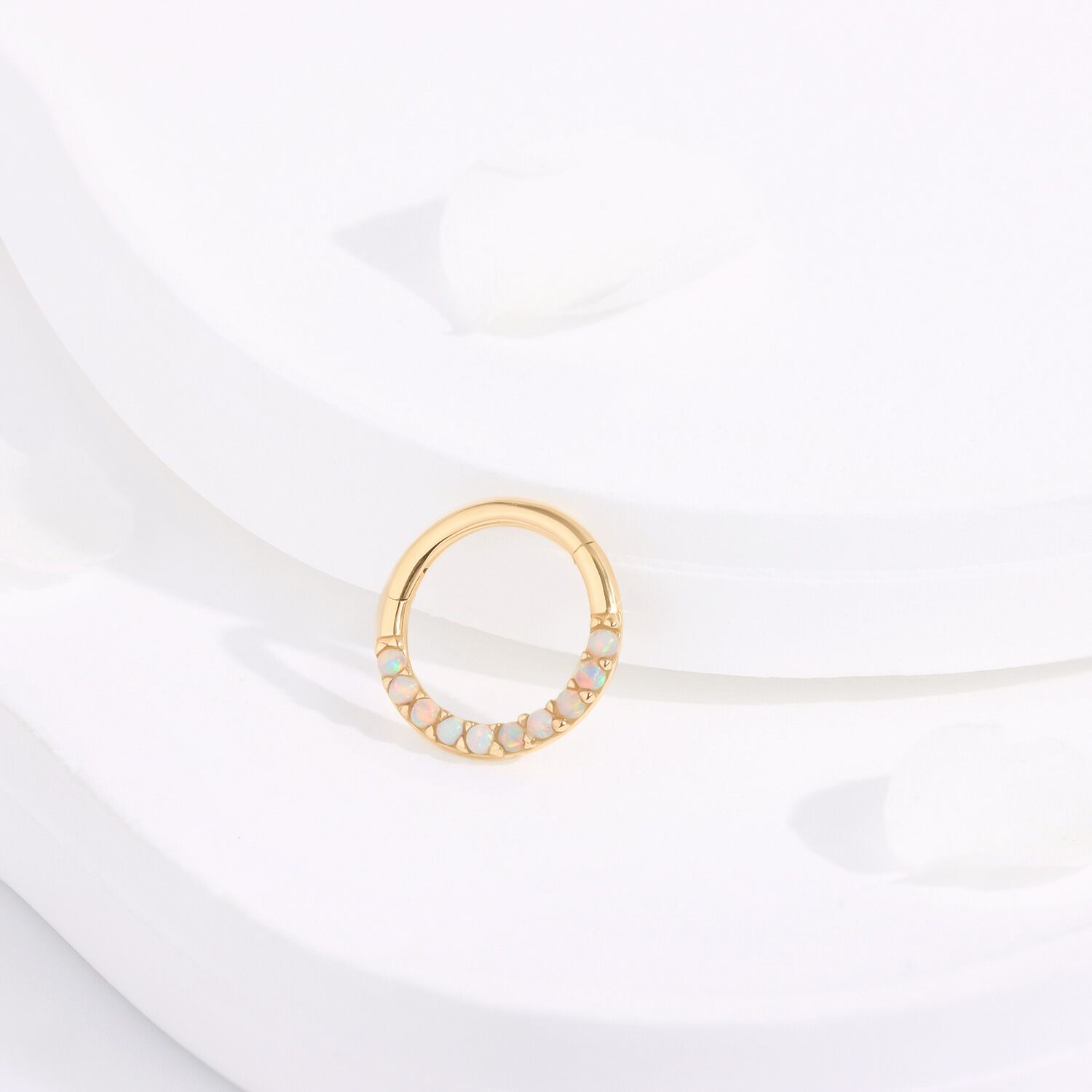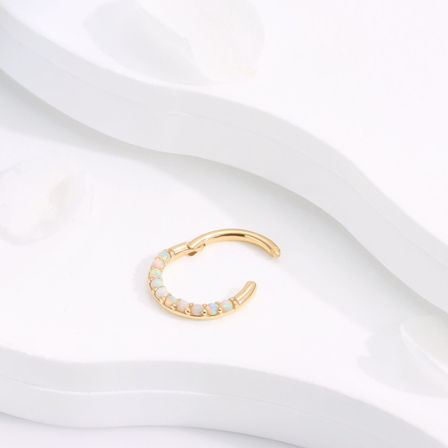 The KAV15G-OP17-1608 Hinged Segment Ring dazzles with 14k solid gold and radiant opal stones, a testament to understated luxury and elegance.