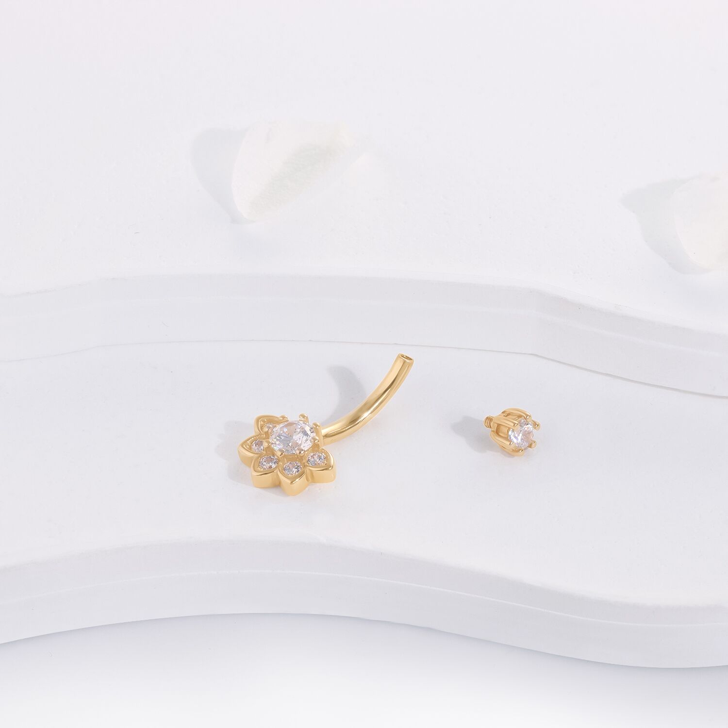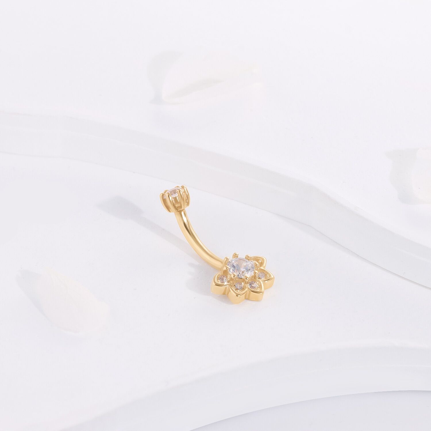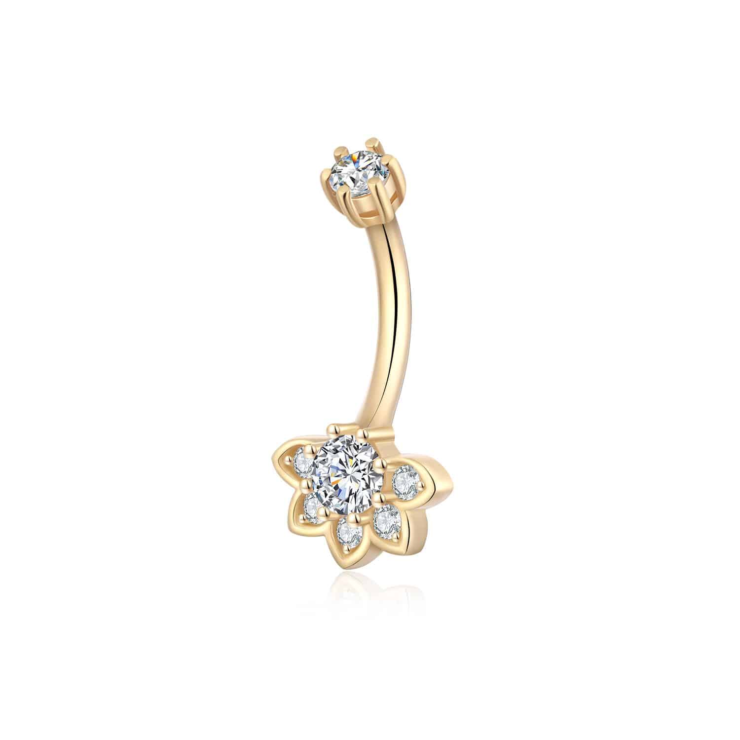 The KD23G-1410 Navel Ring sparkles with a floral charm, featuring 14K yellow gold and dazzling cubic zirconia, perfect for a touch of spring elegance.