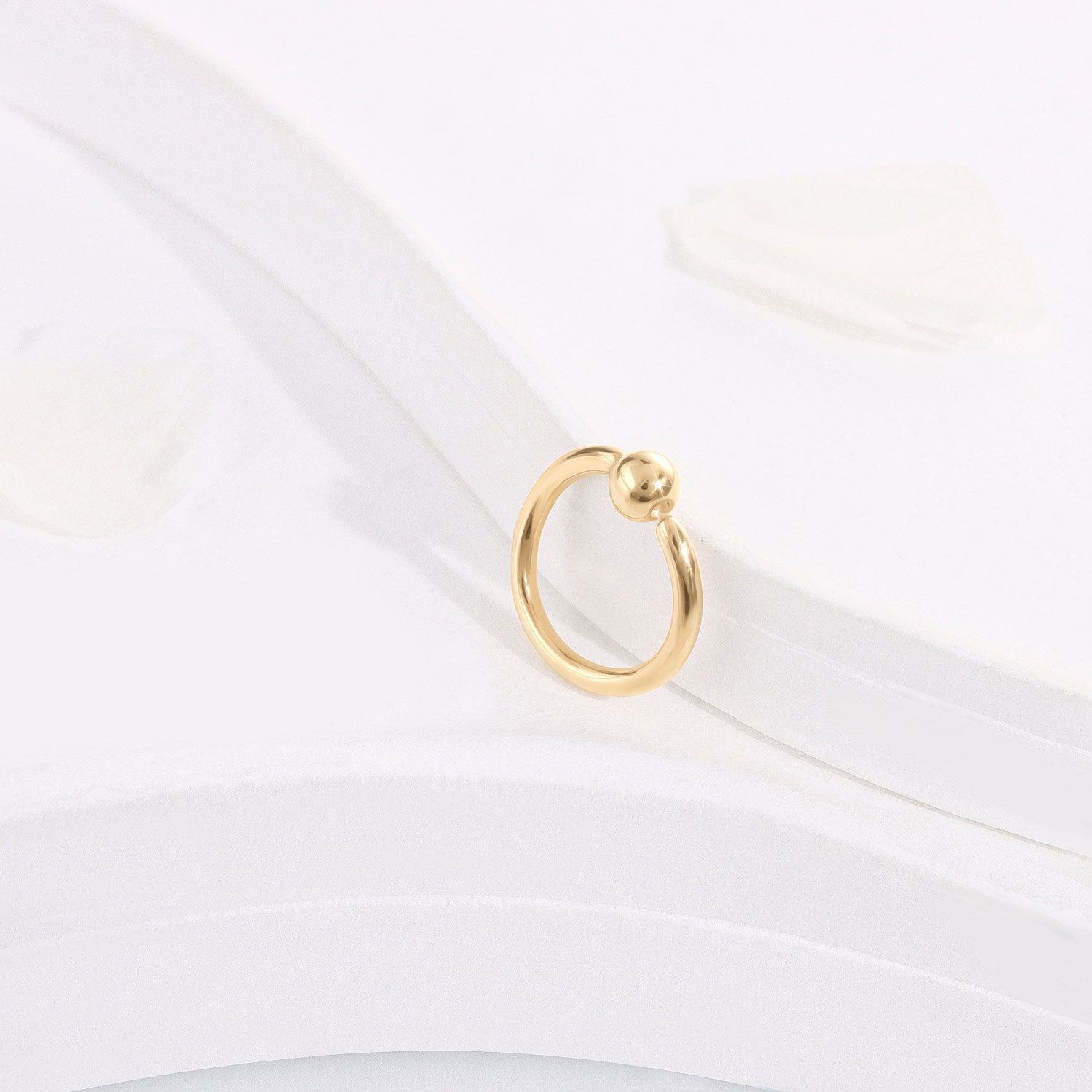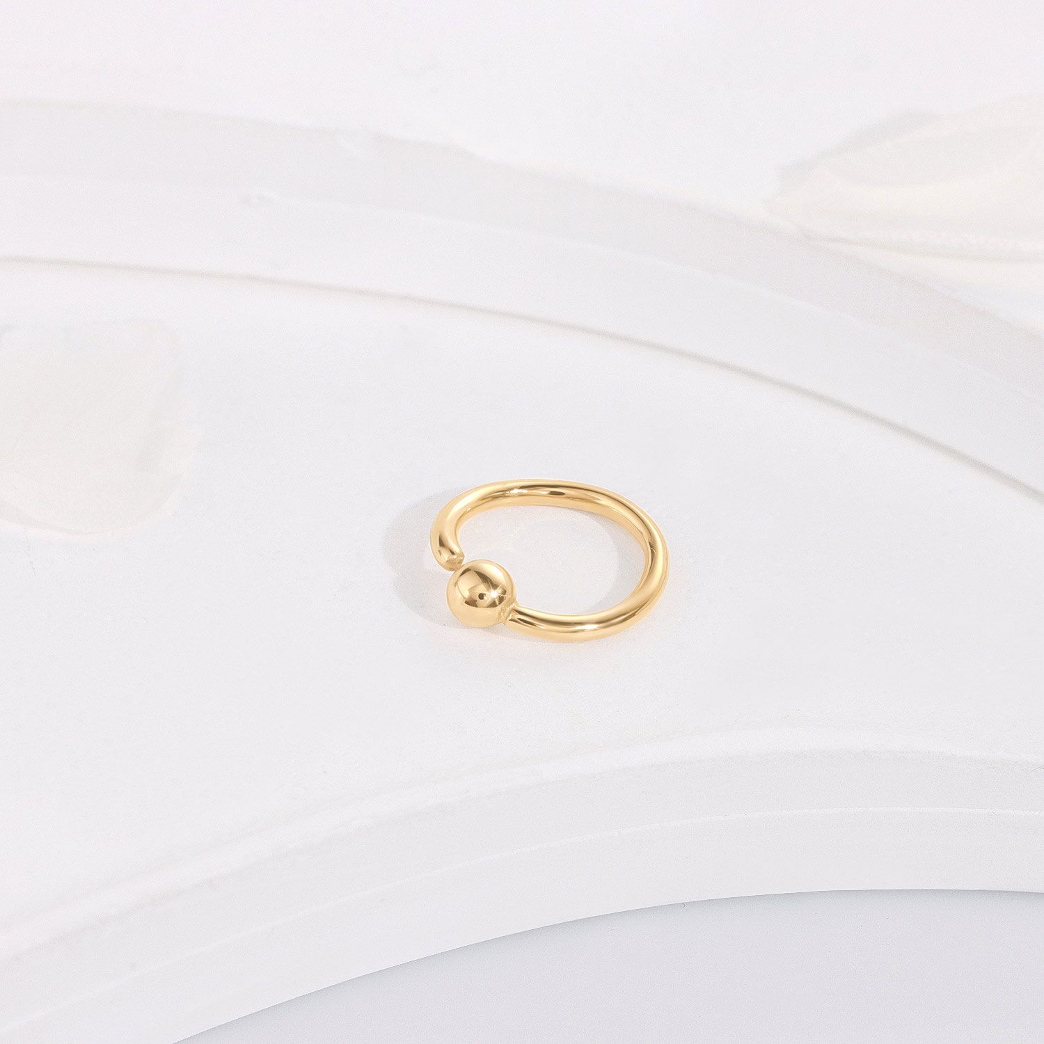 Embrace the KB03G-1608, a seamless ring where functionality meets finesse. Forged in 14K yellow gold, it features a distinctive ball closure that offers both security and style.