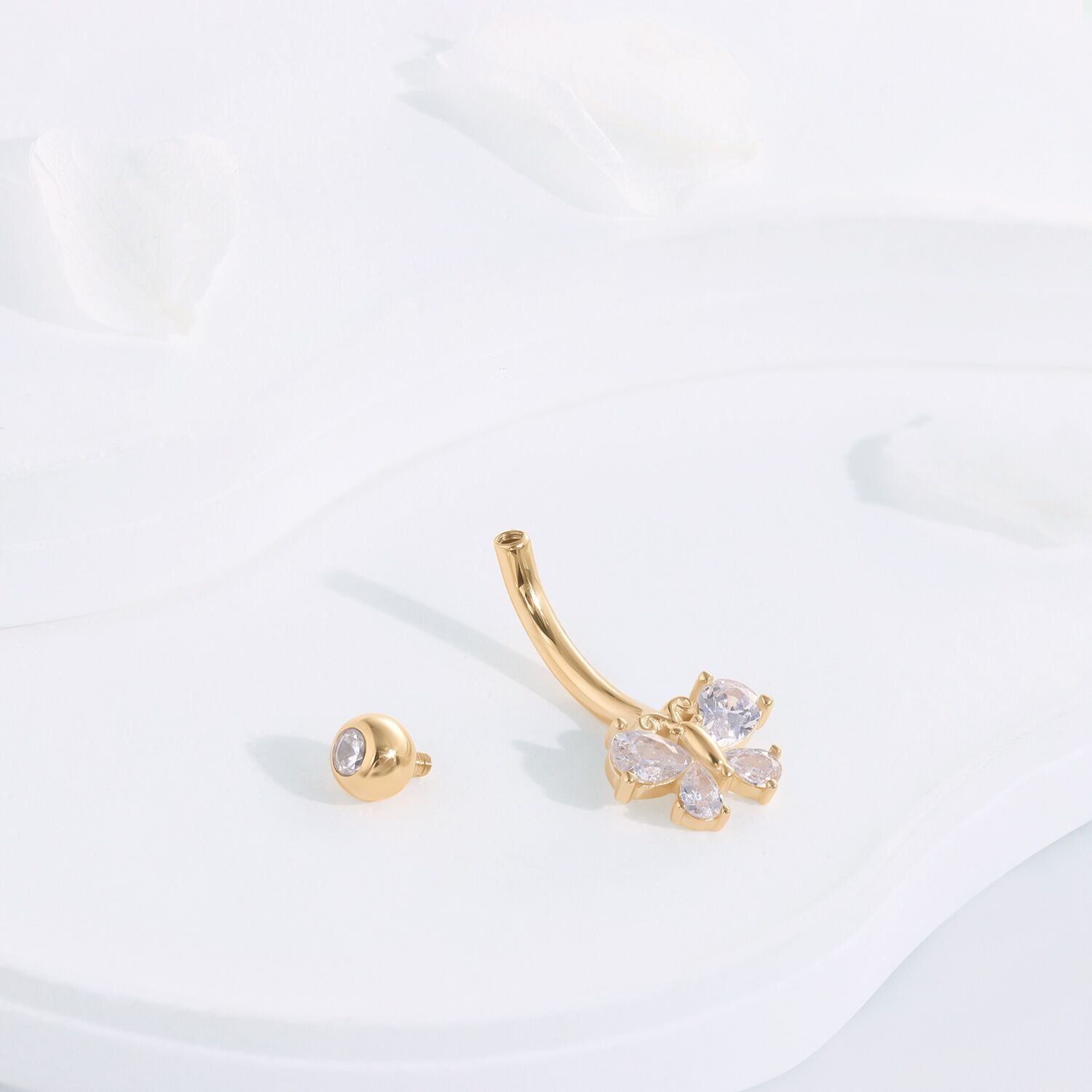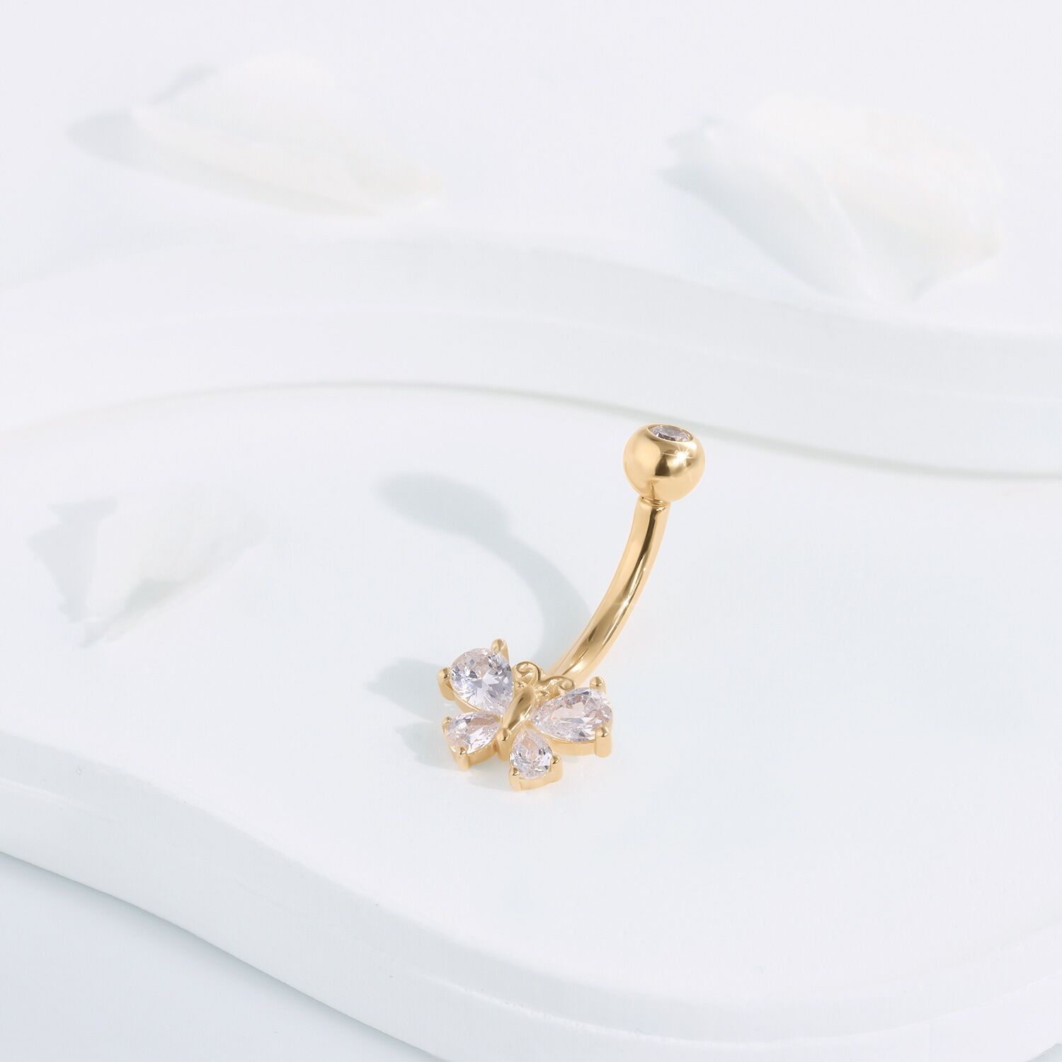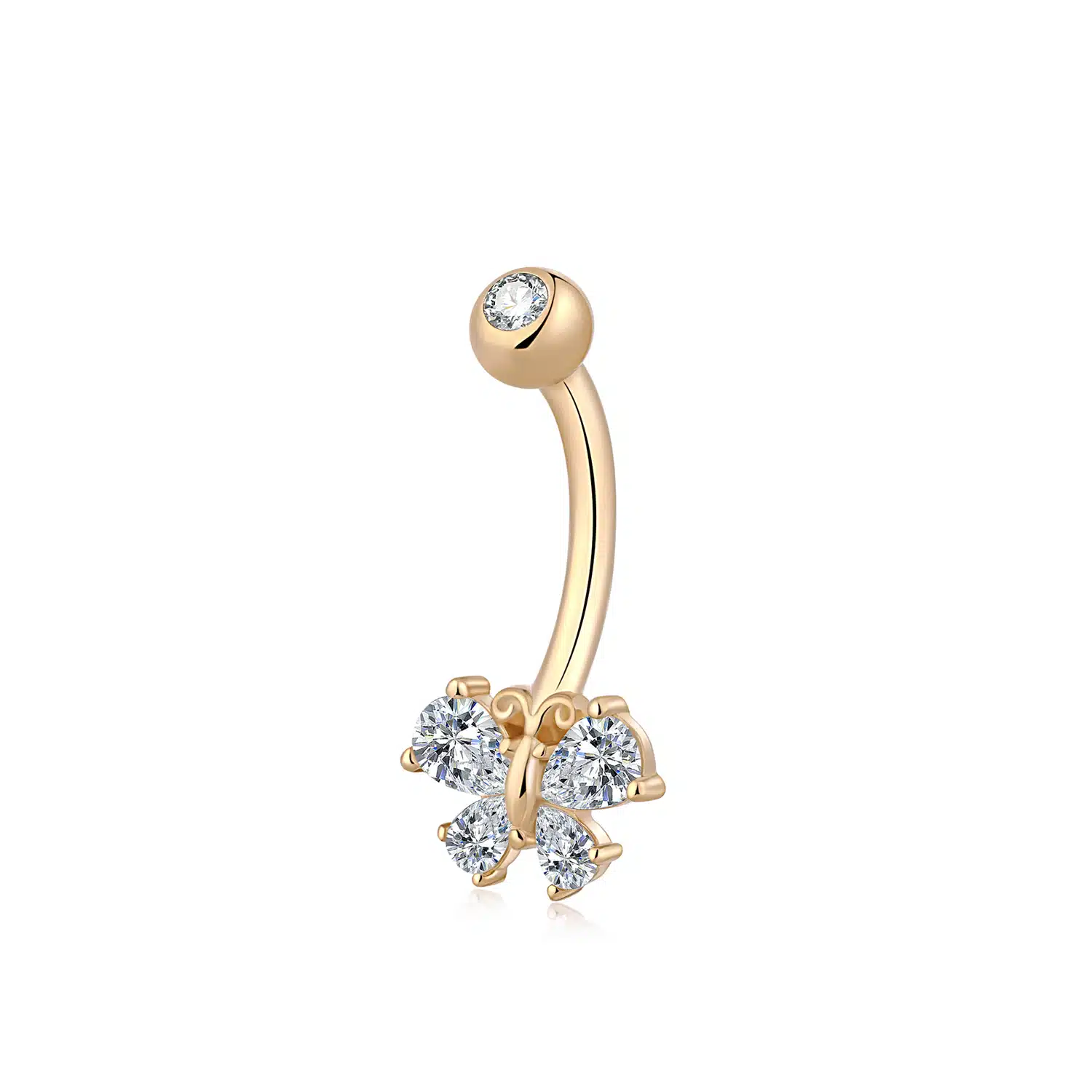 Embrace the delicate flutter of luxury with the GW30G Navel Ring. Crafted in 14K yellow gold, this internally threaded piece features a charming butterfly shape adorned with brilliant cubic zirconia, offering a touch of whimsy and sparkle to grace your midsection.