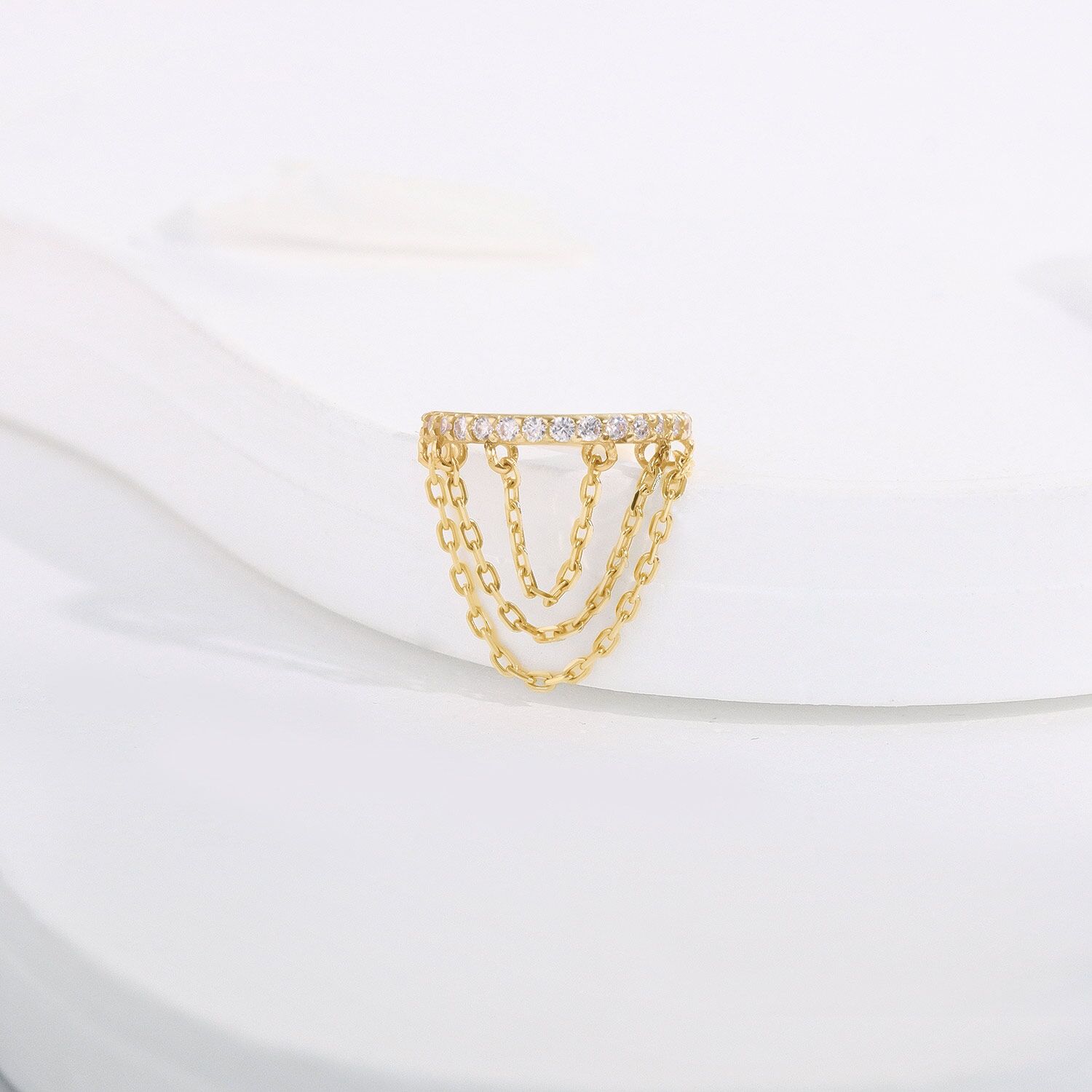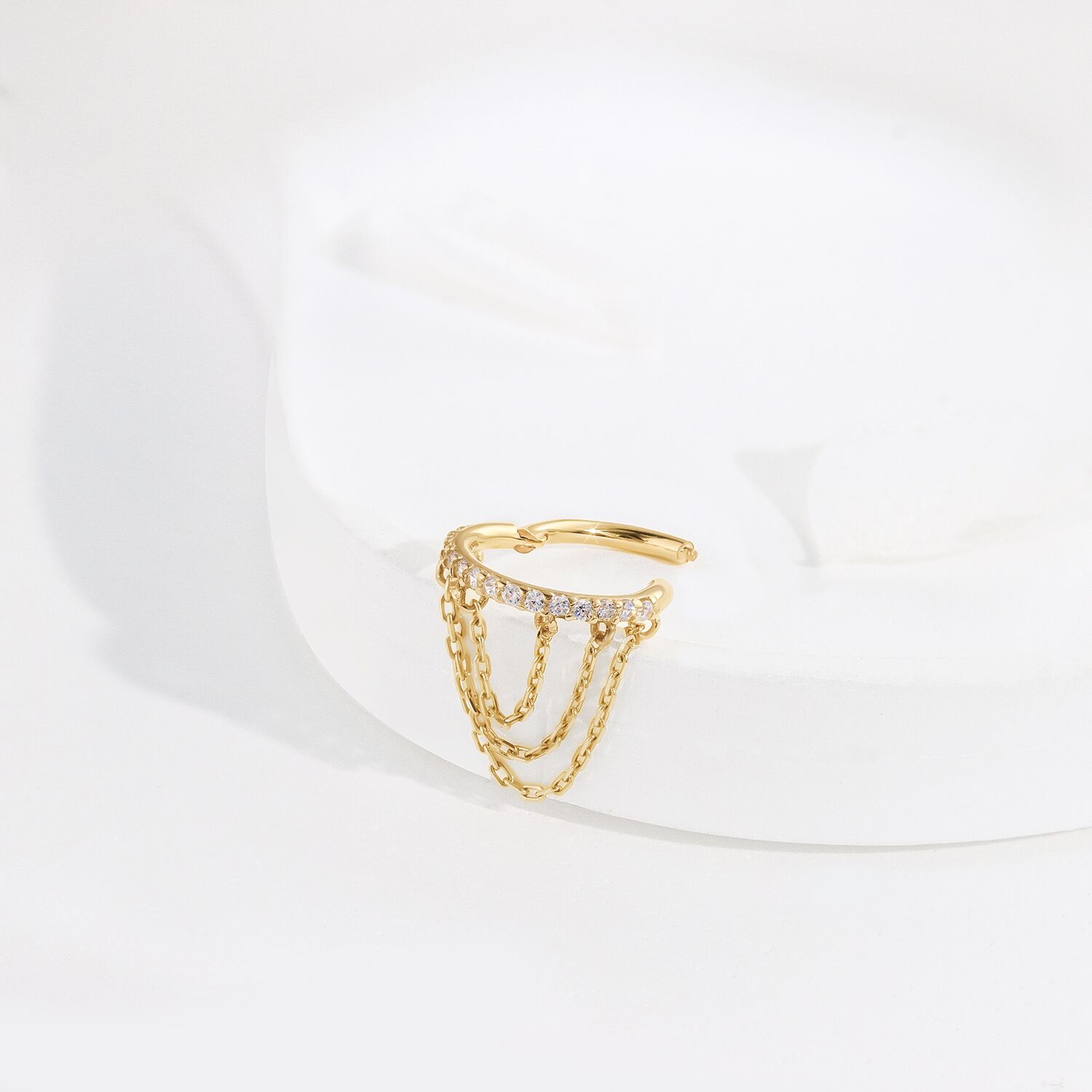 Elevate your piercing game with the GZA05, a 14K solid gold hinged segment ring that dazzles with dangle chains.