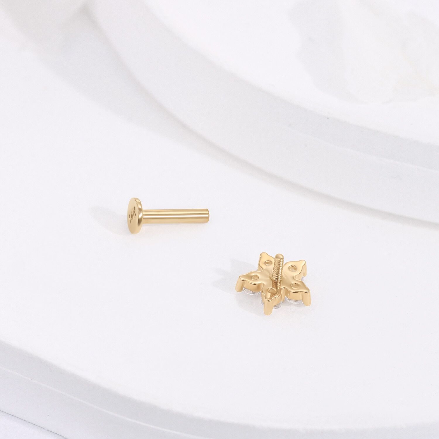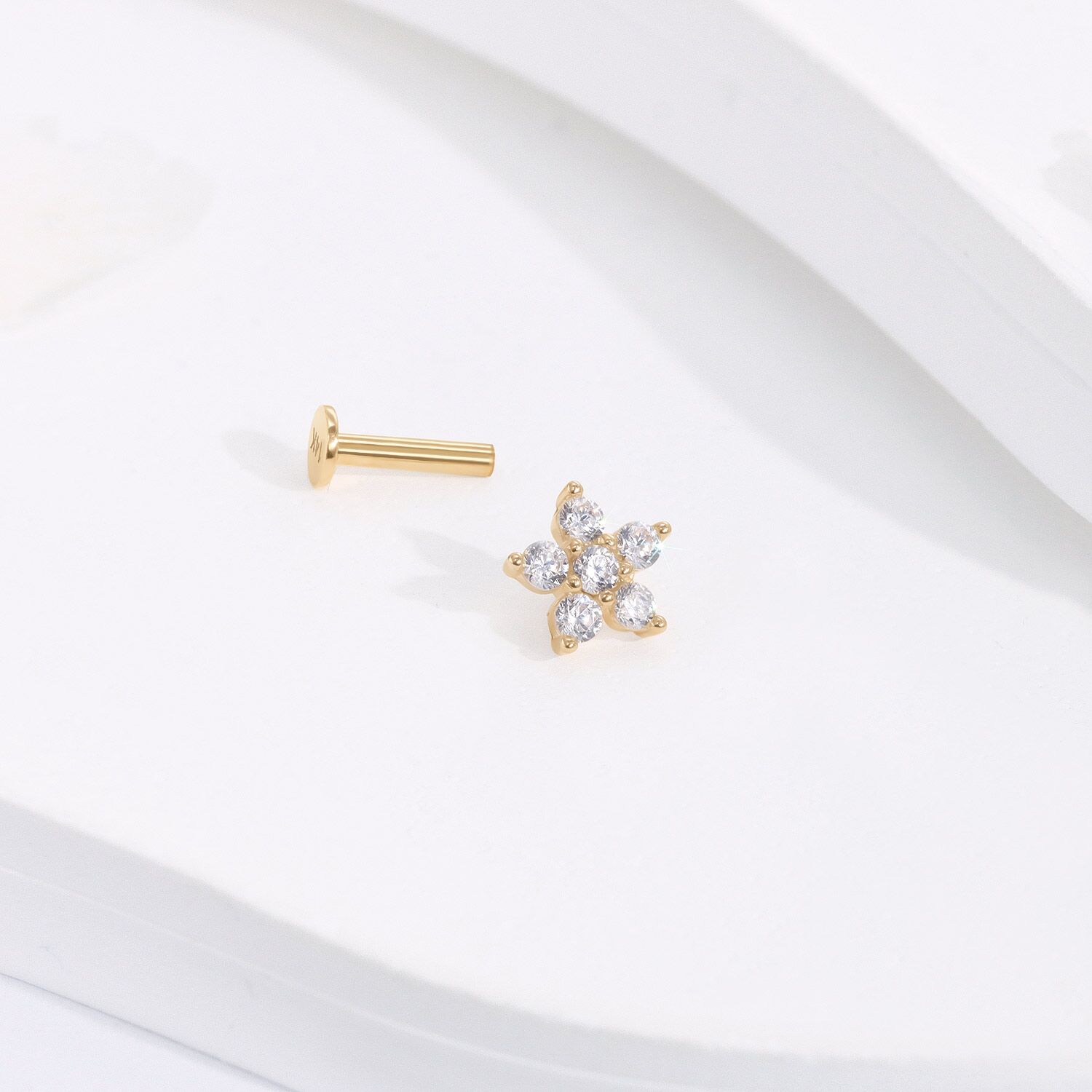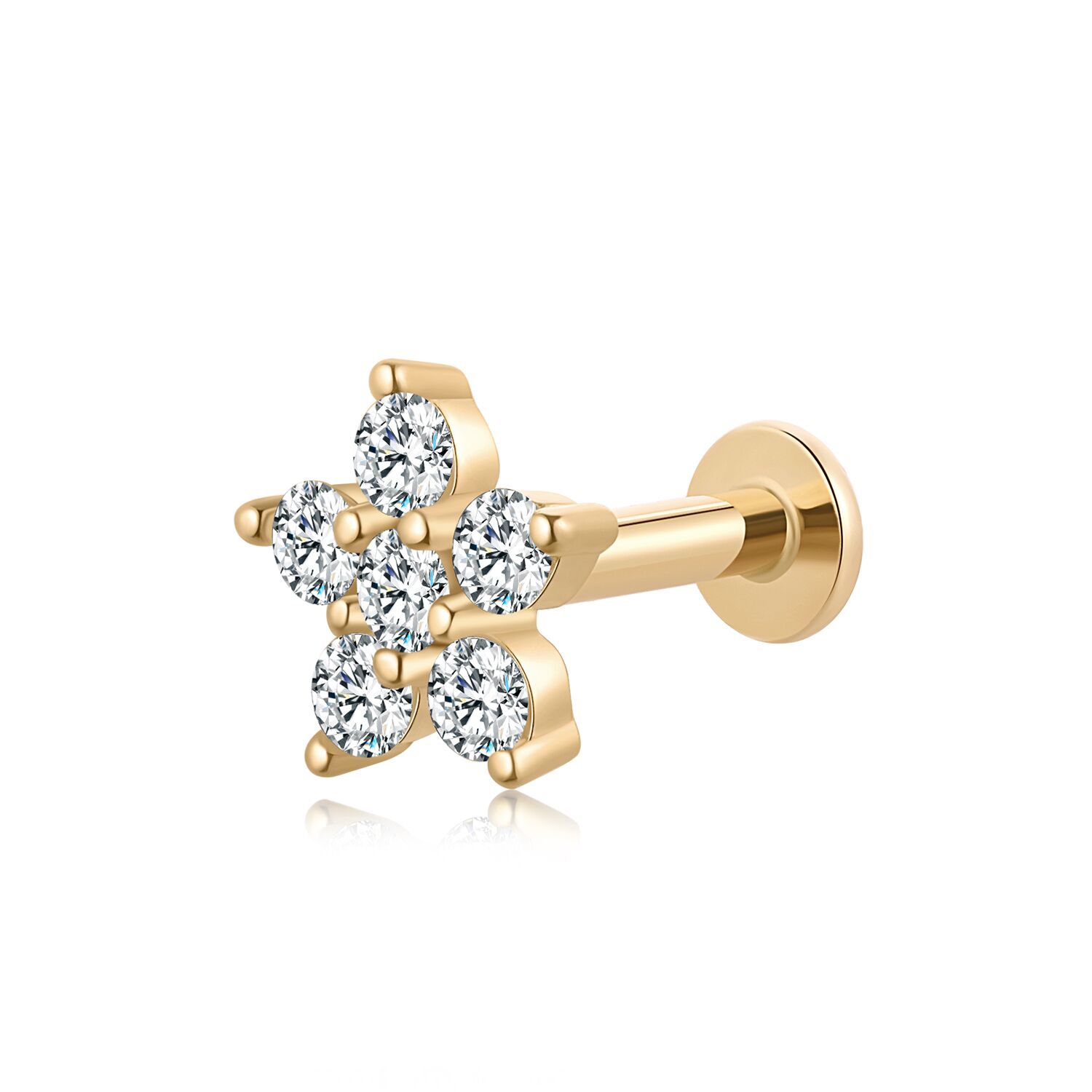 Embrace modern luxury with the KLF36G-1606 Internally Threaded Labret Stud. Cast in lustrous 14K yellow gold, this piece flaunts a bloom of brilliant-cut cubic zircon arranged to mirror a flower’s silhouette. A fusion of art and anatomy, it’s designed to adorn your lips with a touch of opulence.
