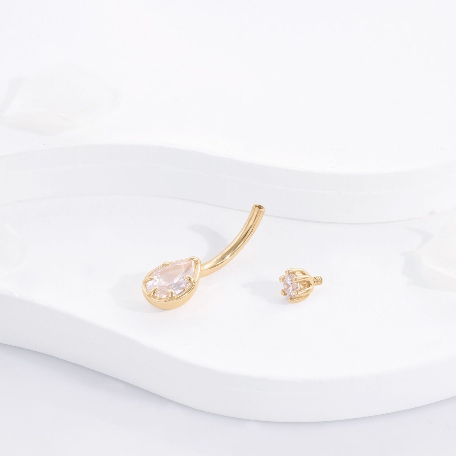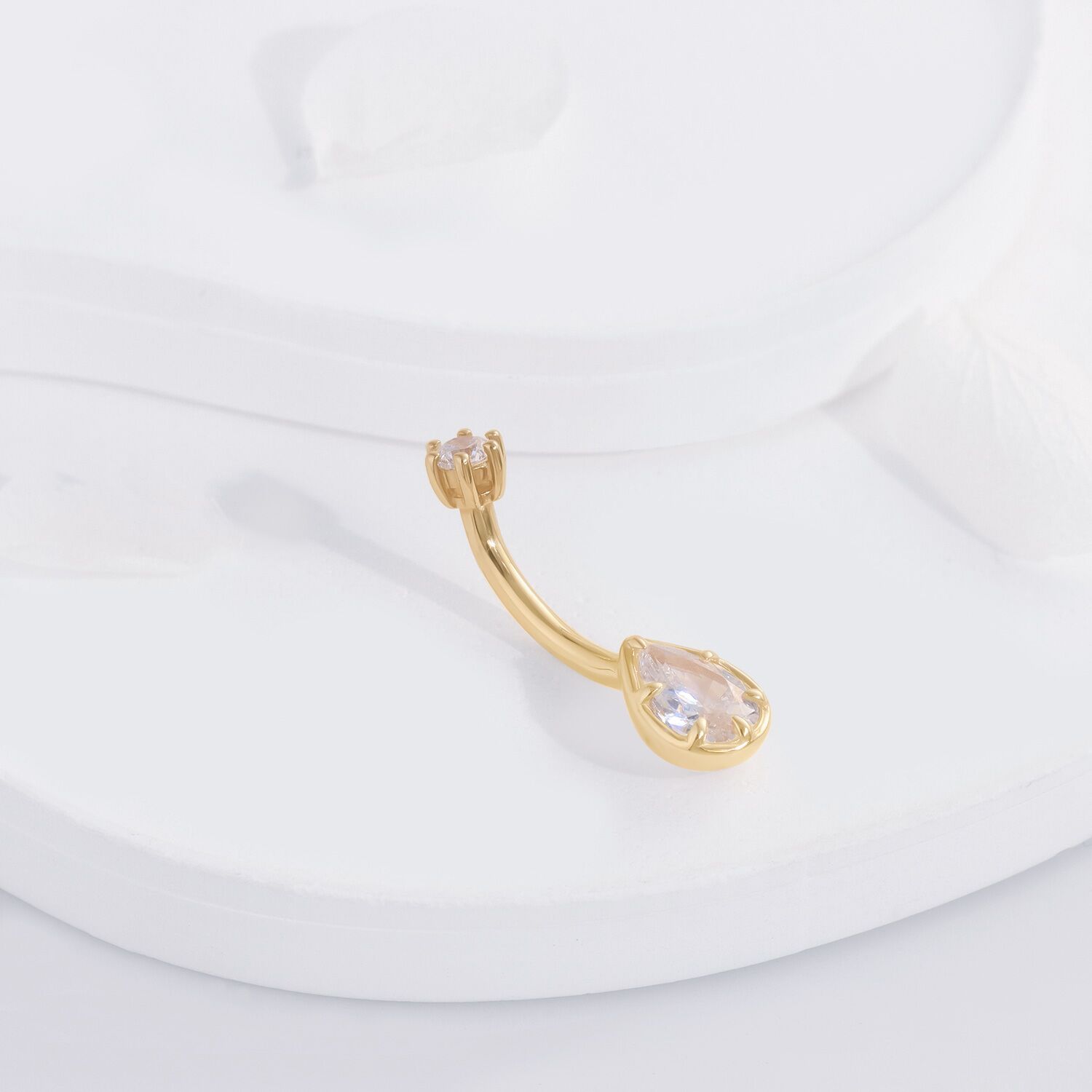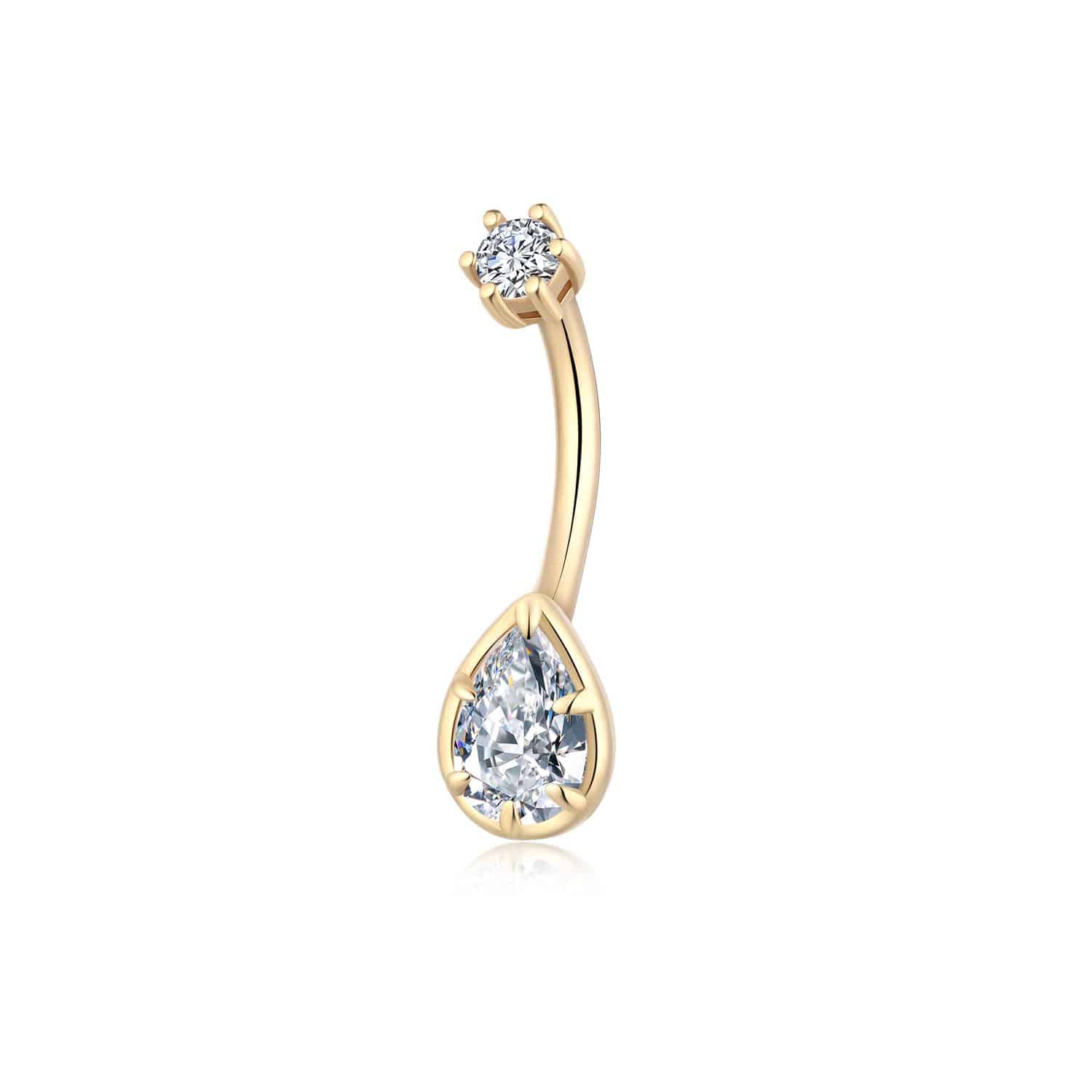 The KD18G-1410 Navel Ring dazzles with its teardrop cubic zirconia set in 14K yellow gold, offering an exquisite accent to your curated body jewelry.
