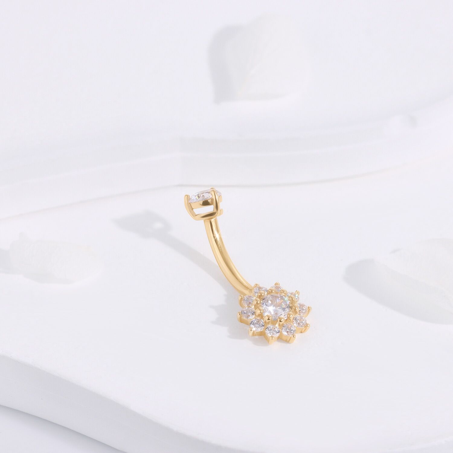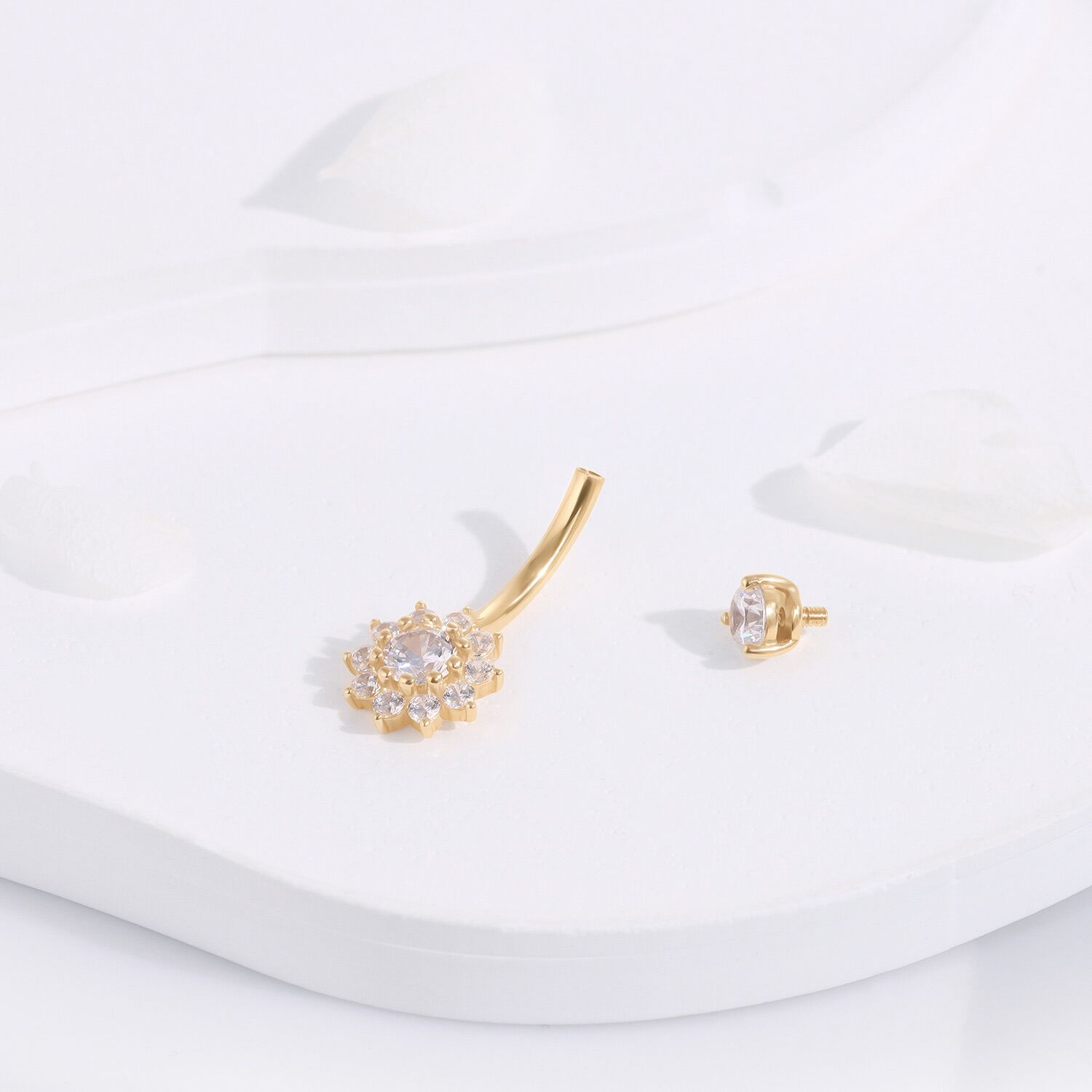 The KDV3054G Navel Ring, an internally threaded 14K yellow gold masterpiece, features a sunburst of cubic zirconia, lighting up your style with its radiant sparkle.