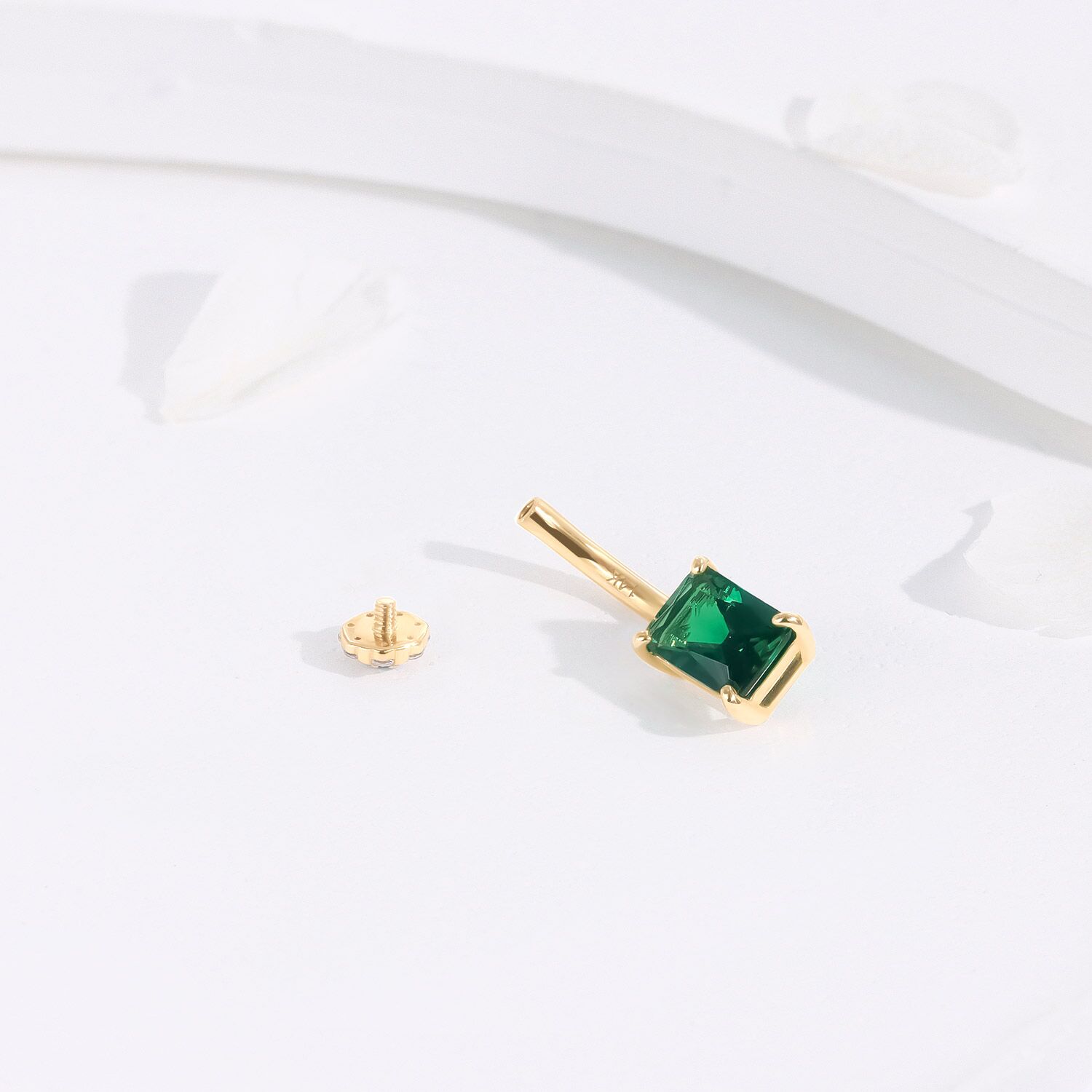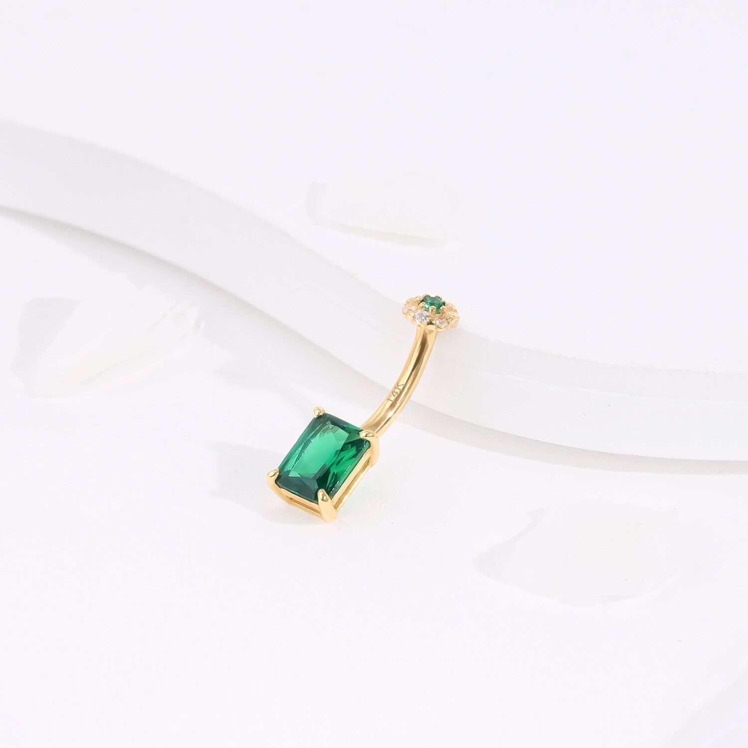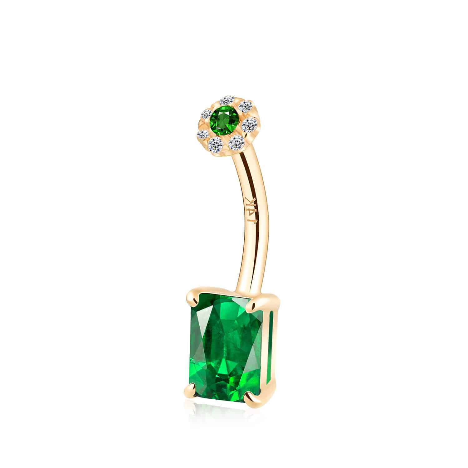 The KDV3041-1410 Navel Ring shines with a vibrant green cubic zirconia, set in a luxurious 14K yellow gold frame, adding a burst of color and elegance to your piercing collection.