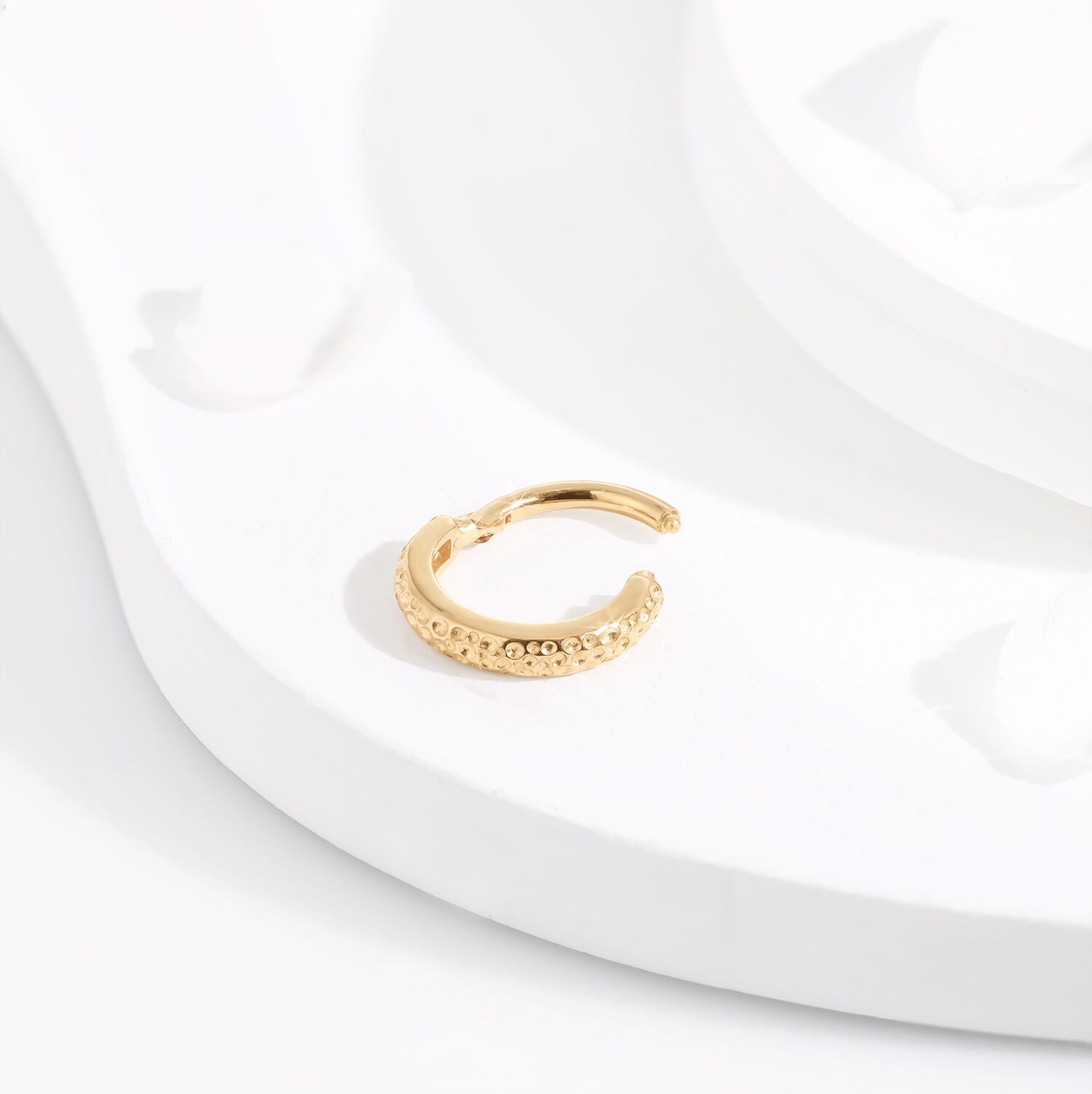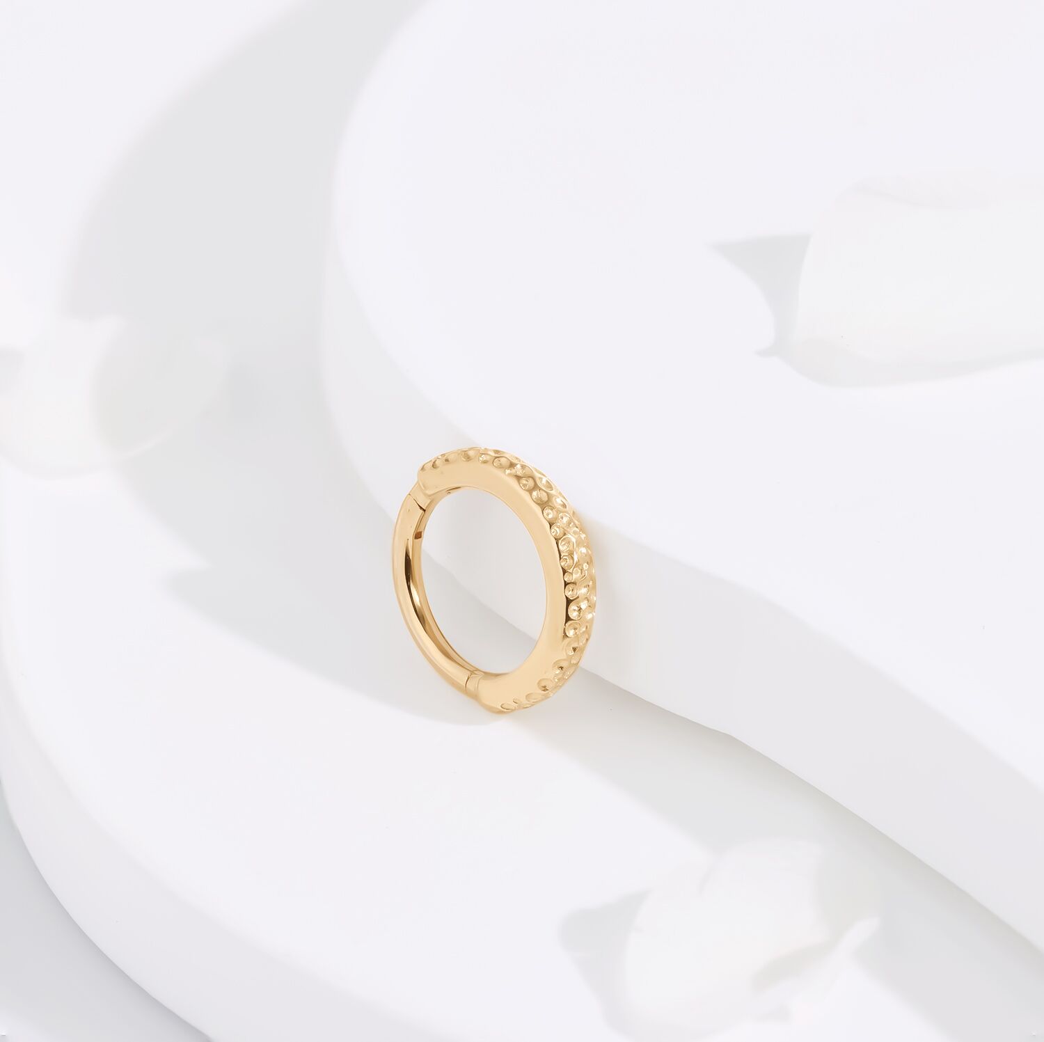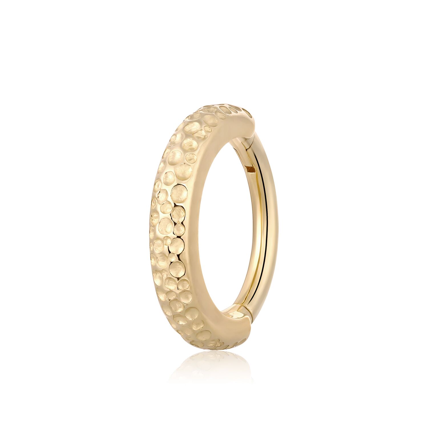 Elevate your body art with the KA57G-1608 Hinged Segment Ring, meticulously crafted from 14k solid gold. Its distinctive hammered texture adds a multidimensional shimmer, while the hinged design promises secure and comfortable wear. A luxurious addition to your piercing collection.