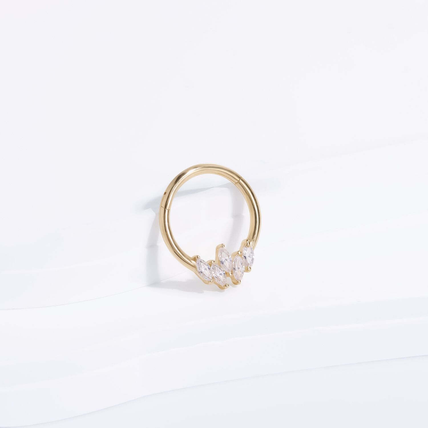 The KA66G-1610 Hinged Segment Ring brings a touch of regal opulence to your body jewelry collection with its 14k solid gold composition and sparkling marquise-cut cubic zirconia.