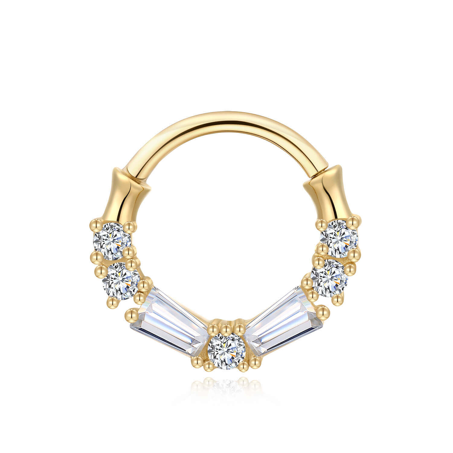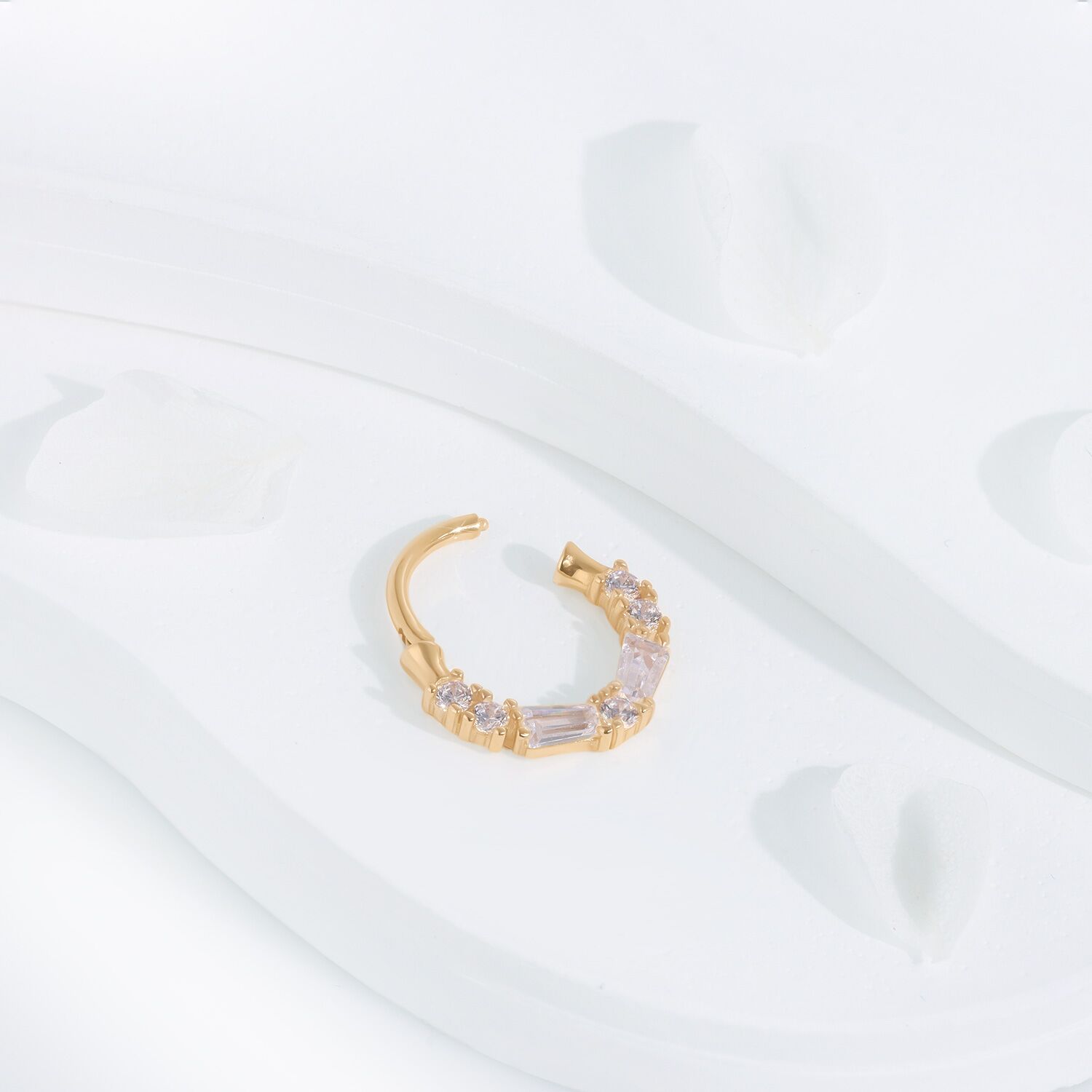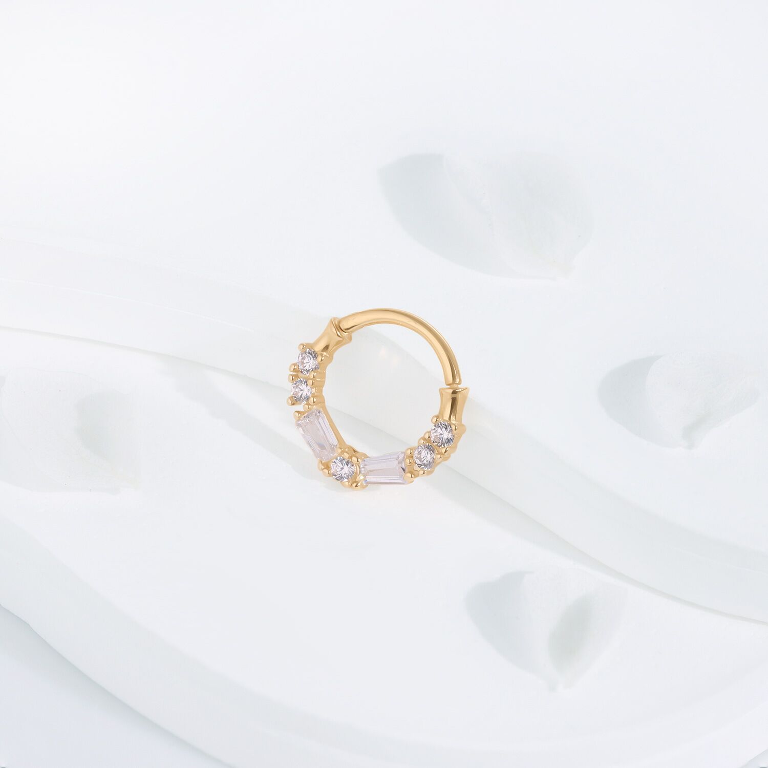 Illuminate your style with the KA64G-1610 Hinged Segment Ring, a fusion of 14k solid gold and luminous cubic zirconia. Its bold, geometric cuts create a modern aesthetic, while the articulated hinge design offers both security and comfort for a distinctive addition to your piercing collection.