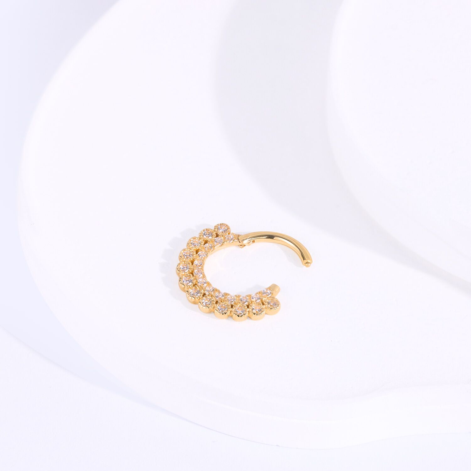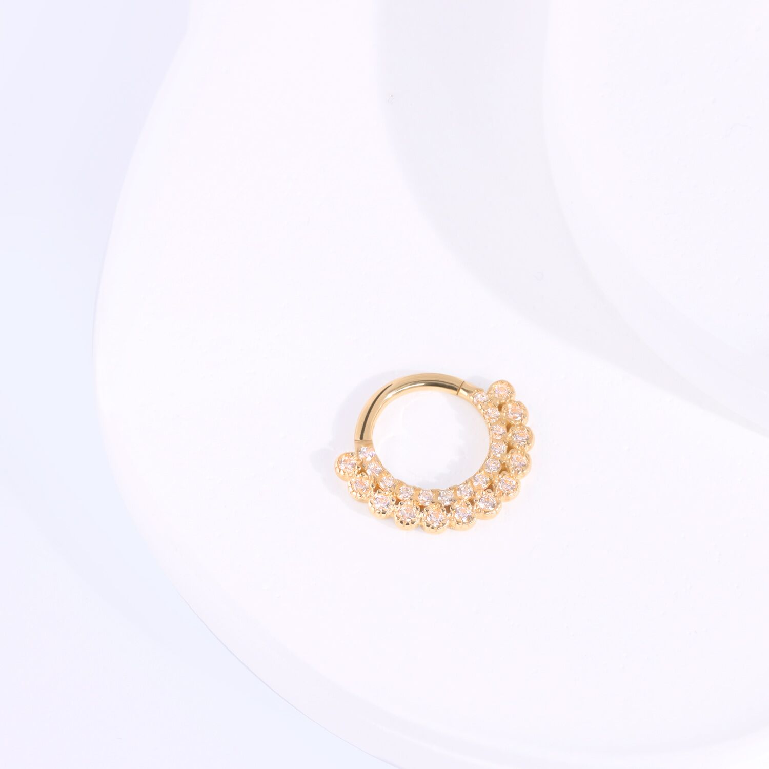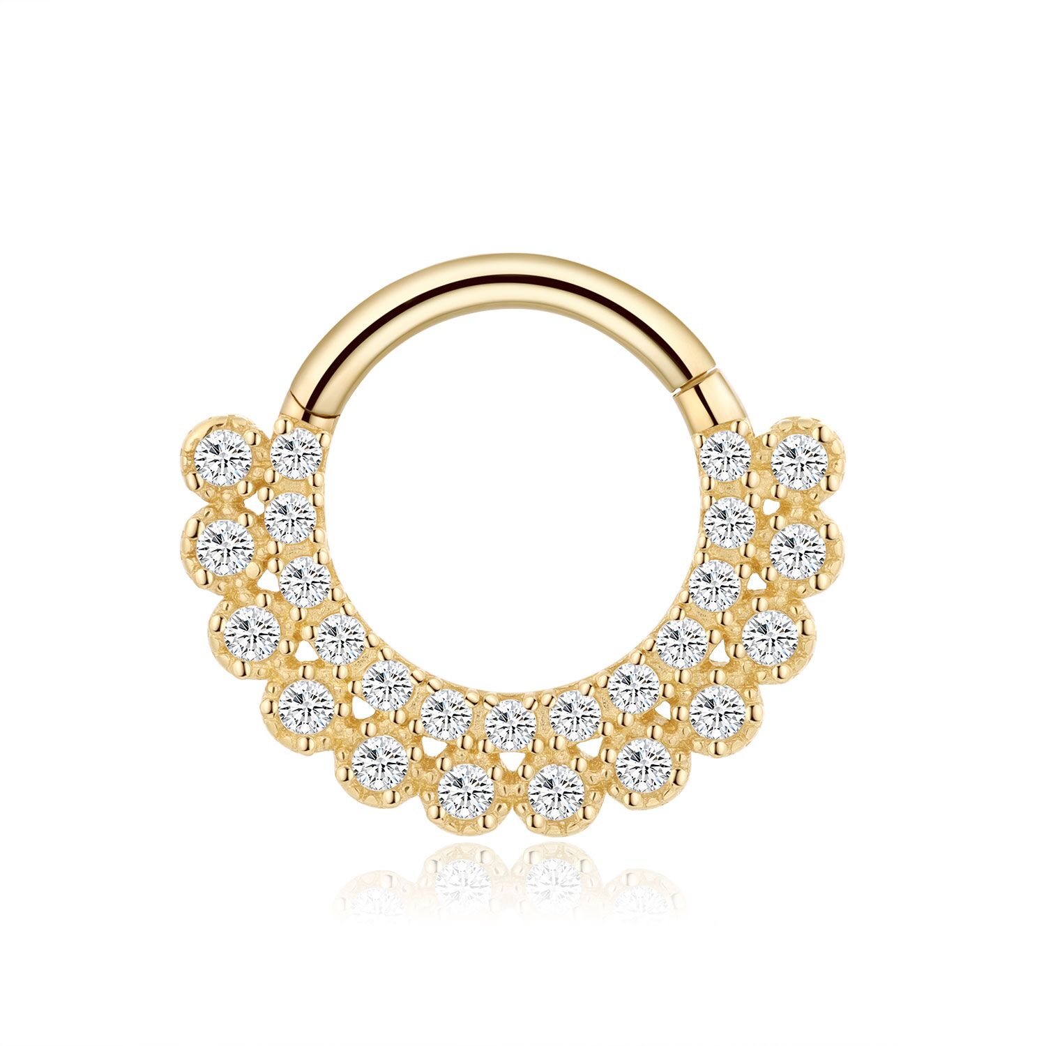 The KAV21G-1608 Hinged Segment Ring glimmers with luxury, featuring a halo of cubic zirconia set in polished 14k solid gold. A true statement of elegance.