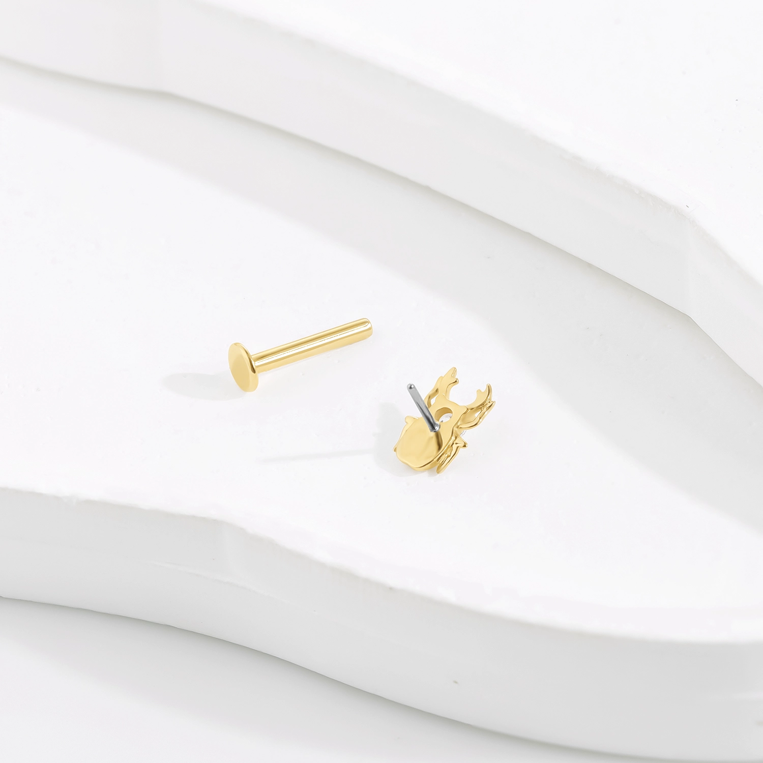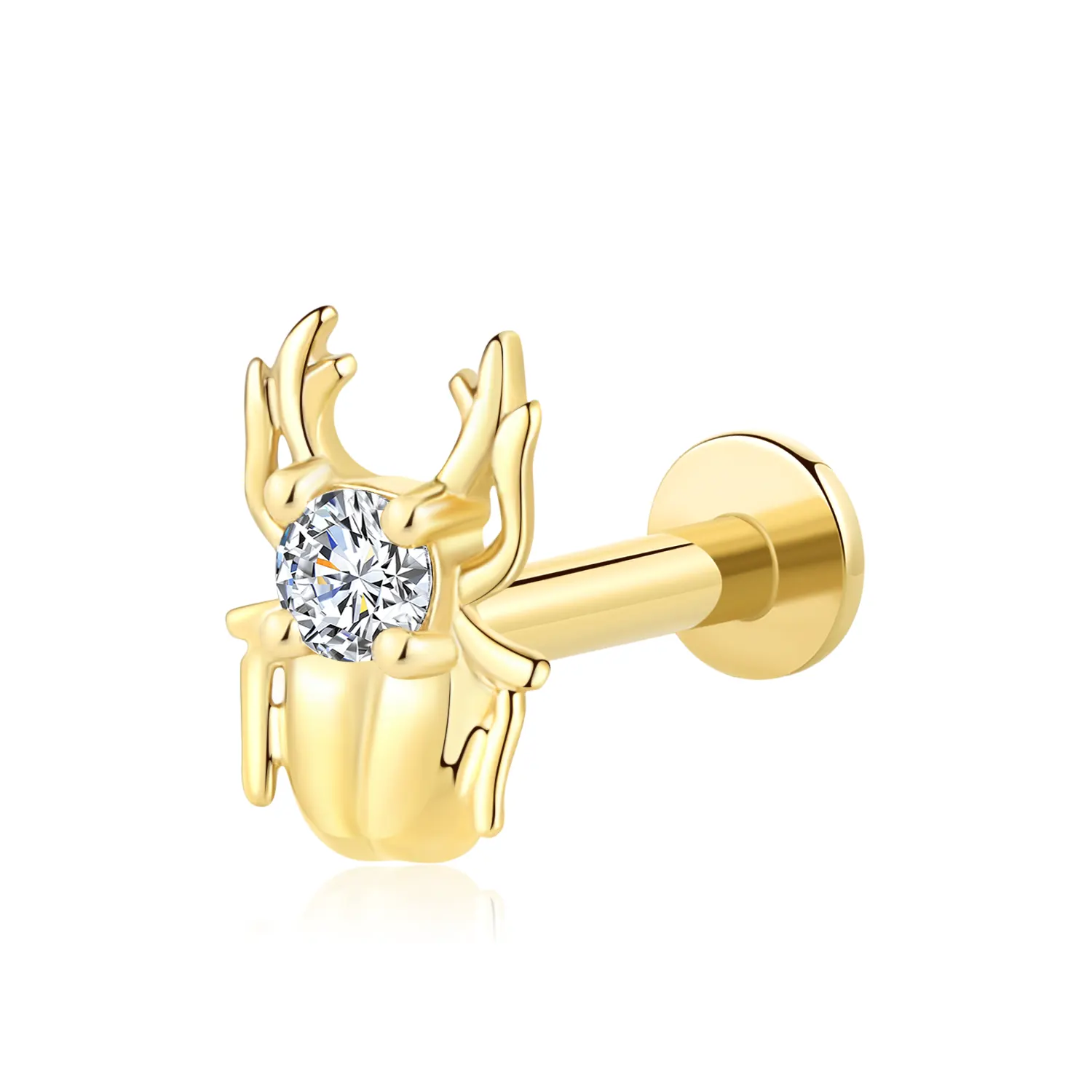 Introducing GUE40167G, a striking 14K solid gold threadless labret stud featuring a unique beetle design. This eye-catching piece of body jewelry is adorned with a brilliant cubic zirconia stone that adds a touch of sparkle to the intricate beetle motif. The threadless mechanism ensures a secure and comfortable fit, making it an excellent choice for those who appreciate both nature-inspired and luxurious piercing accessories.