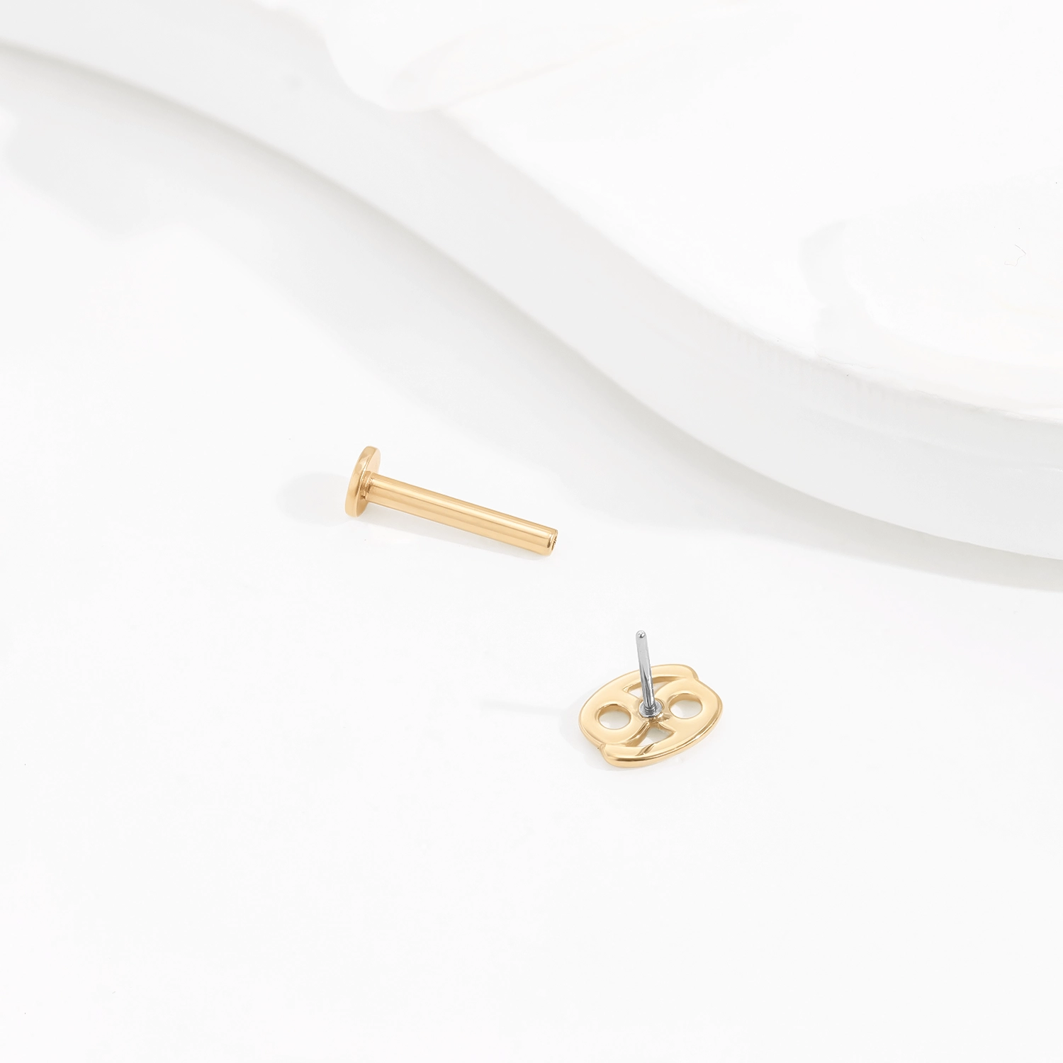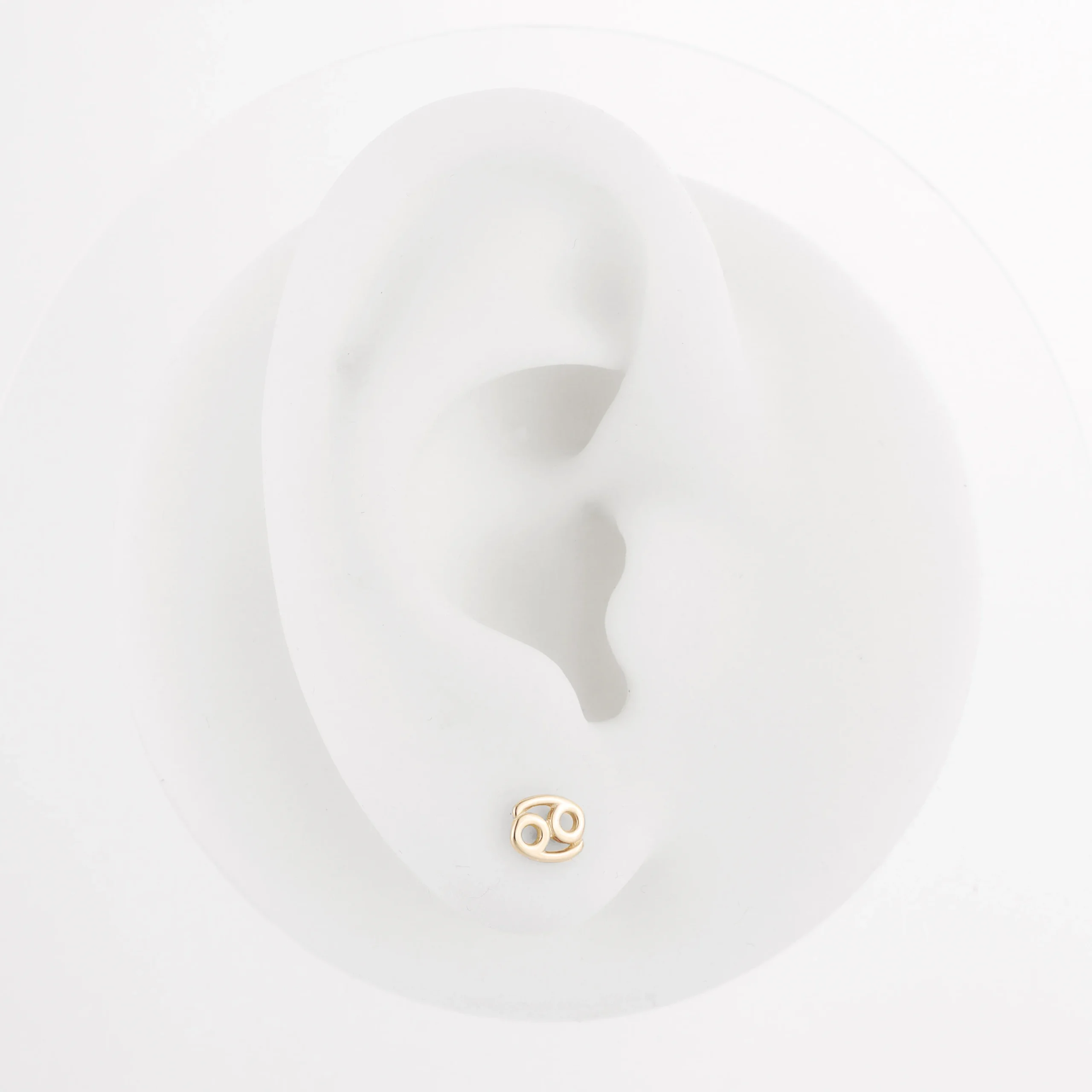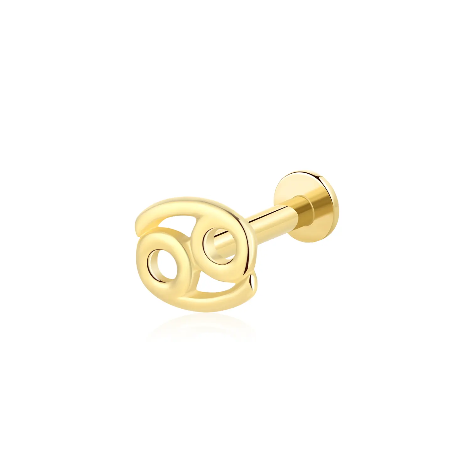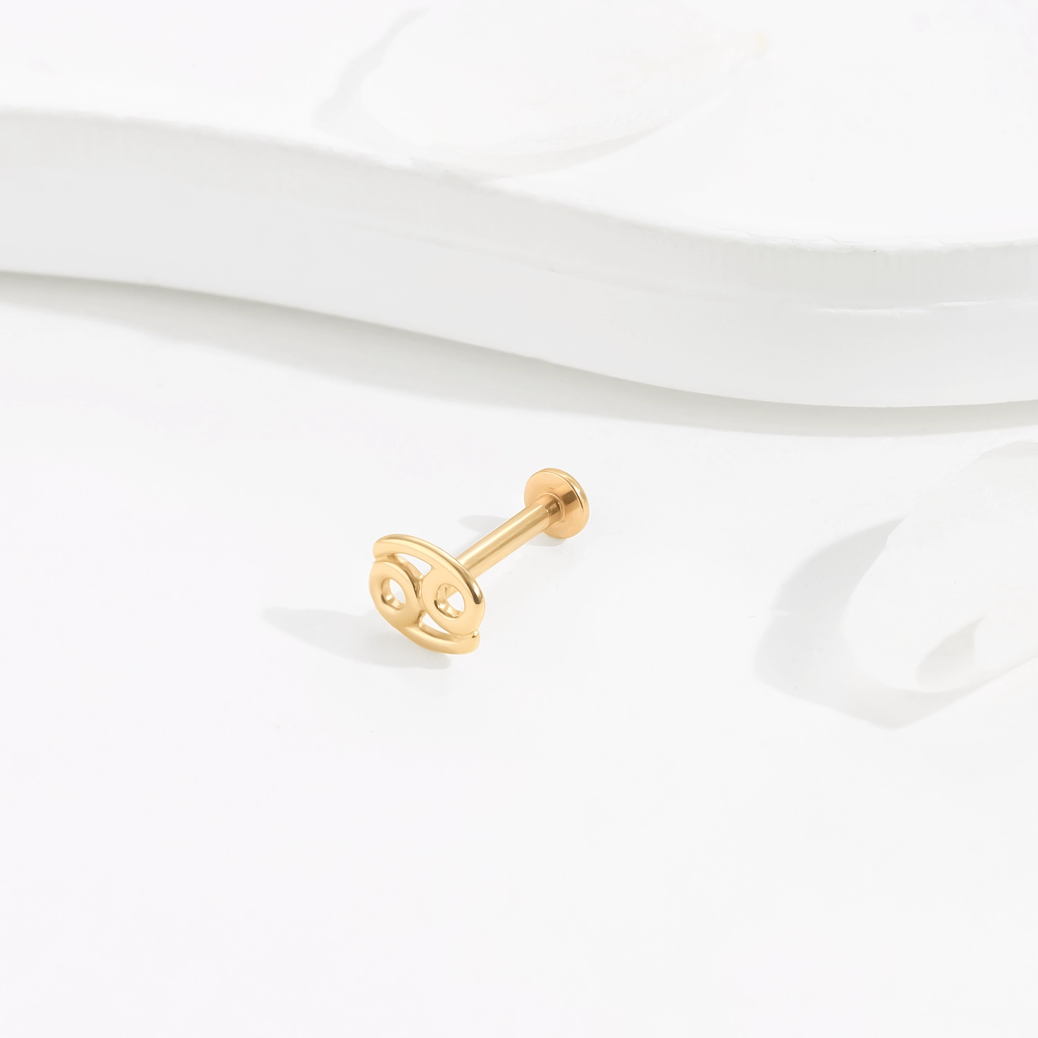 Introducing GU215G, a 14K solid gold threadless labret stud featuring the Cancer zodiac symbol. Representing intuition and emotion, this delicate piece is adorned with two sparkling CZ stones, seamlessly embedded in the astrological design. The steel push pin mechanism ensures a secure and comfortable fit, making it a perfect addition to your body jewelry collection.