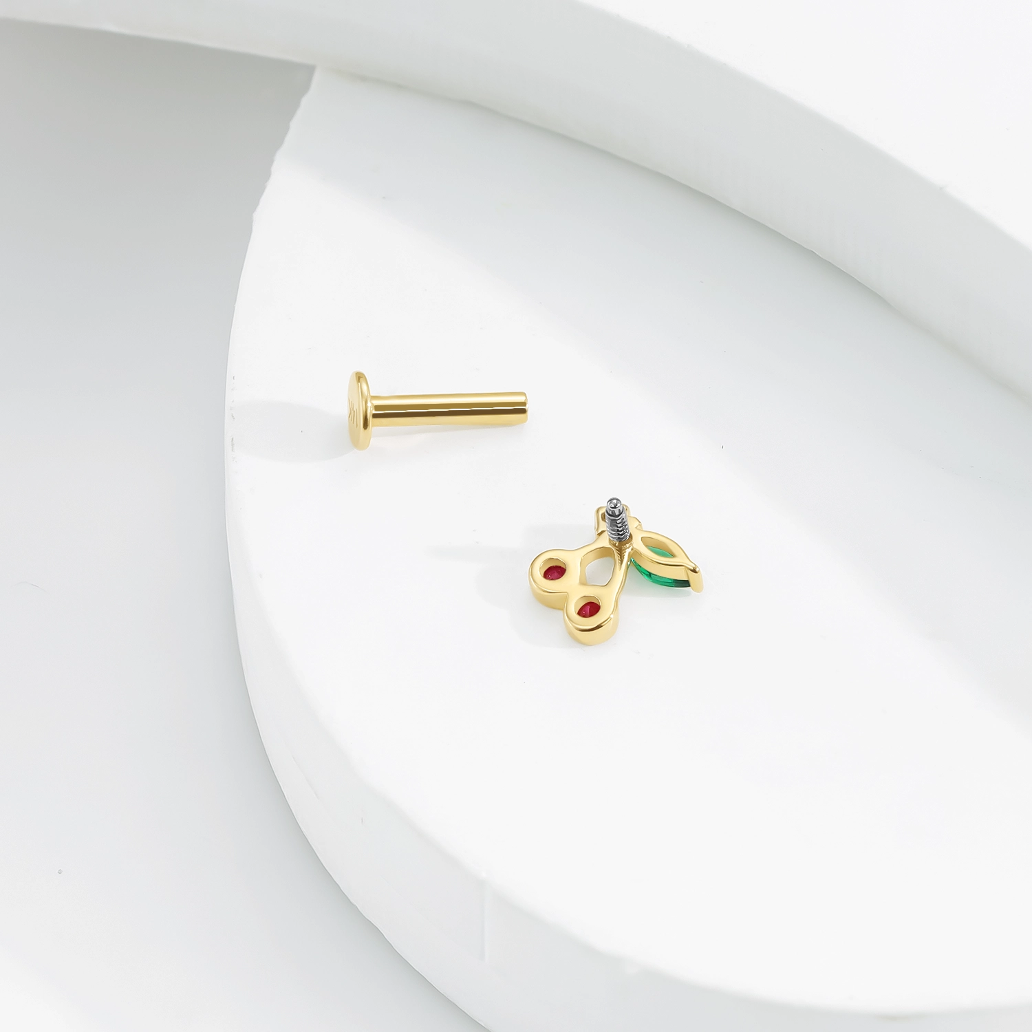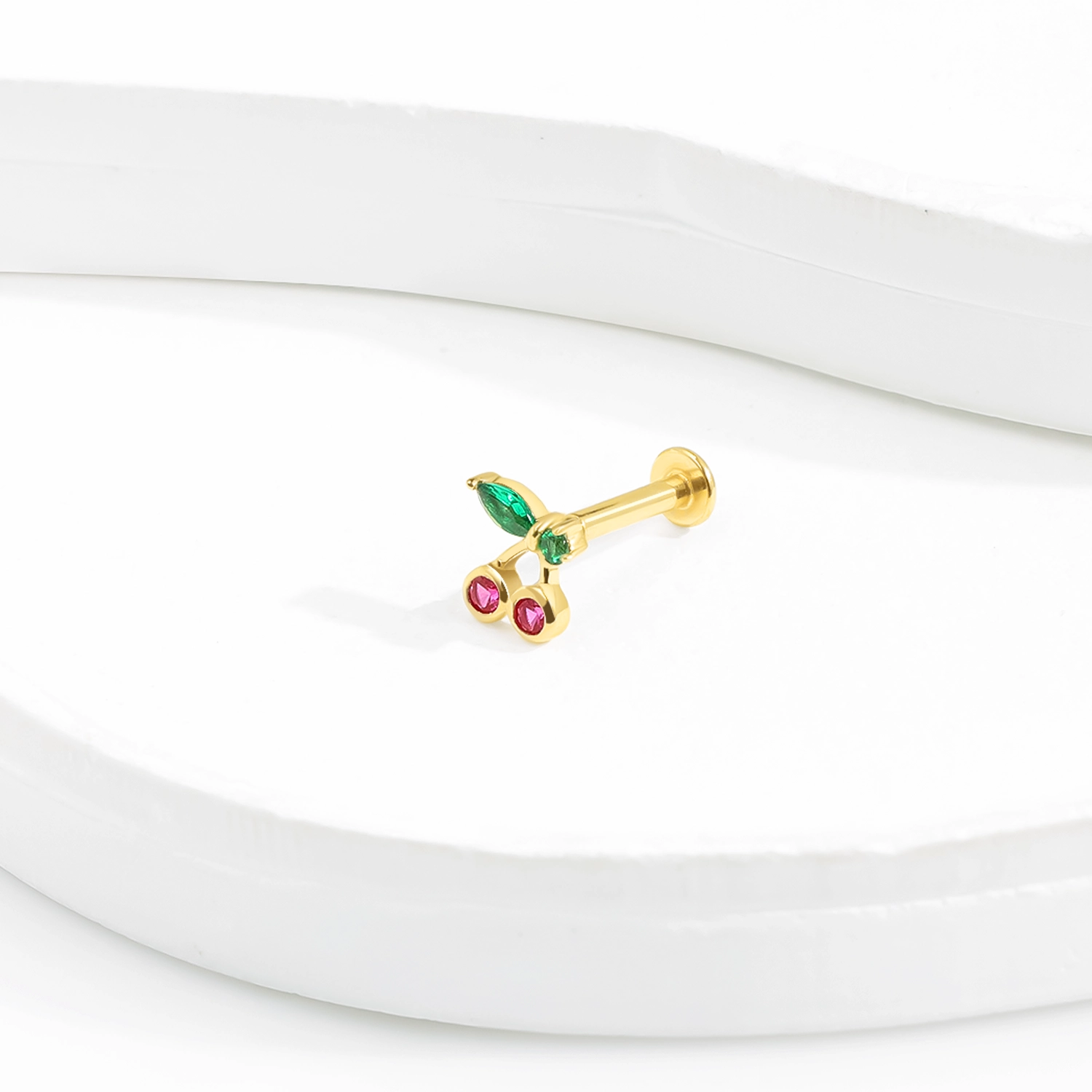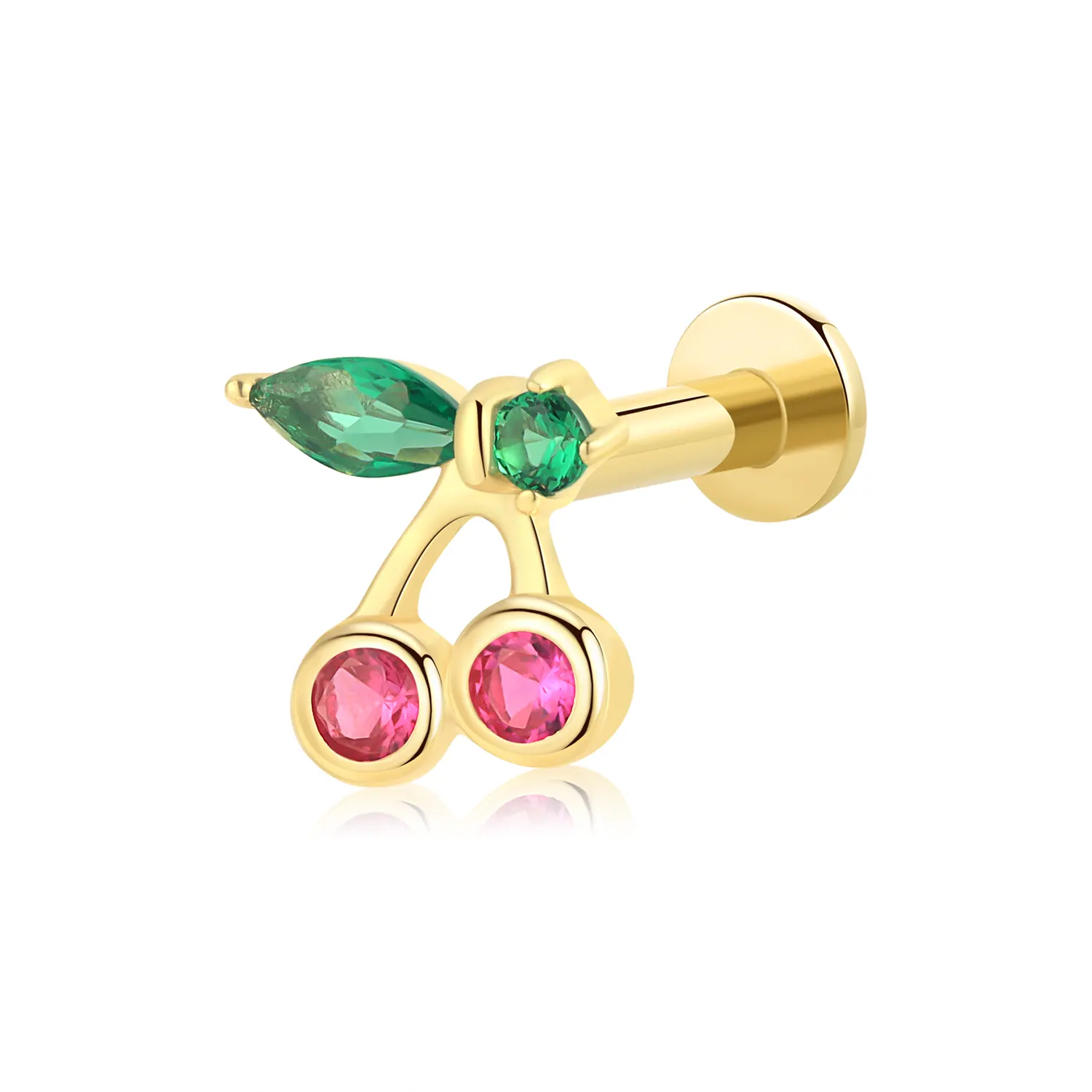 Introducing GVE40246G: This 14K solid gold internally threaded labret stud features a playful and vibrant cherry design, adorned with colorful CZ stones. The cherries are represented by two vivid pink round CZ stones, while the green CZ stones form the leaf and stem, creating a fresh and fun look. The internally threaded design ensures secure and comfortable wear, making it an ideal choice for anyone seeking a whimsical yet elegant addition to their body jewelry collection.