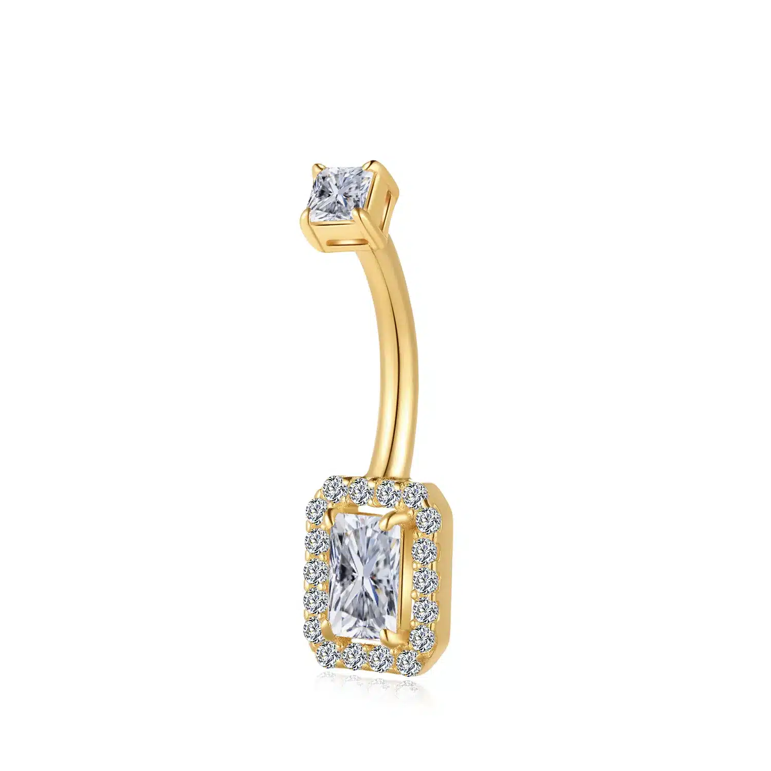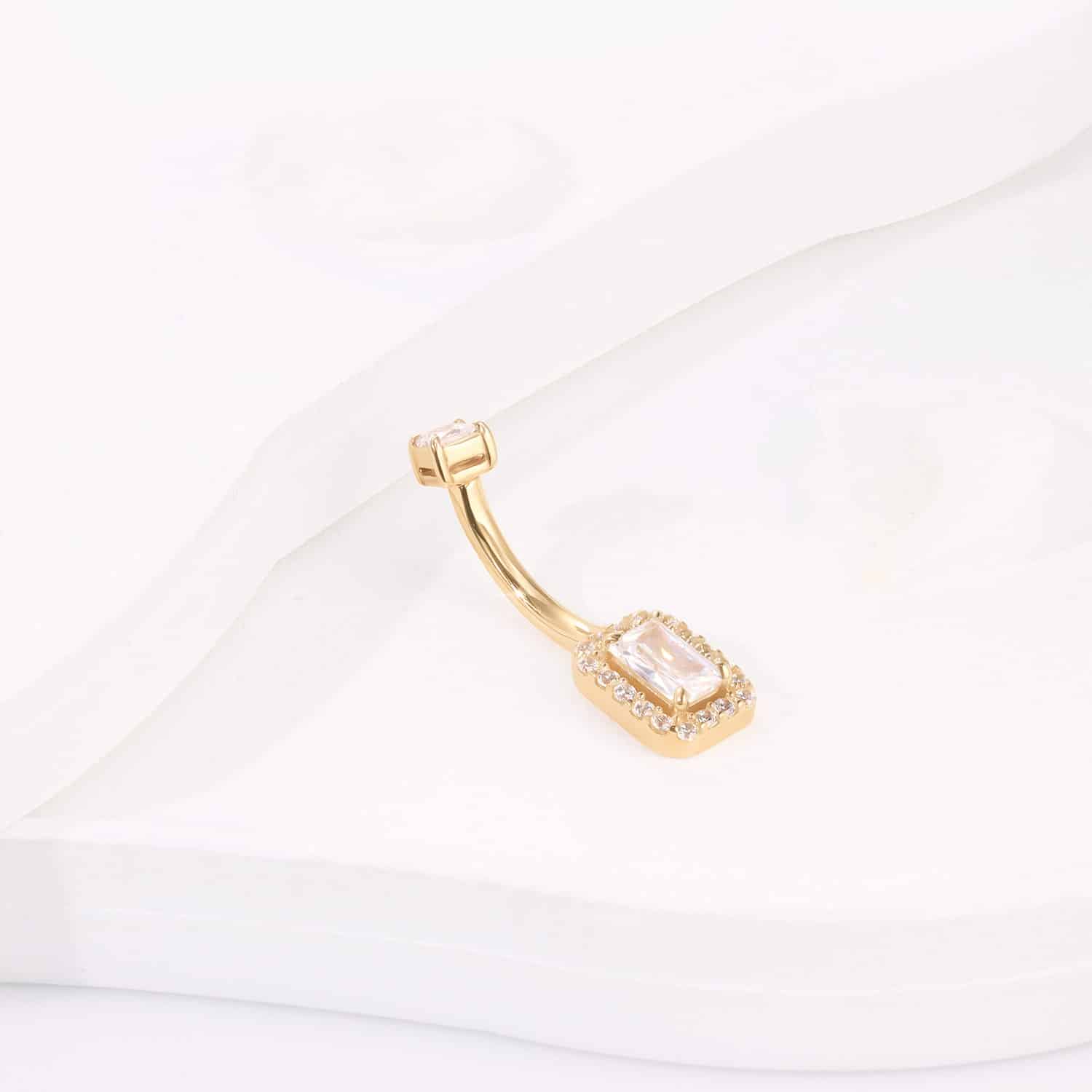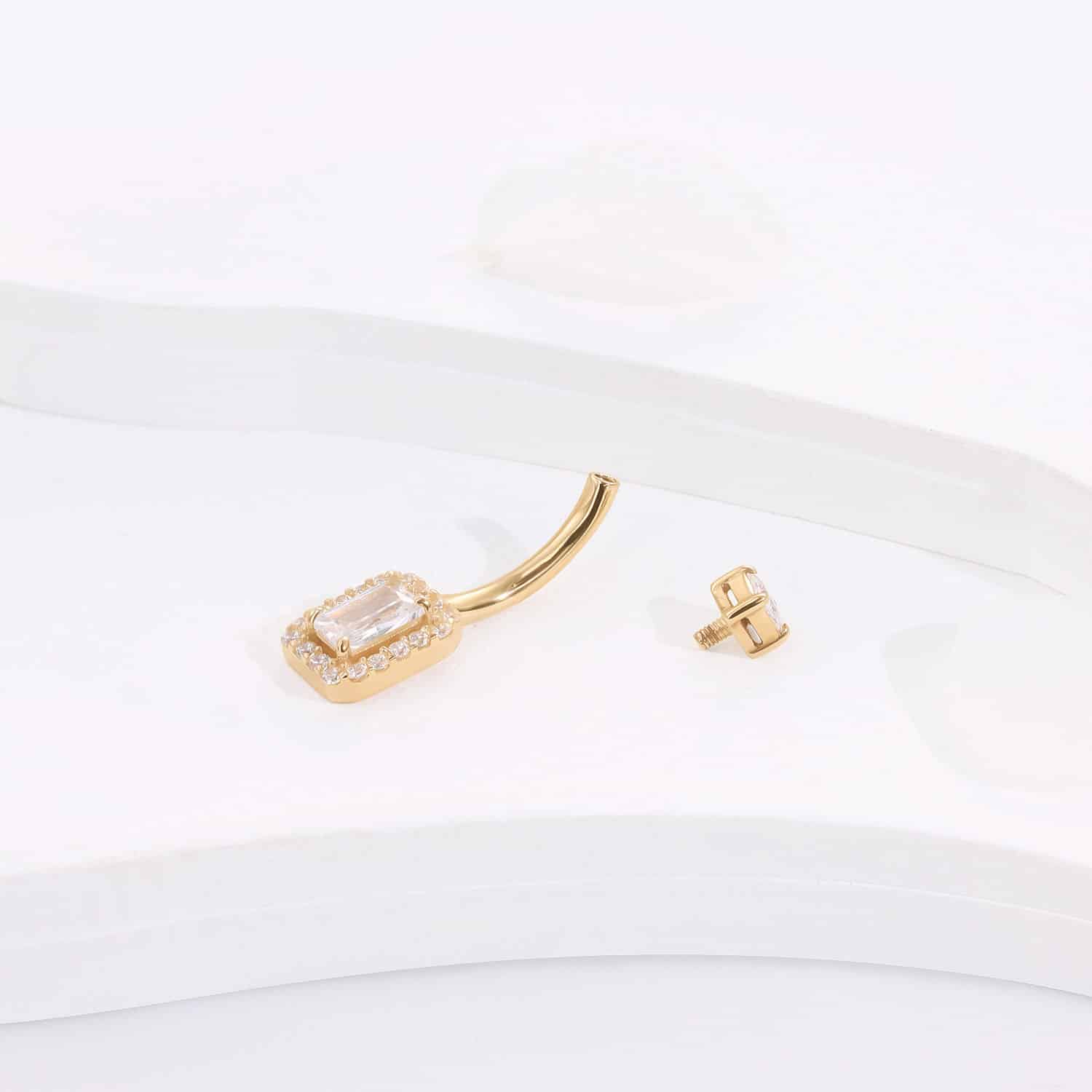 GW20G-1410, a 14K yellow gold internally threaded navel ring, is a vision of opulence with its dazzling cubic zircon. This exquisite piece brings a radiant sophistication to your collection.