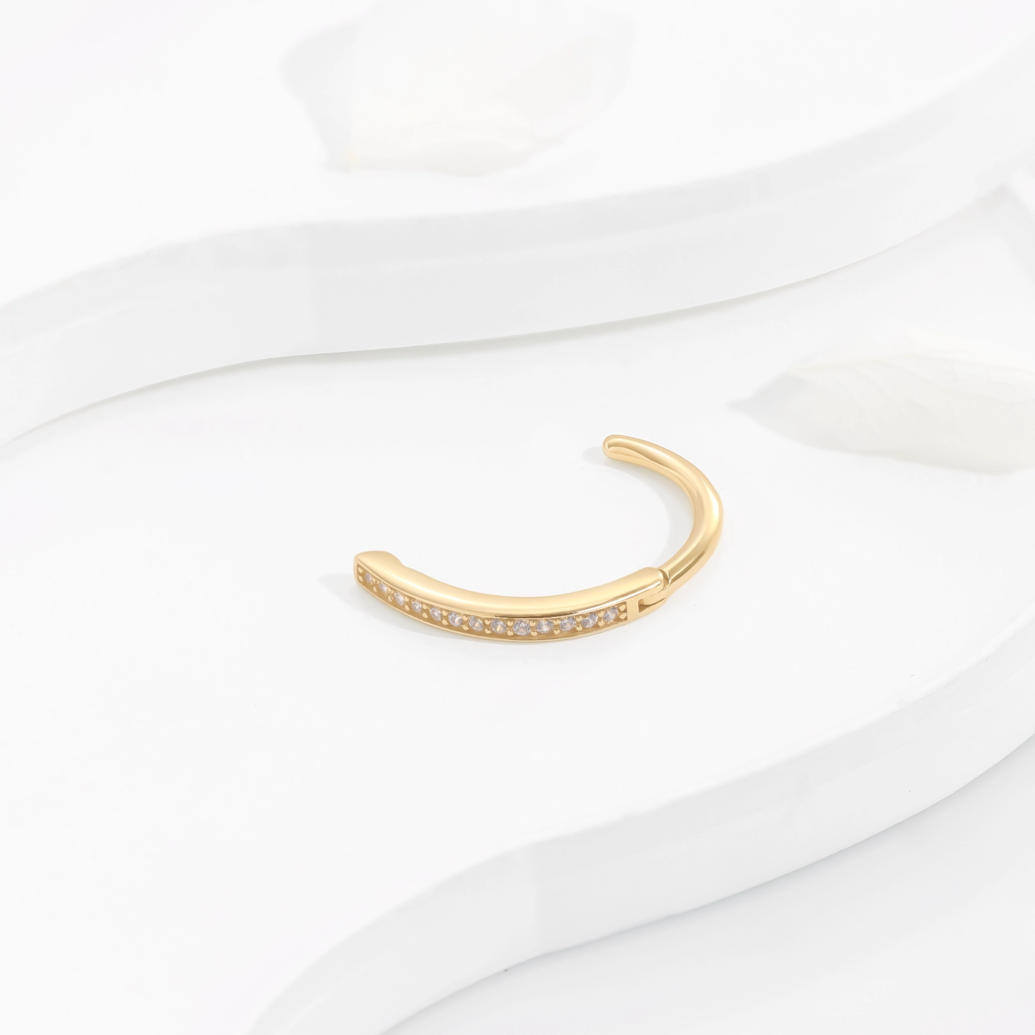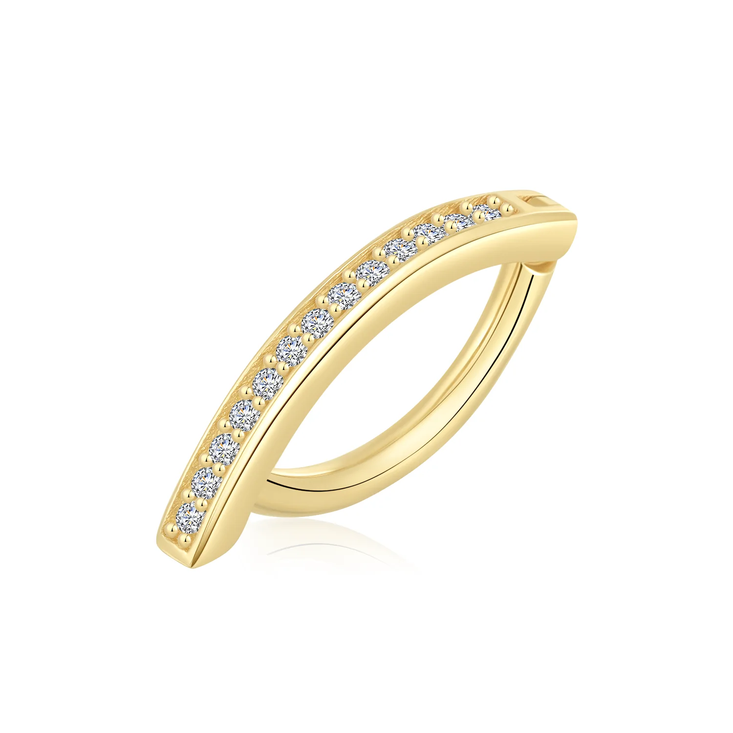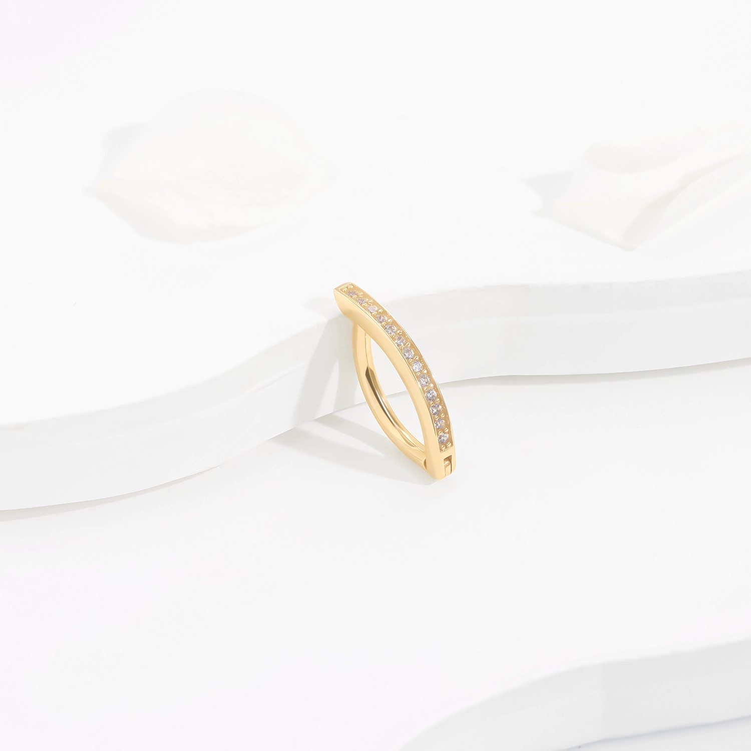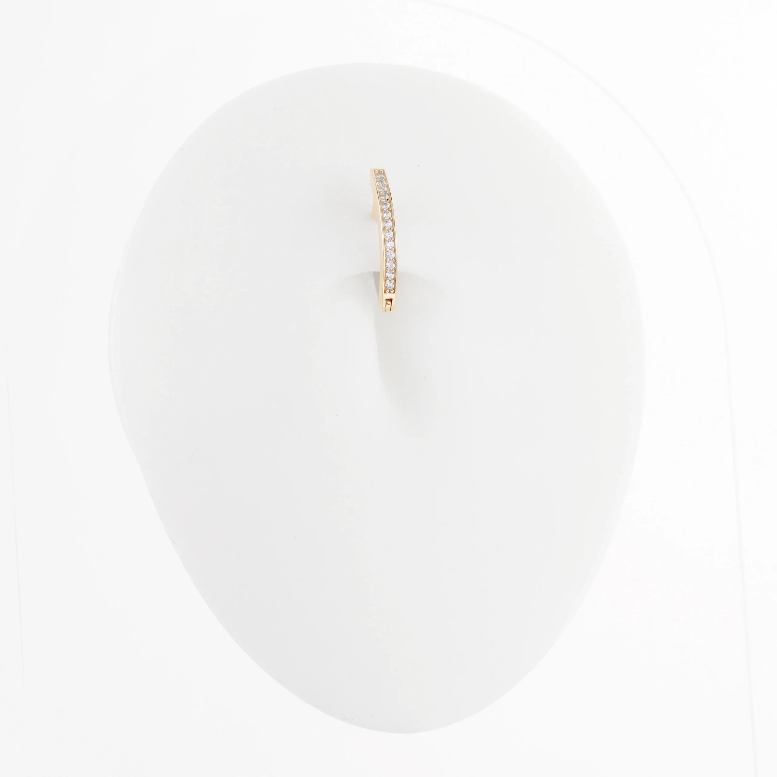 Discover GWX01G: A 14K solid gold hinged belly ring, elegantly set with clear CZ stones in a smooth, curved design for timeless allure. 1.6*10mm