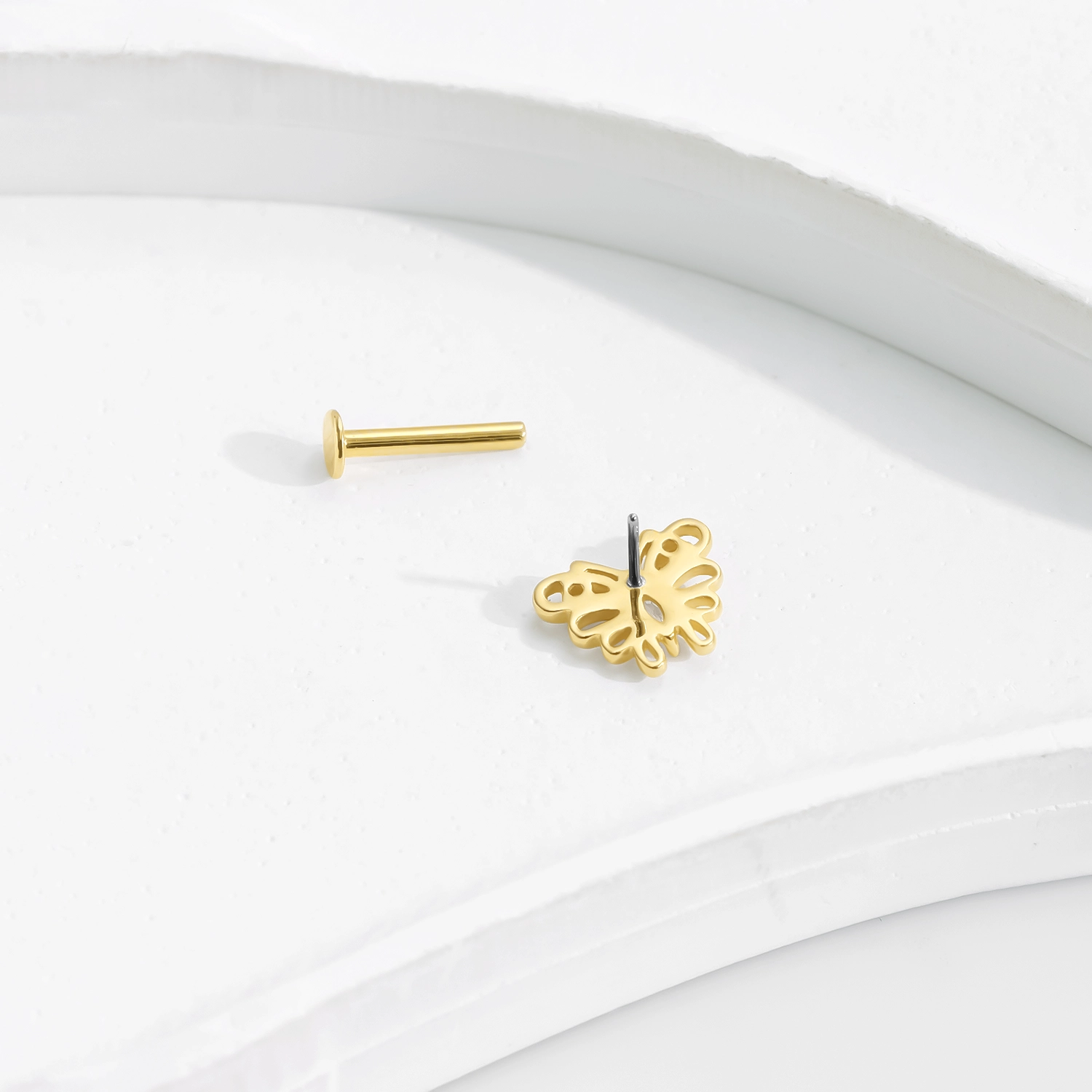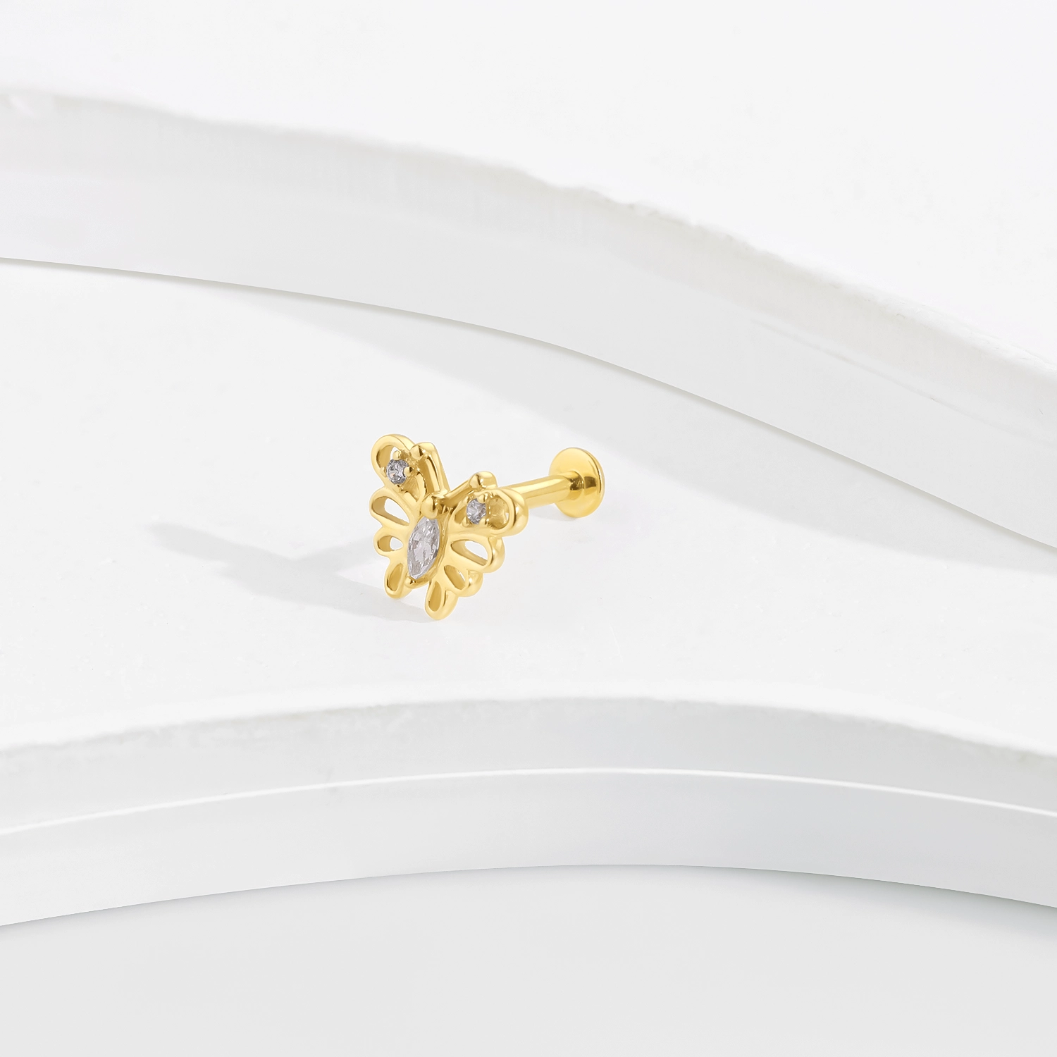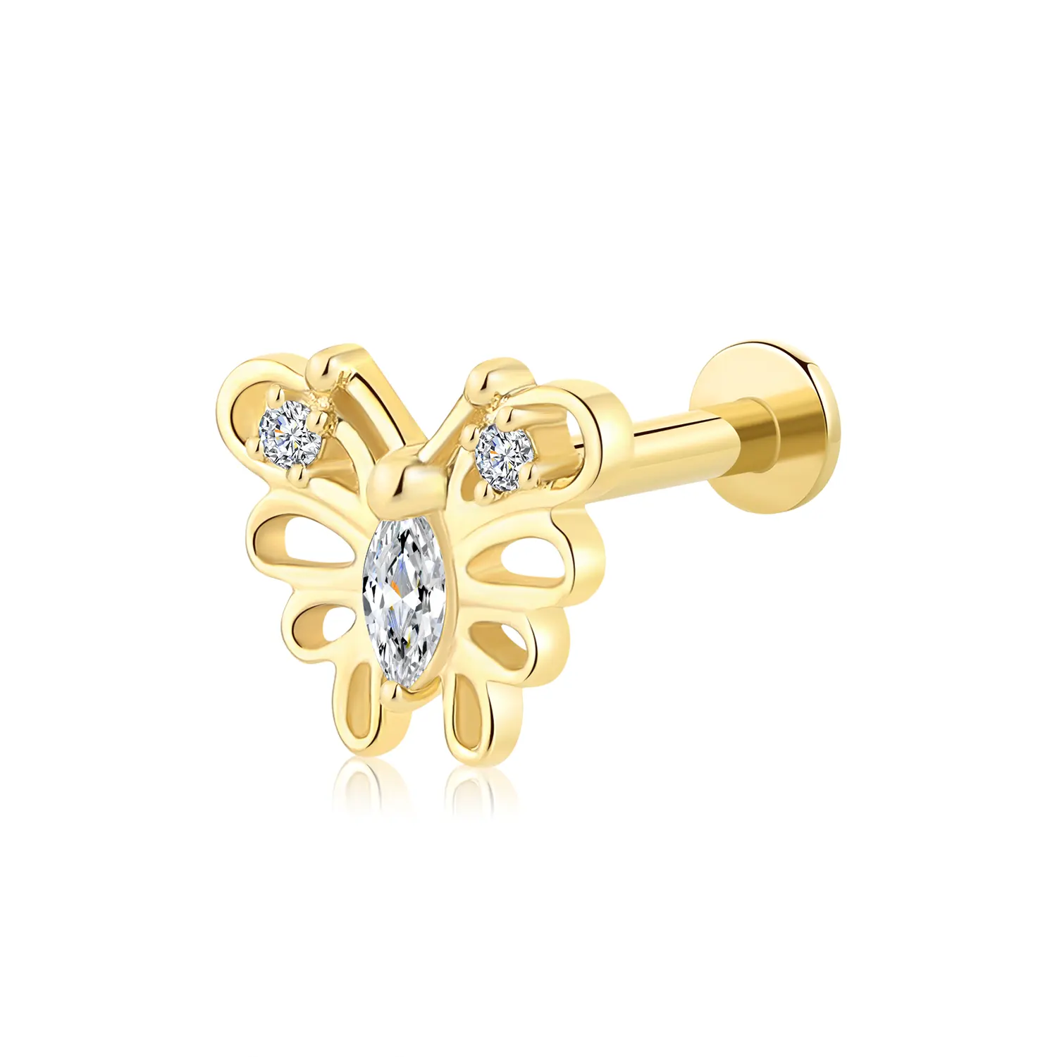 Introducing GUE31276G, a delicate 14K solid gold threadless labret stud featuring an elegant hollow butterfly design. This exquisite piece of body jewelry is adorned with sparkling cubic zirconia stones, adding a touch of brilliance to the intricate butterfly motif. The threadless mechanism ensures a secure and comfortable fit, making it a perfect accessory for those who appreciate the beauty of nature and fine craftsmanship.