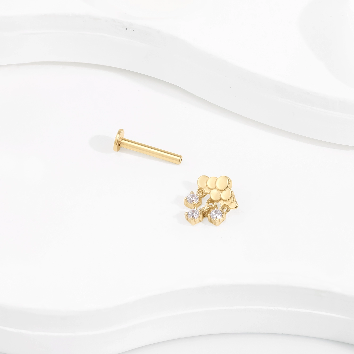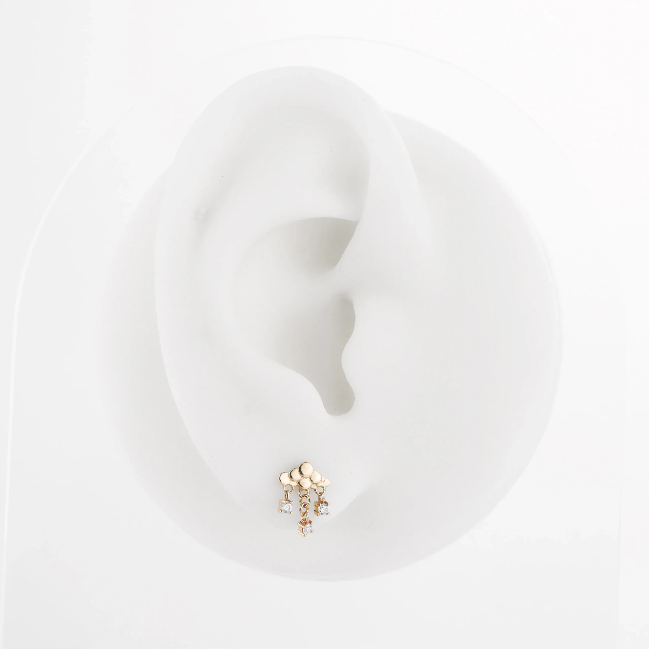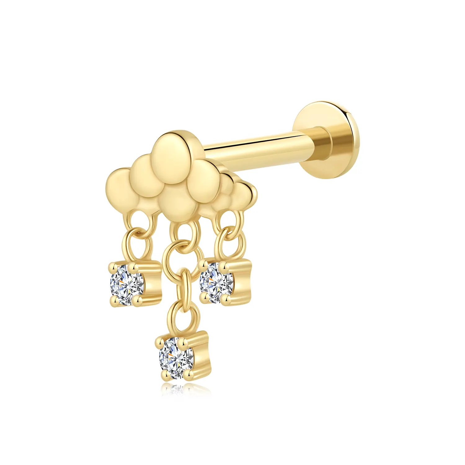Discover GV229G: A 14K Solid Gold Cloud-shaped Internally Threaded Labret Stud with dangling CZ stones, capturing the playful essence of a cloudy sky. 0.9mm thread