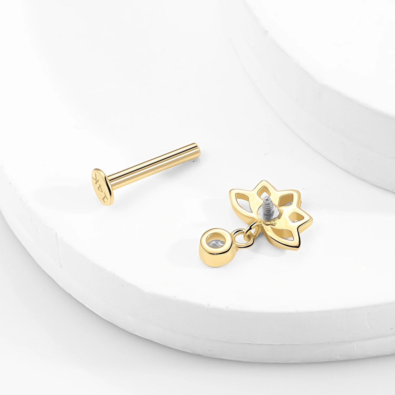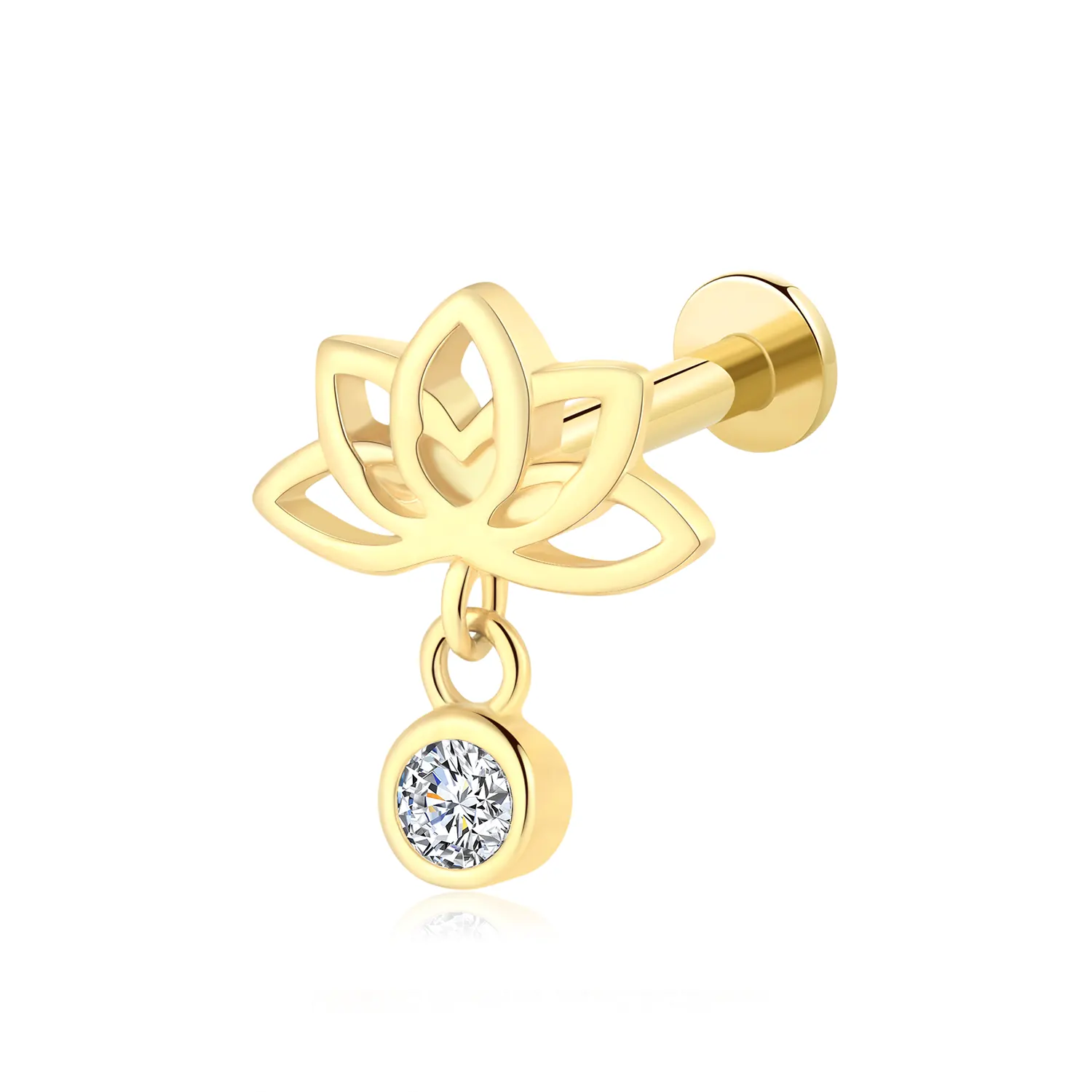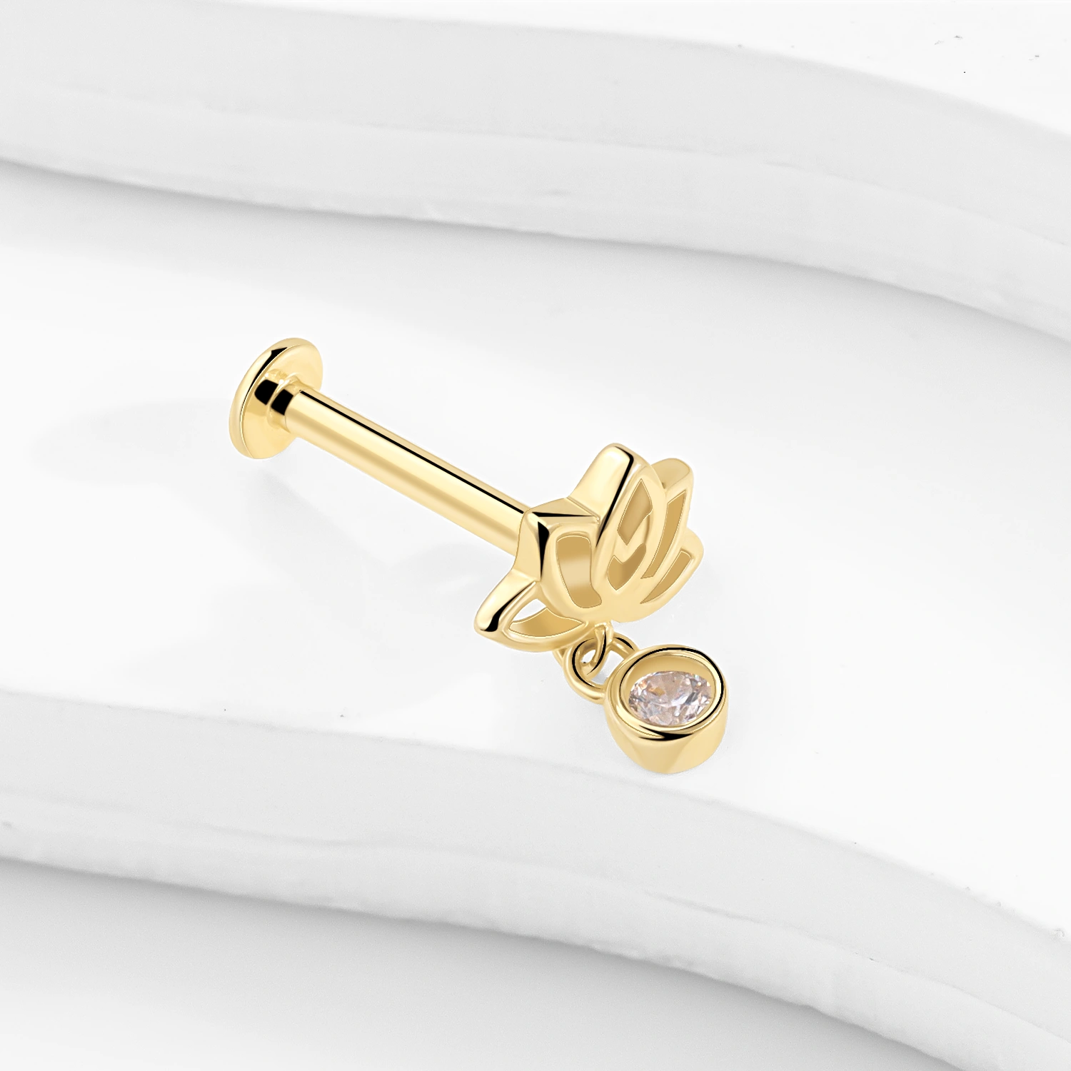 Introducing GV209G-CL – A graceful 14K solid gold internally threaded labret stud featuring a stylized openwork lotus flower and a single dangling round CZ. A perfect blend of tranquility and sparkle.