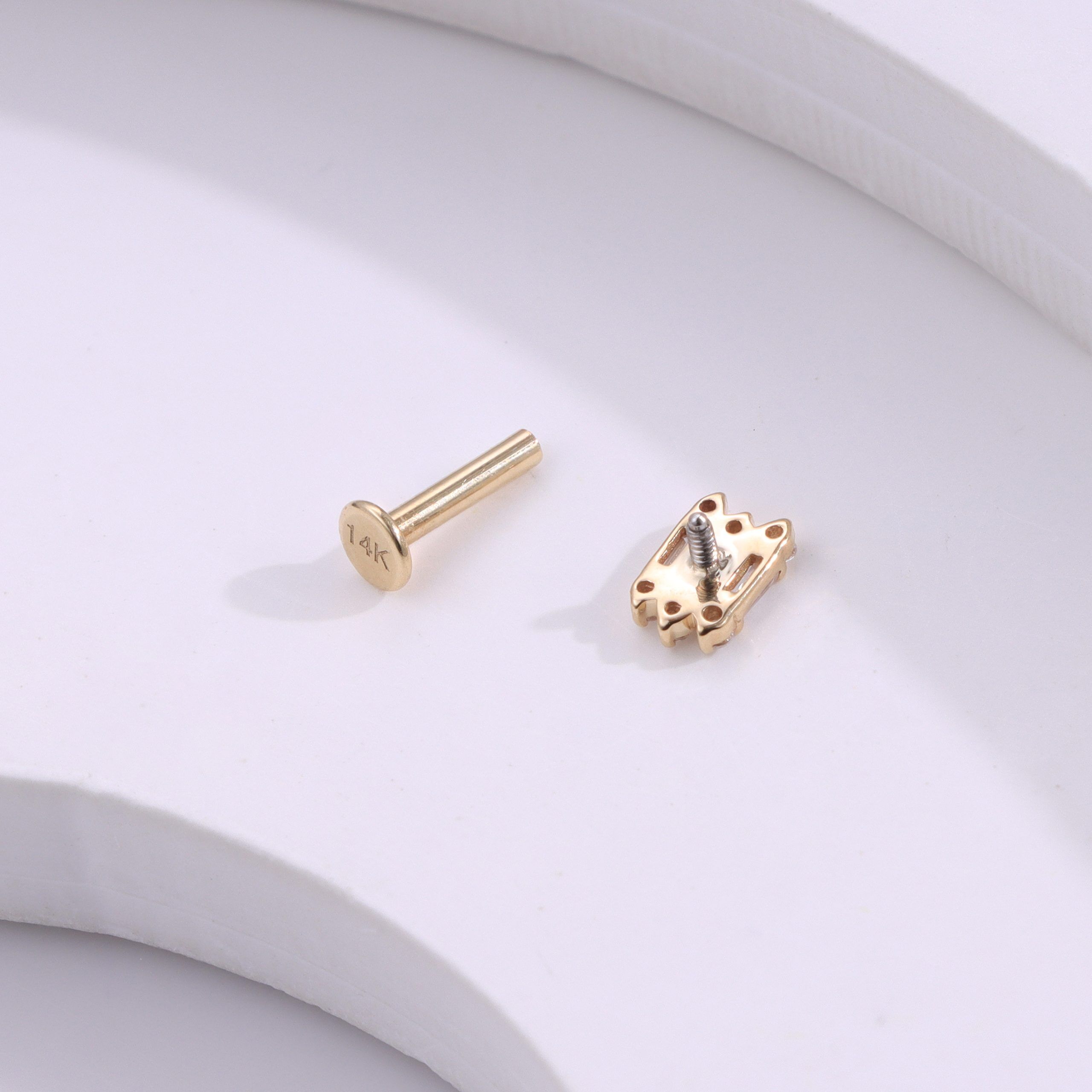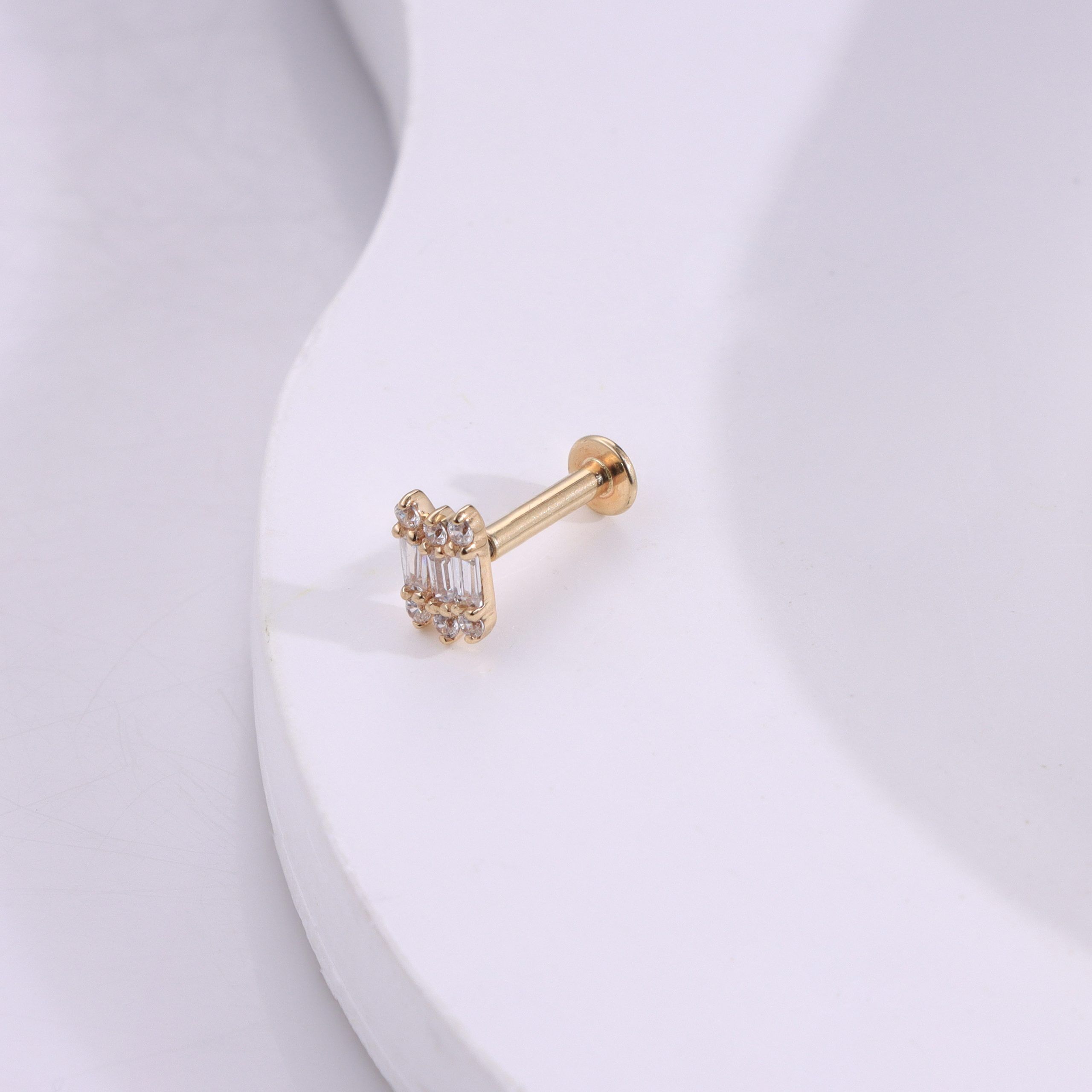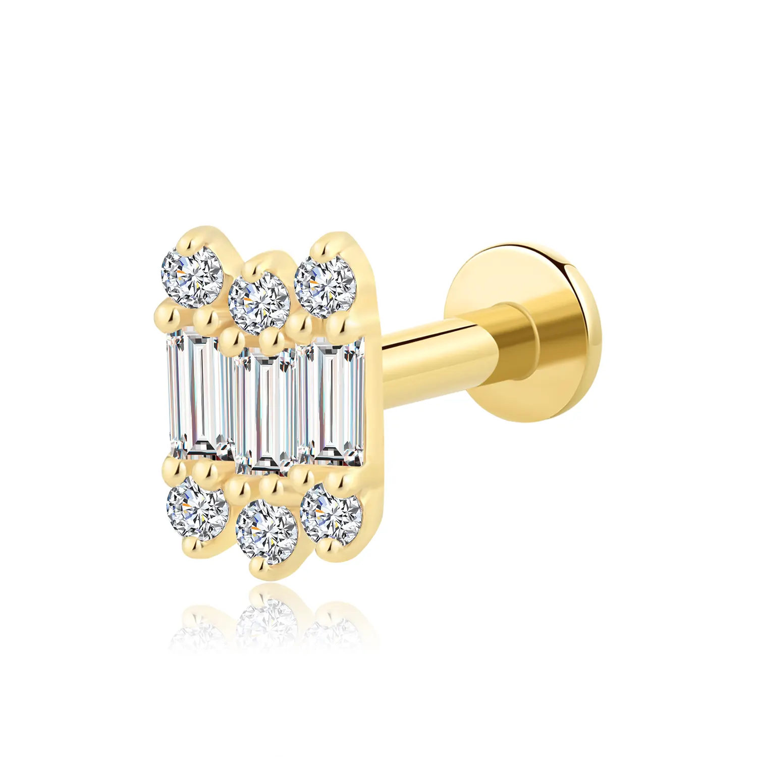 Introducing model GVE40371G, this 14K solid gold internally threaded labret stud features brilliant CZ baguette and round stones for a refined sparkle in your body piercing collection.