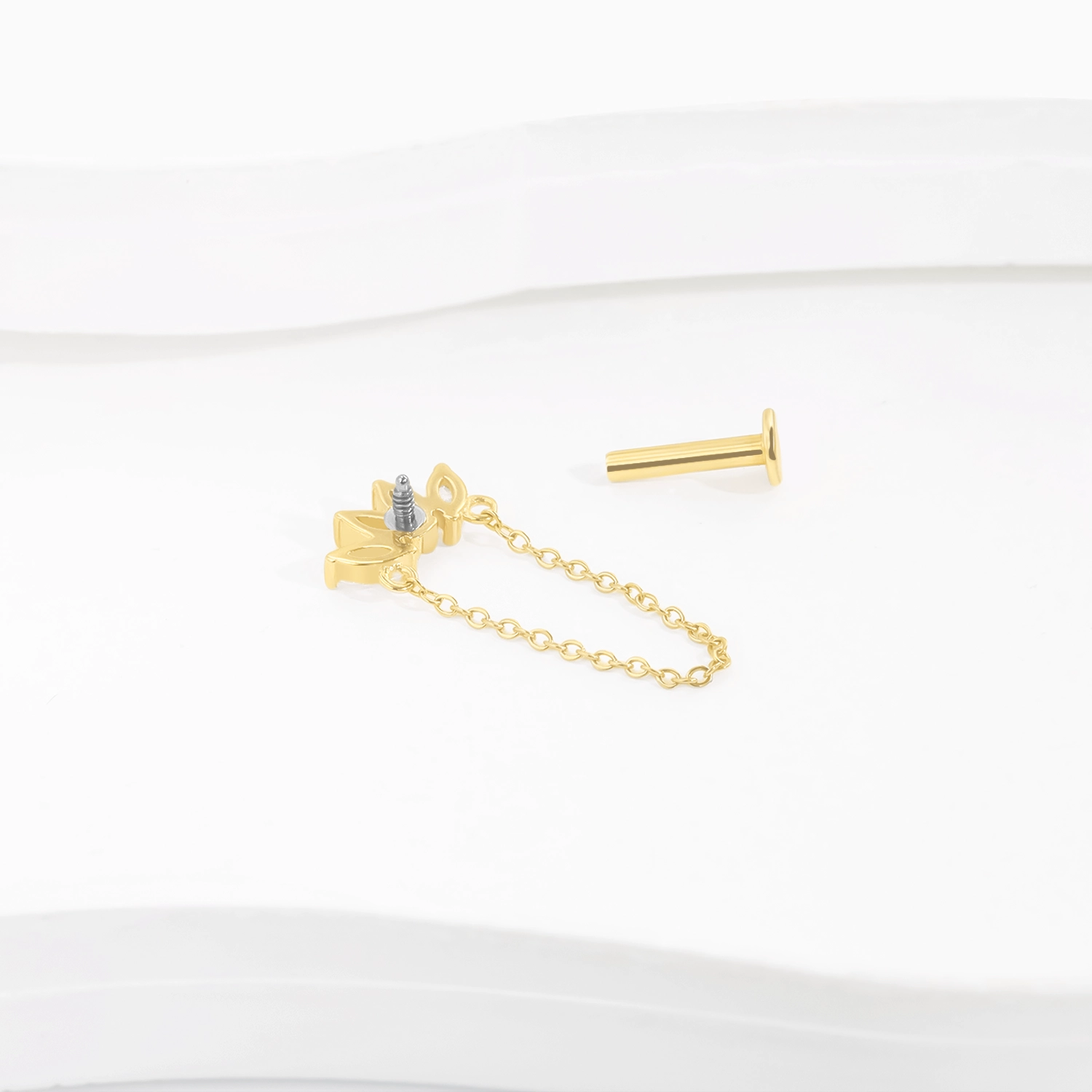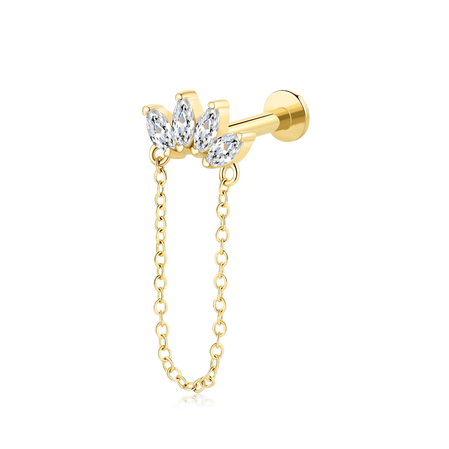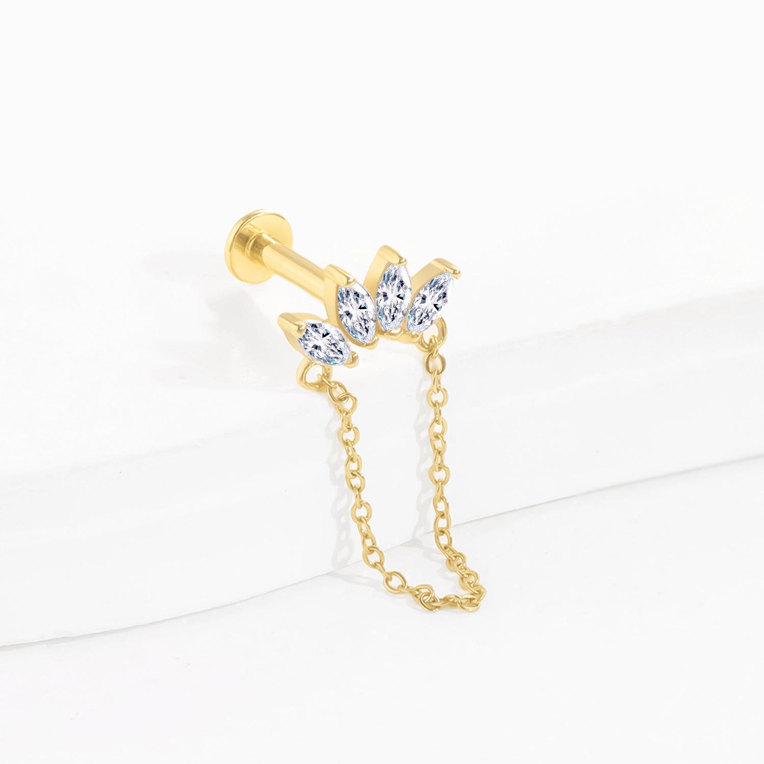 Introducing GV04G: A 14K solid gold internally threaded labret stud featuring four marquise CZ stones and an elegant chain. This sophisticated and secure piece is perfect for any body piercing enthusiast seeking a blend of luxury and style.