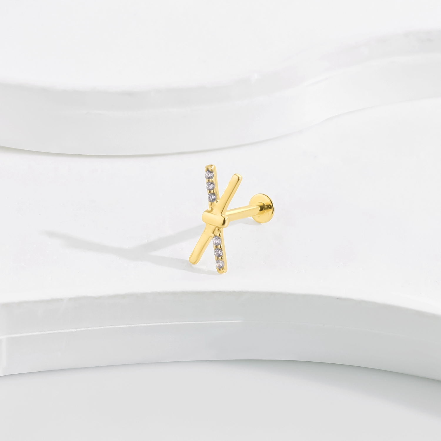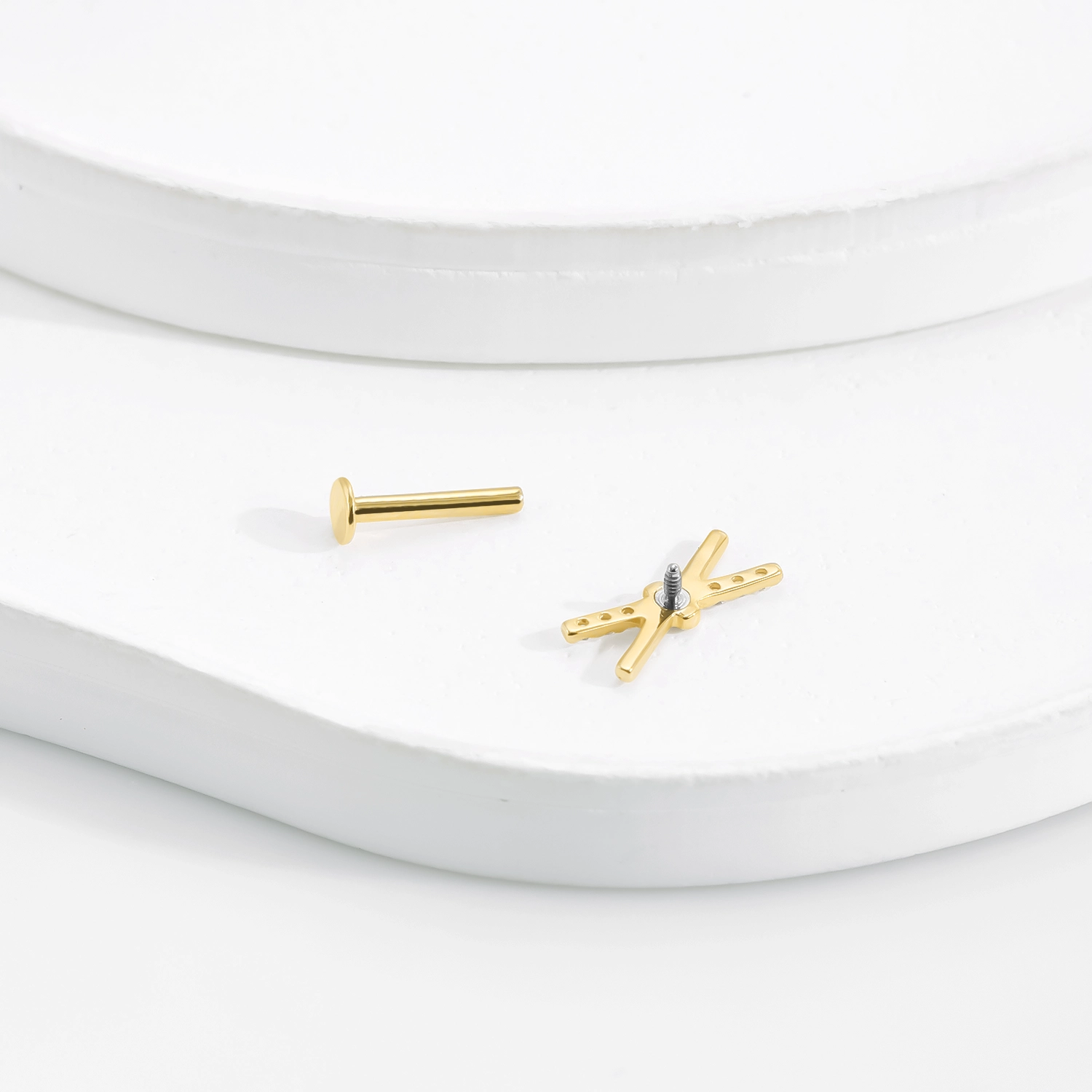 Introducing GVE4033G, a sleek 14K solid gold internally threaded labret stud featuring a minimalist design with six sparkling CZ stones. This elegant piece of body jewelry combines the timeless beauty of gold with the brilliance of cubic zirconia, making it an ideal accessory for those who appreciate both sophistication and simplicity.