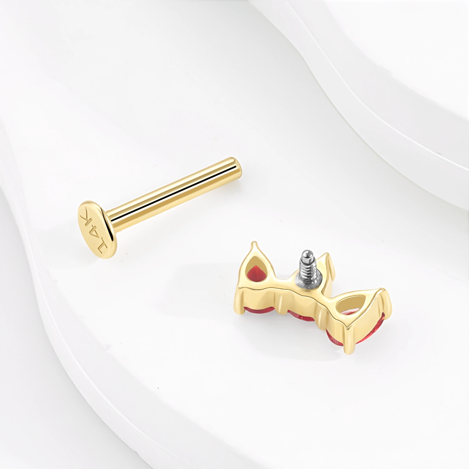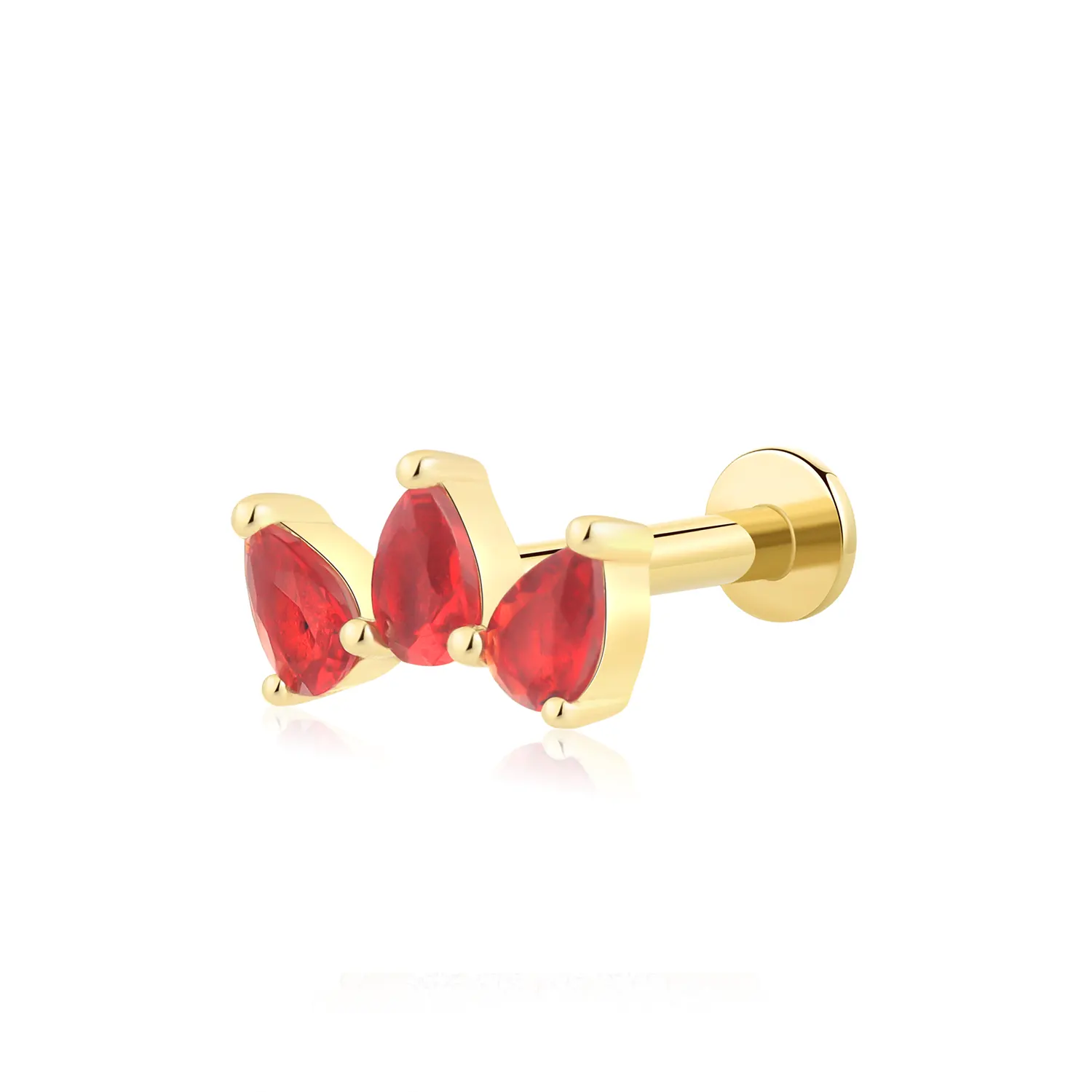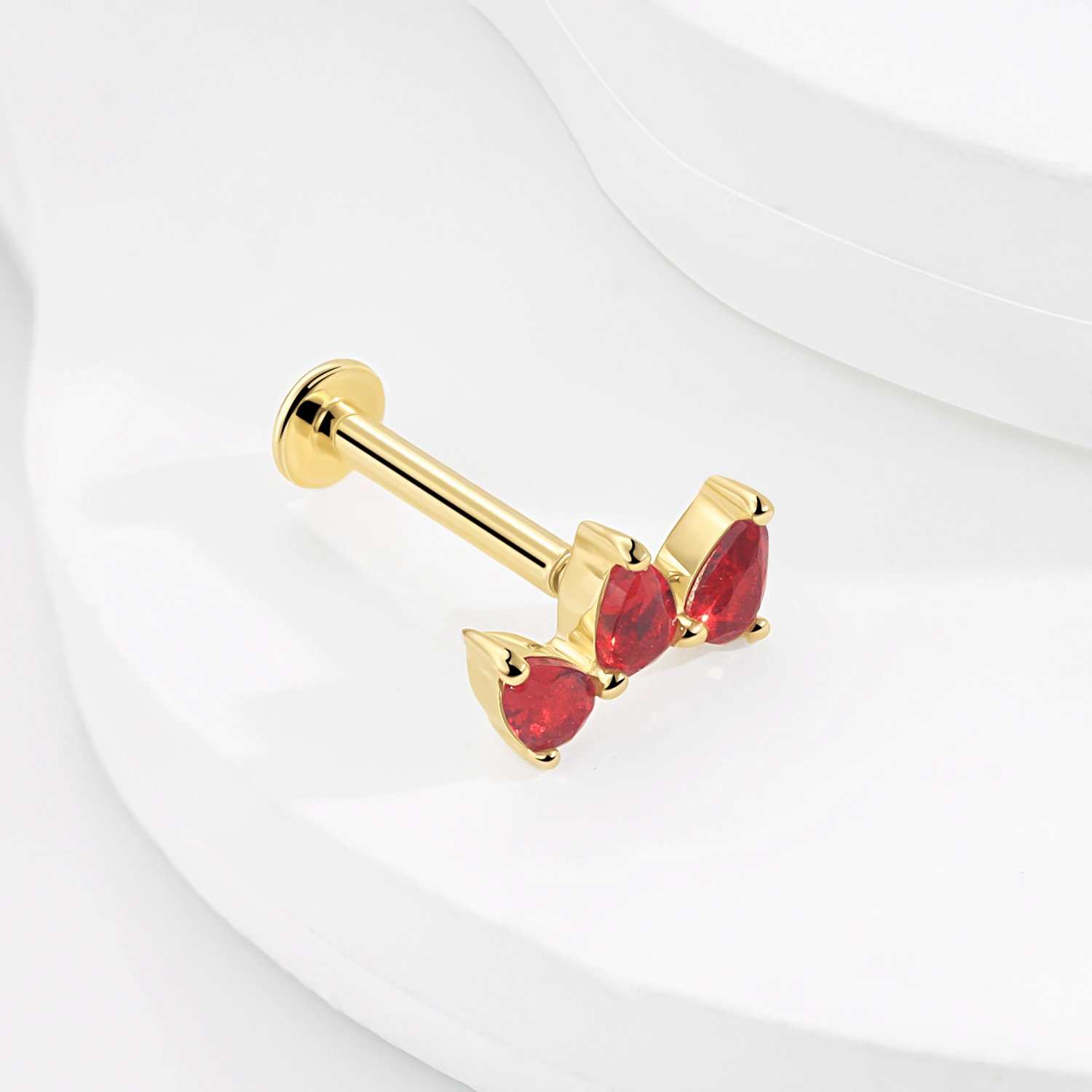 Introducing GV40443G-RD16: This 14K solid gold internally threaded labret stud features three fiery red, pear-shaped CZ stones. A dramatic yet elegant addition to any body piercing look.