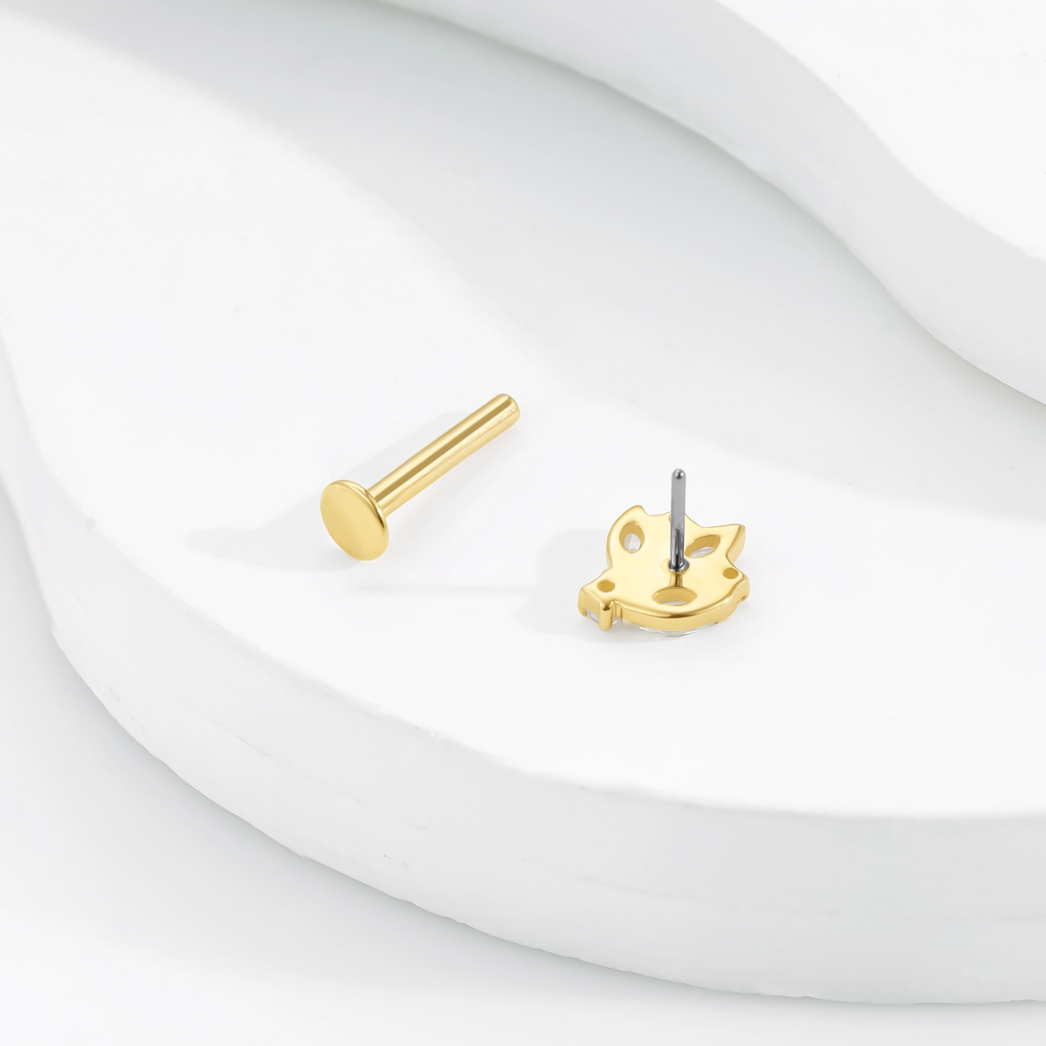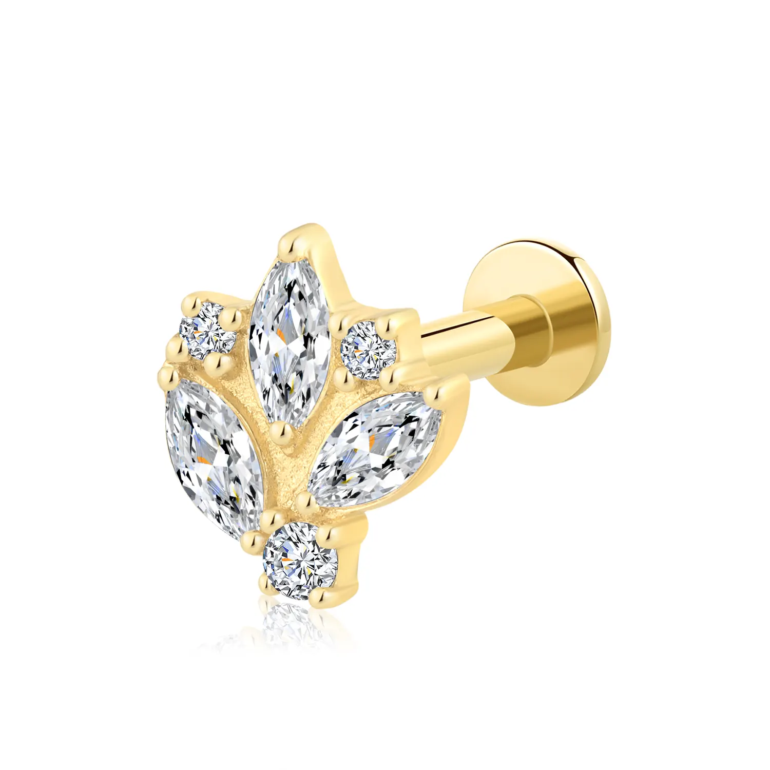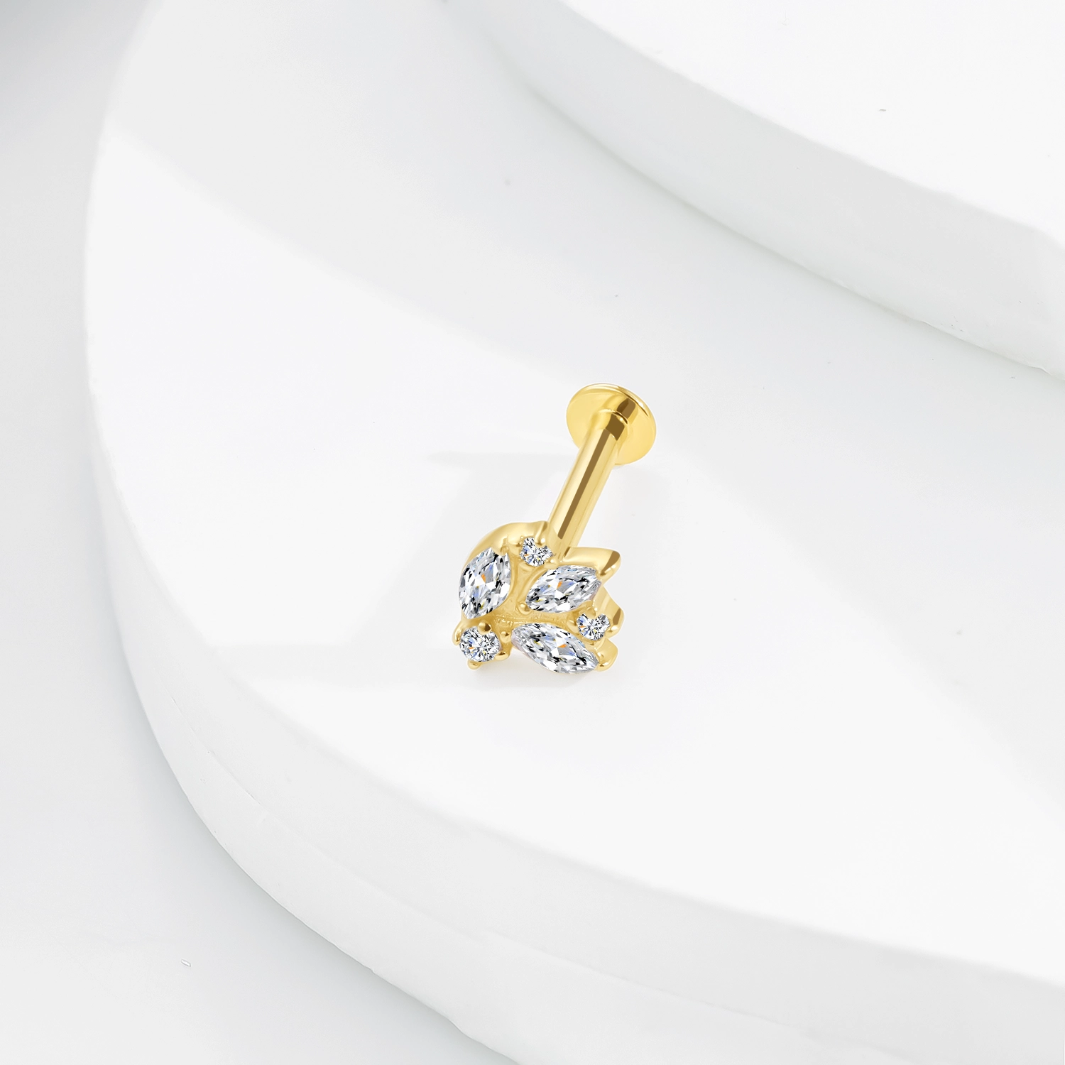 Introducing GUE4048G: This 14K solid gold threadless labret stud showcases an intricate leaf cluster design, featuring three marquise-cut CZ stones arranged in a delicate pattern. Accentuated by smaller round CZ stones, the overall shape resembles a blossoming leaf or floral bud, giving the piece a natural and elegant feel. The steel push pin ensures secure and comfortable wear, perfect for any piercing.