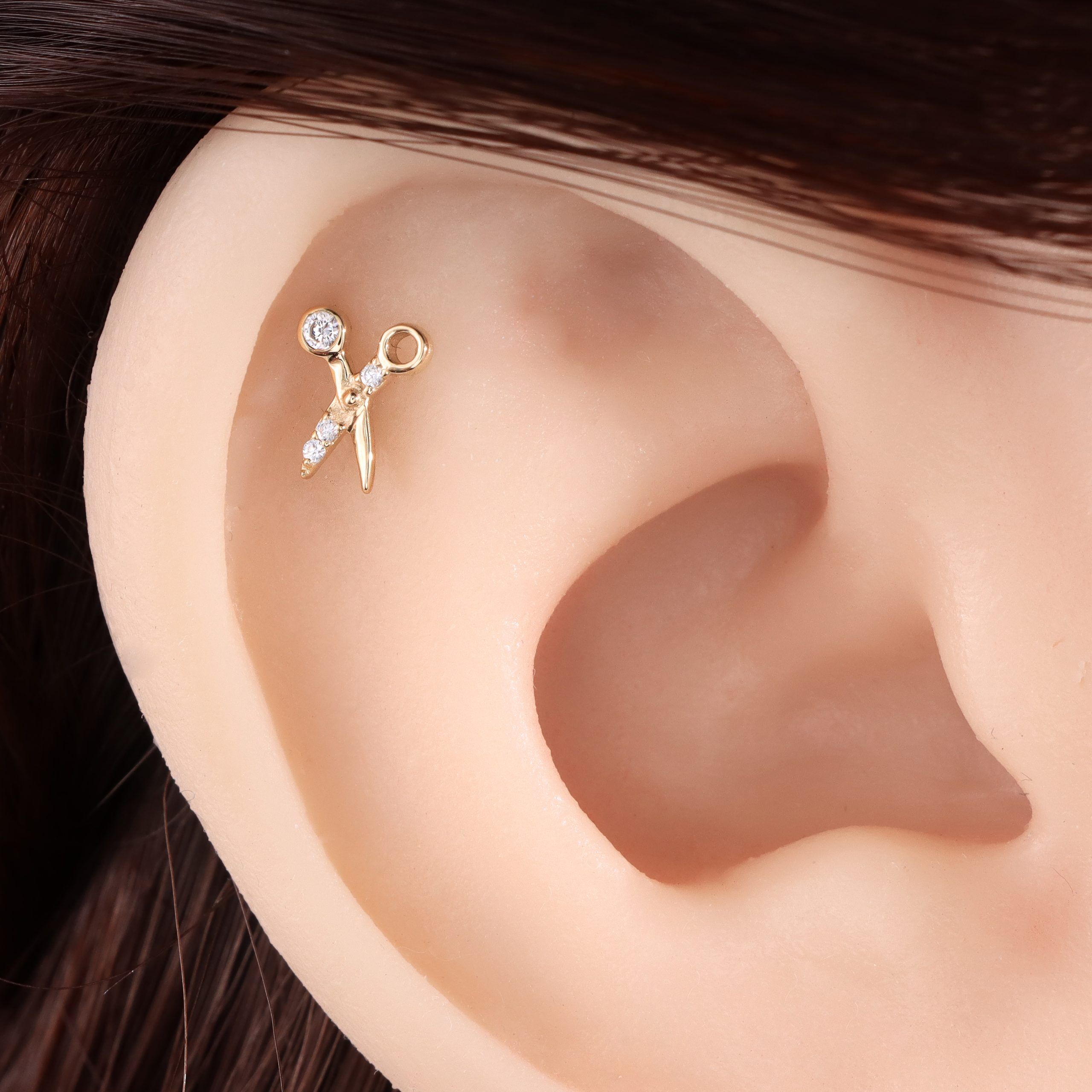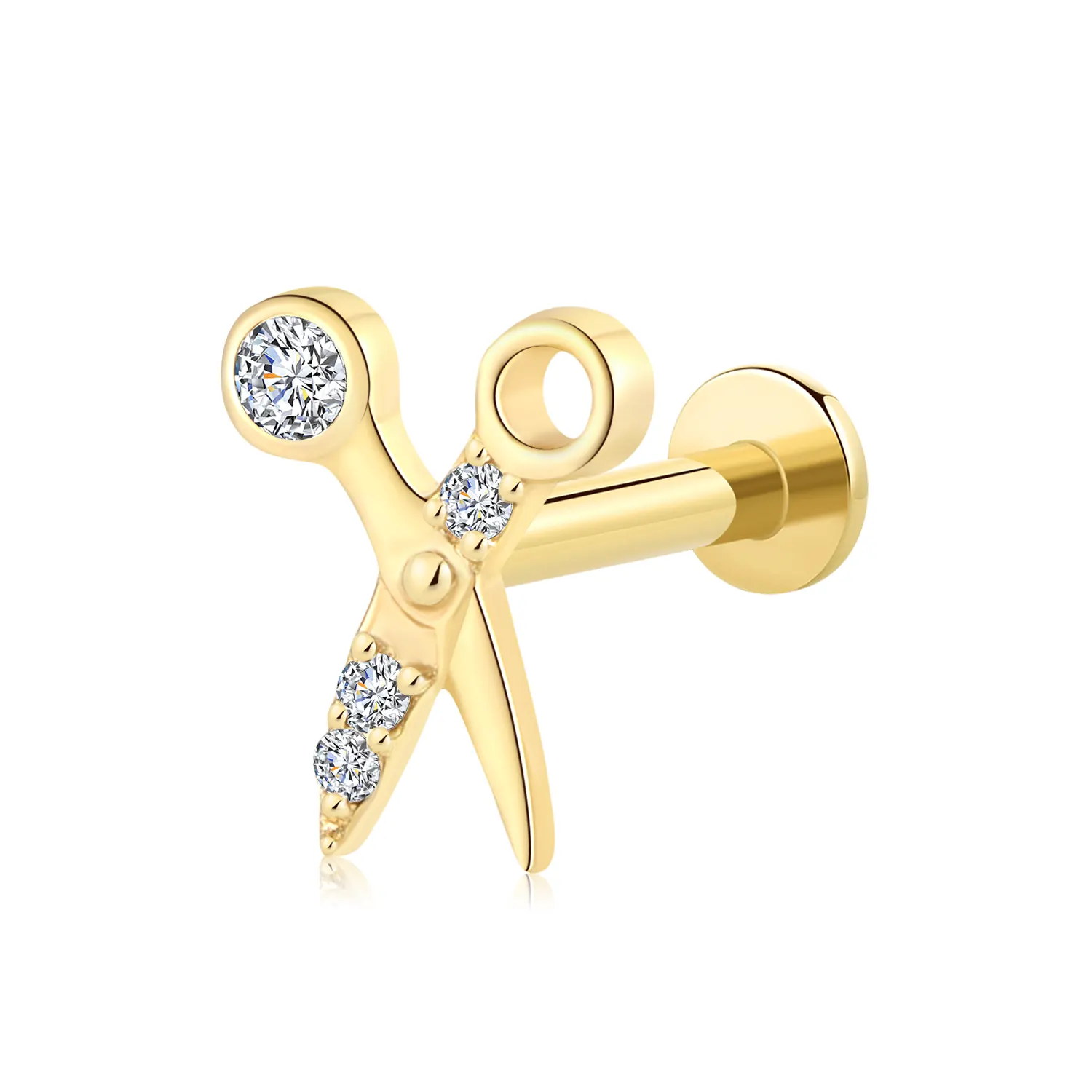 Introducing GUE40310G, a unique 14K solid gold threadless labret stud featuring a charming mini scissors design adorned with sparkling CZ stones. This playful piece of body jewelry combines the elegance of gold with the creativity of a scissors motif, making it a perfect accessory for those who appreciate both style and craftsmanship in their piercing jewelry.