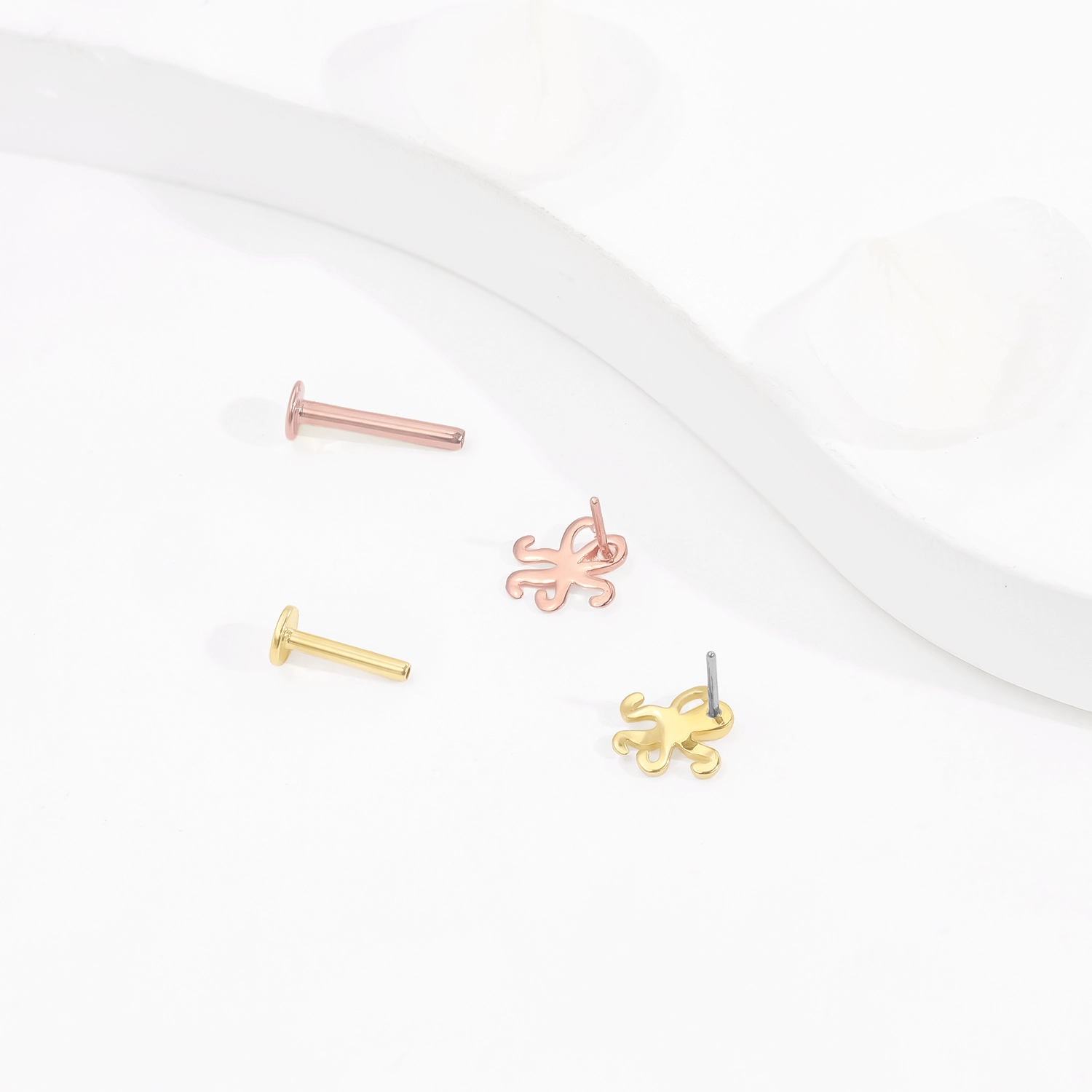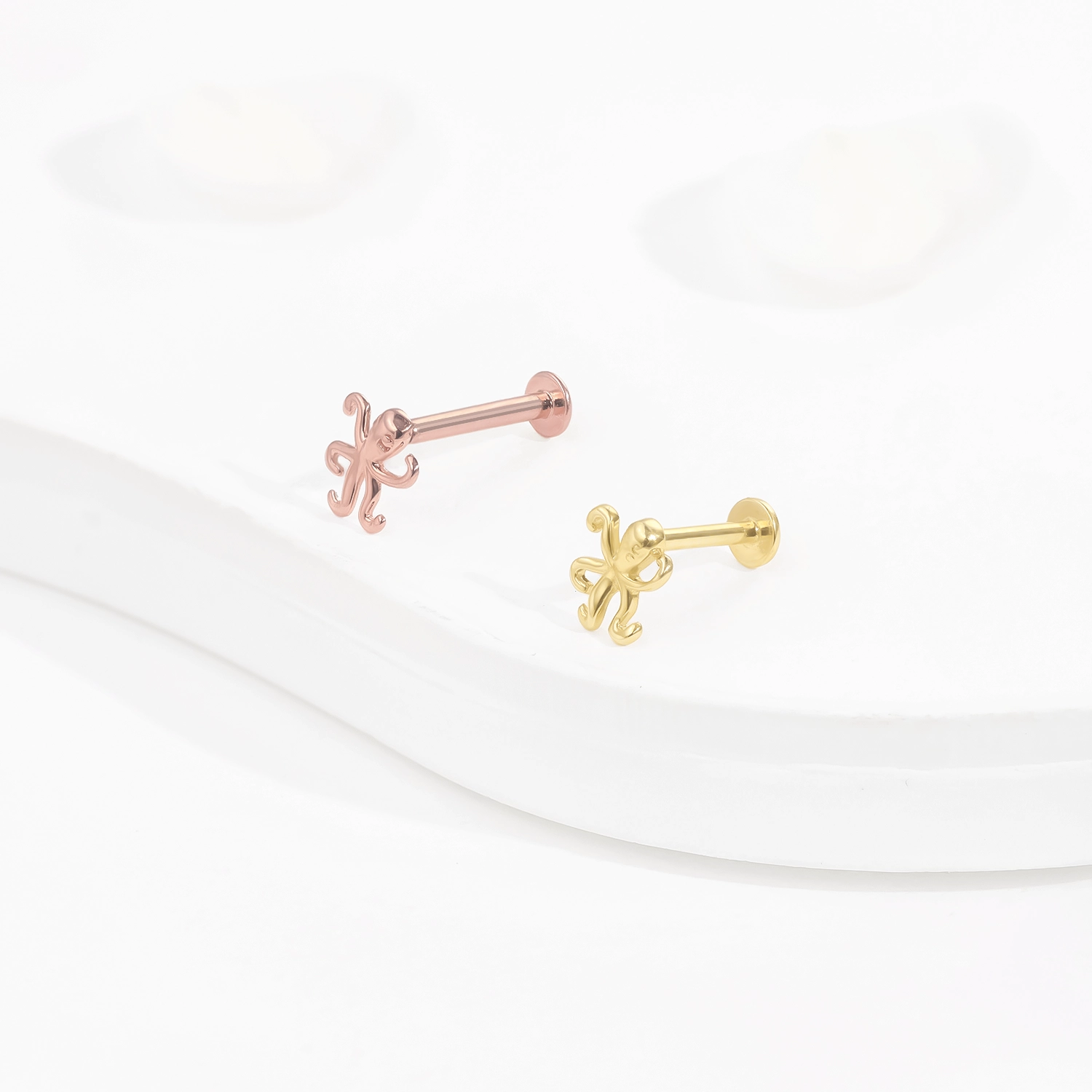 Introducing GUE07G: Elevate your body jewelry collection with this 14K solid gold threadless labret stud, featuring a charming octopus design. Available in both gold and rose gold versions, this unique piece adds a touch of whimsy and elegance to your style. Pin:0.45*45