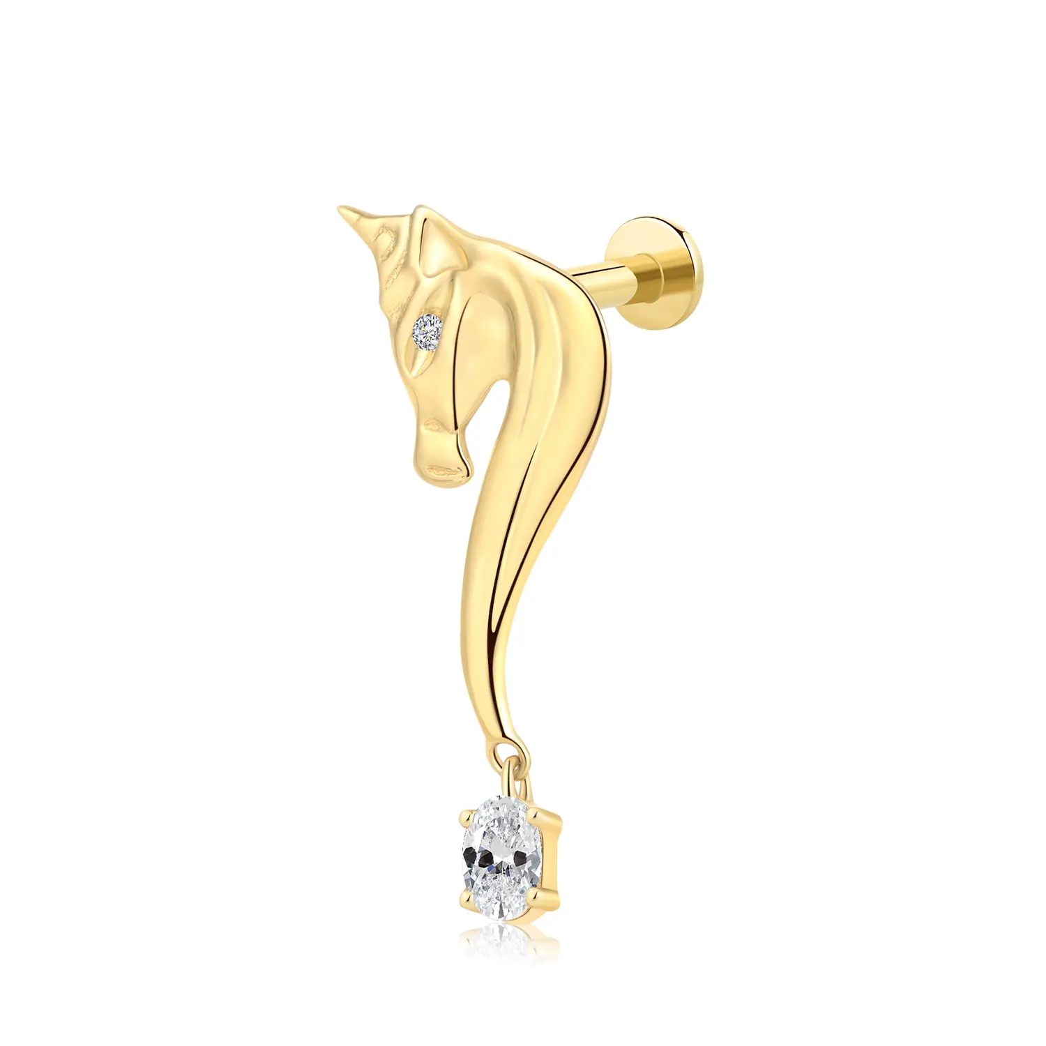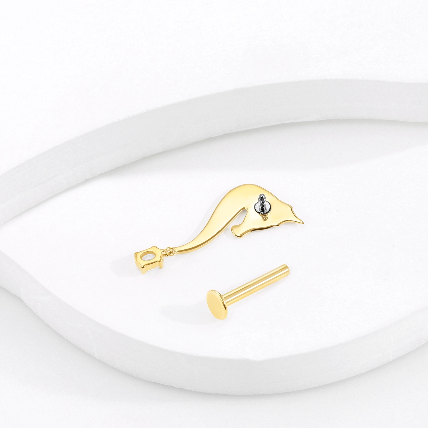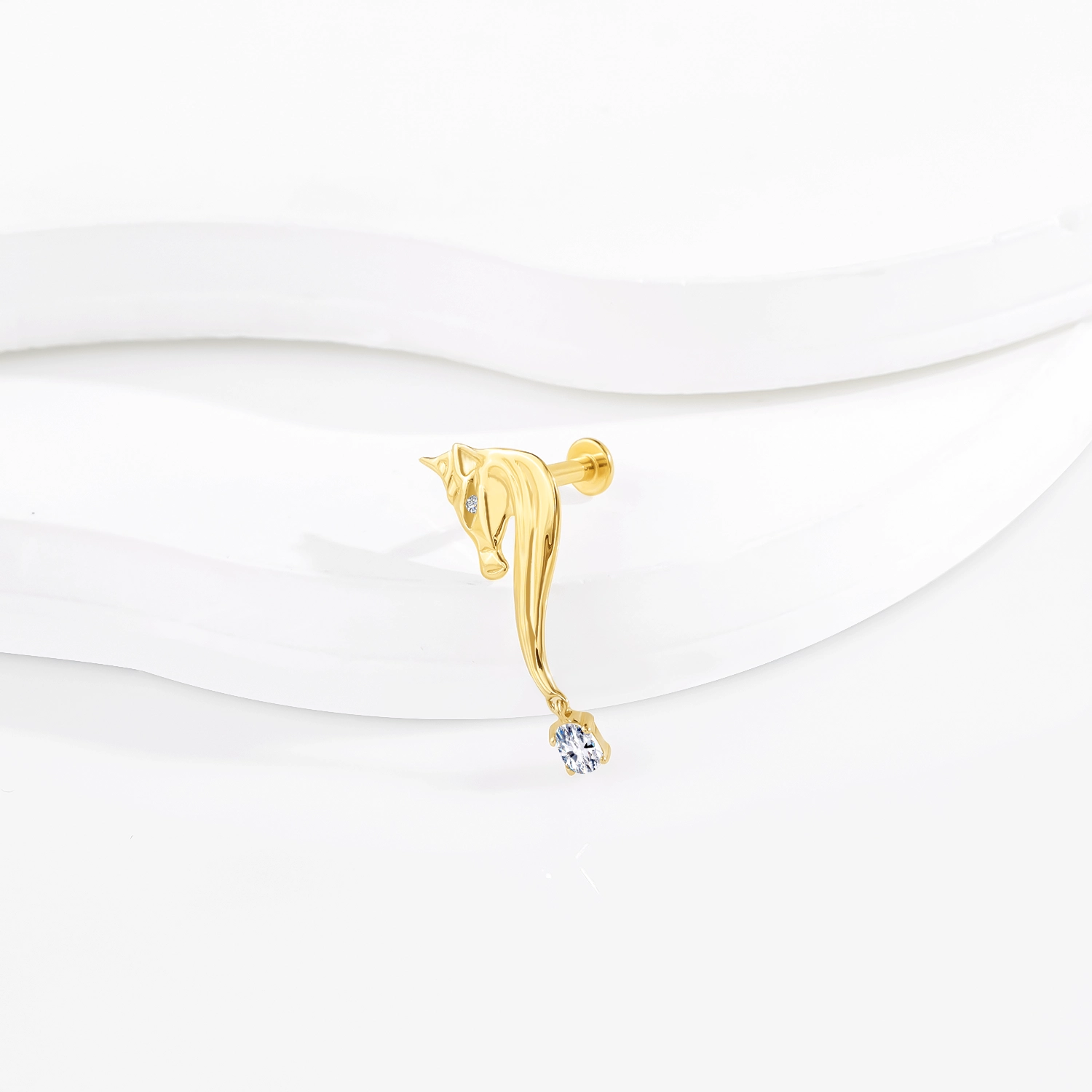 Introducing GVB231296G: This 14K solid gold internally threaded labret stud showcases a beautifully detailed seahorse design, symbolizing patience and protection. The flowing curves of the seahorse’s body create a graceful silhouette, with a sparkling CZ stone delicately dangling from the tail. The internally threaded feature ensures secure and comfortable wear, making this unique and elegant piece a perfect addition to your body jewelry collection.