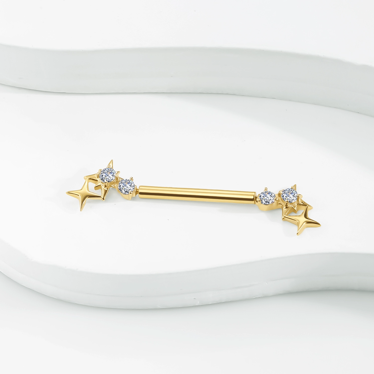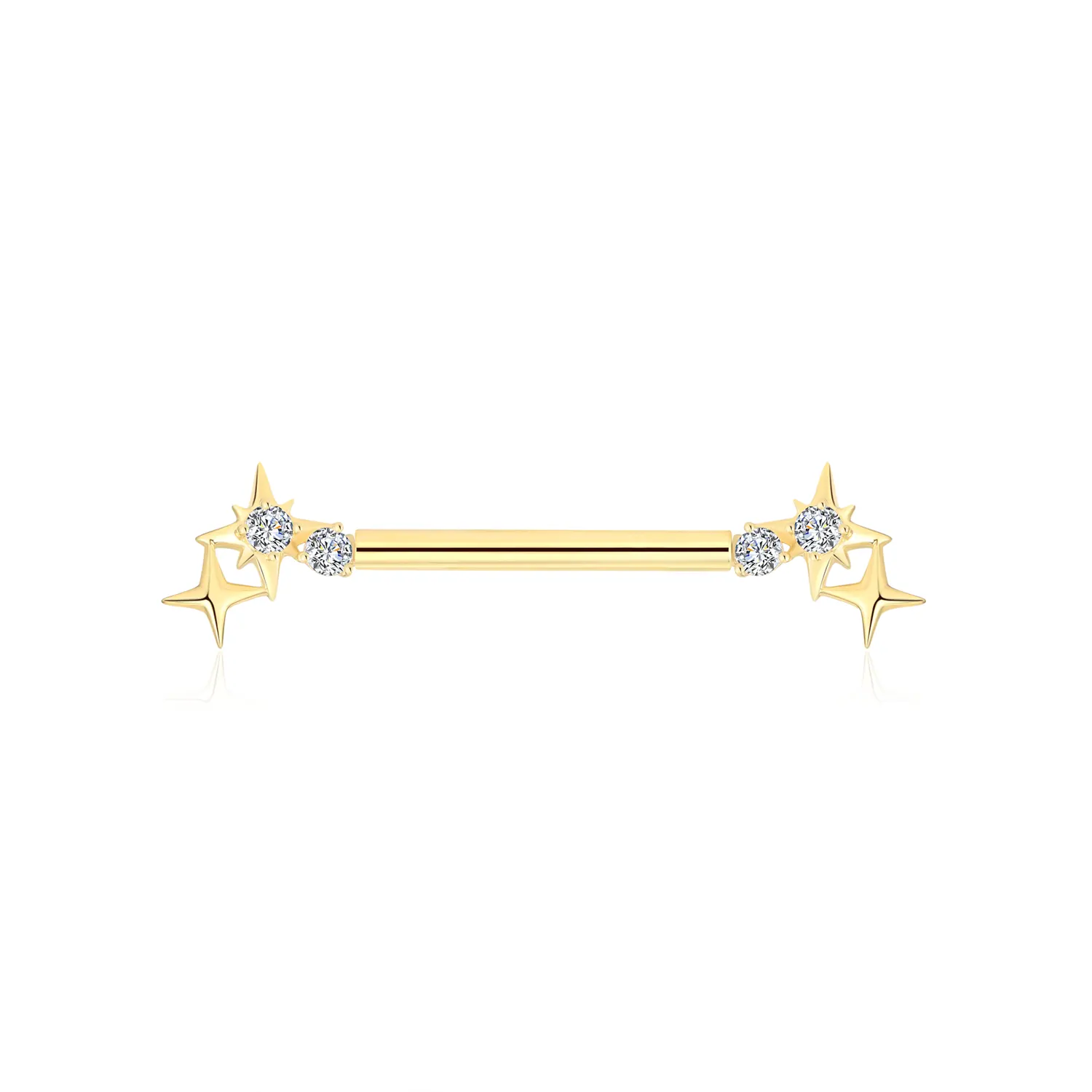 Introducing GXHE4038G, this 14K solid gold threadless nipple ring features a dazzling star cluster design, accented by brilliant CZ stones. The stars are intricately arranged on both ends of the bar, each adorned with sparkling CZ stones, creating a celestial look that adds elegance and charm. The steel push pin ensures a secure and comfortable fit, making this cosmic-inspired piece a standout addition to any body jewelry collection.
