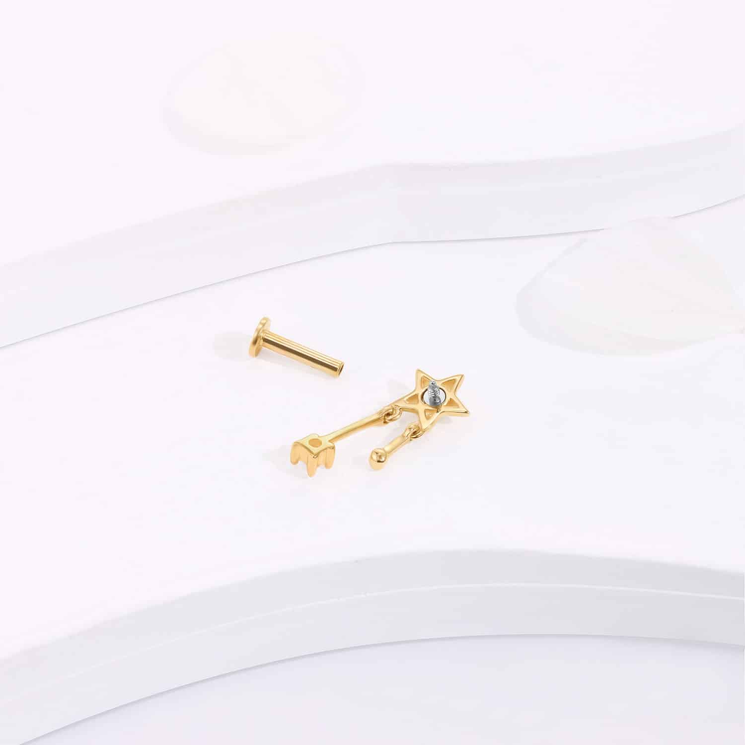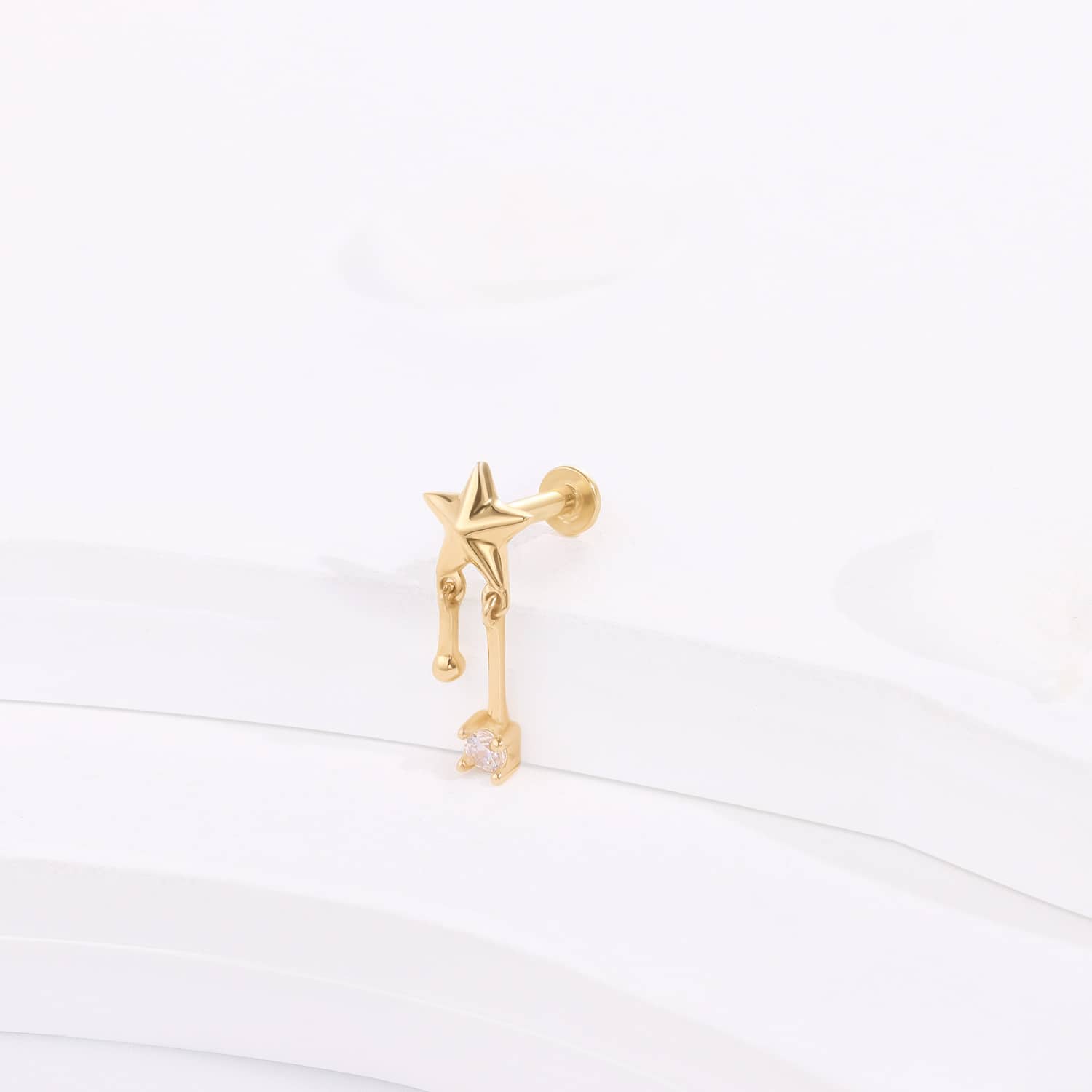 Shine like a star with the GVE2668G model, a 14K solid gold top piercing piece featuring a star-shaped design with a dangling cubic zircon charm. Its internally threaded stainless steel screw ensures a gleaming addition to your body jewelry collection. 14K Solid Gold+Stainless Steel Thread(0.9mm)