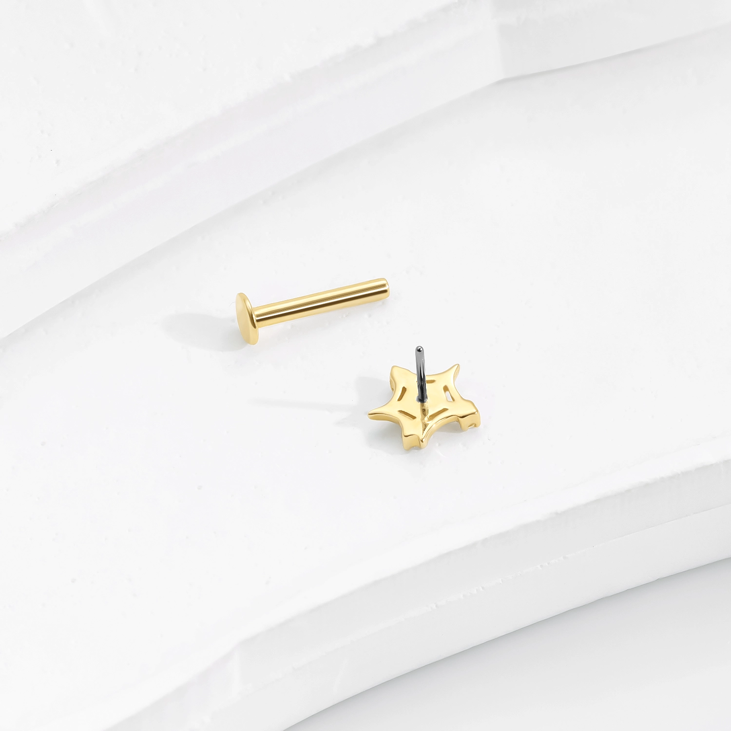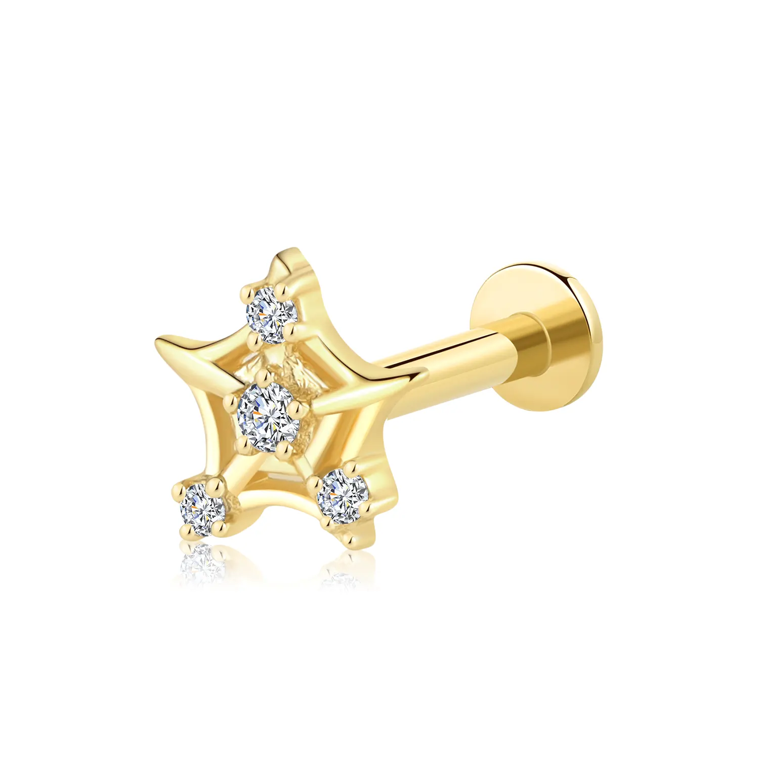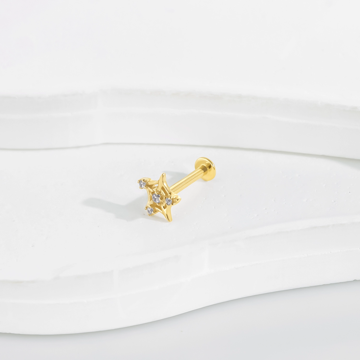 Introducing GUE4036G, a stunning 14K solid gold threadless labret stud crafted in the shape of a delicate starfish. Adorned with brilliant cubic zirconia stones, this exquisite piece of body jewelry captures the essence of oceanic beauty. The threadless design ensures a secure and comfortable fit, making it an ideal choice for those who appreciate both luxury and unique design in their piercing accessories.