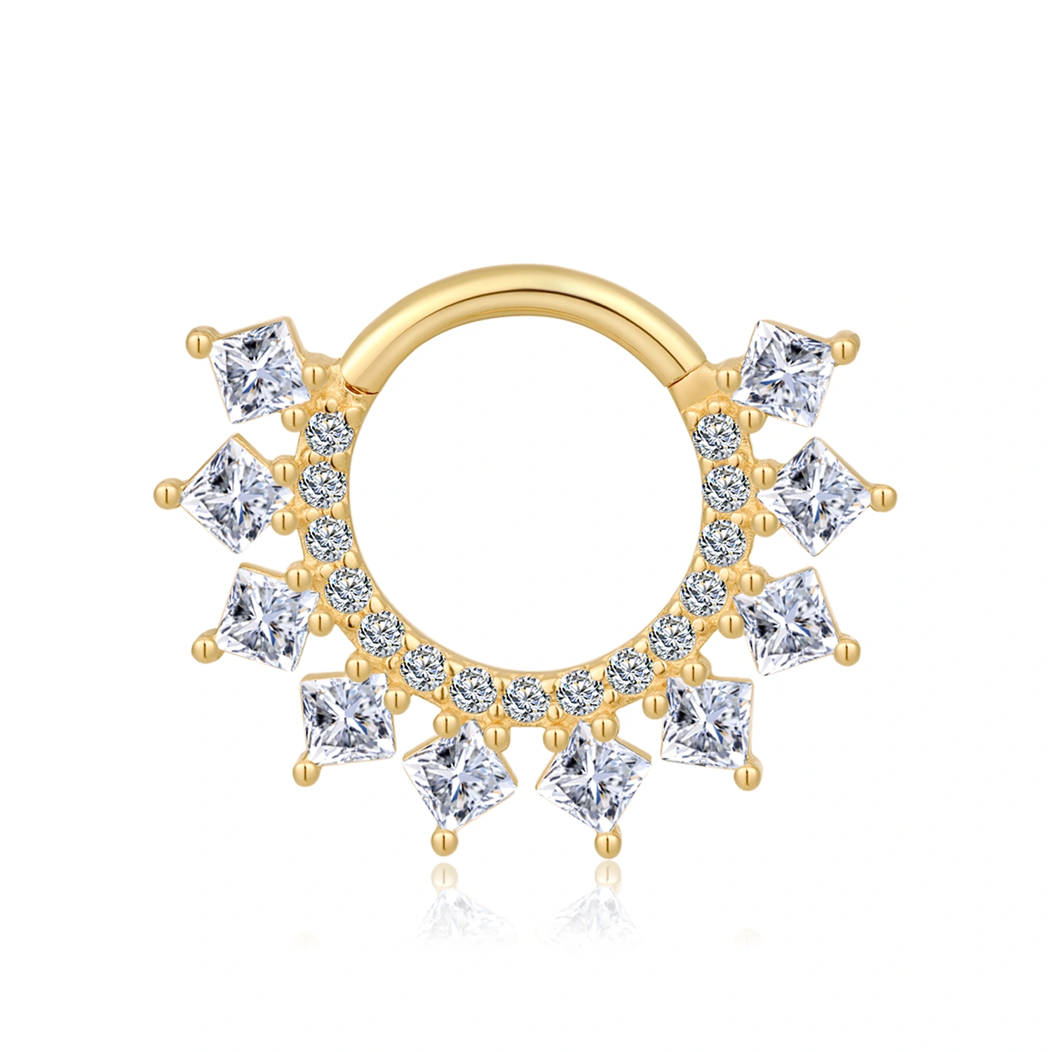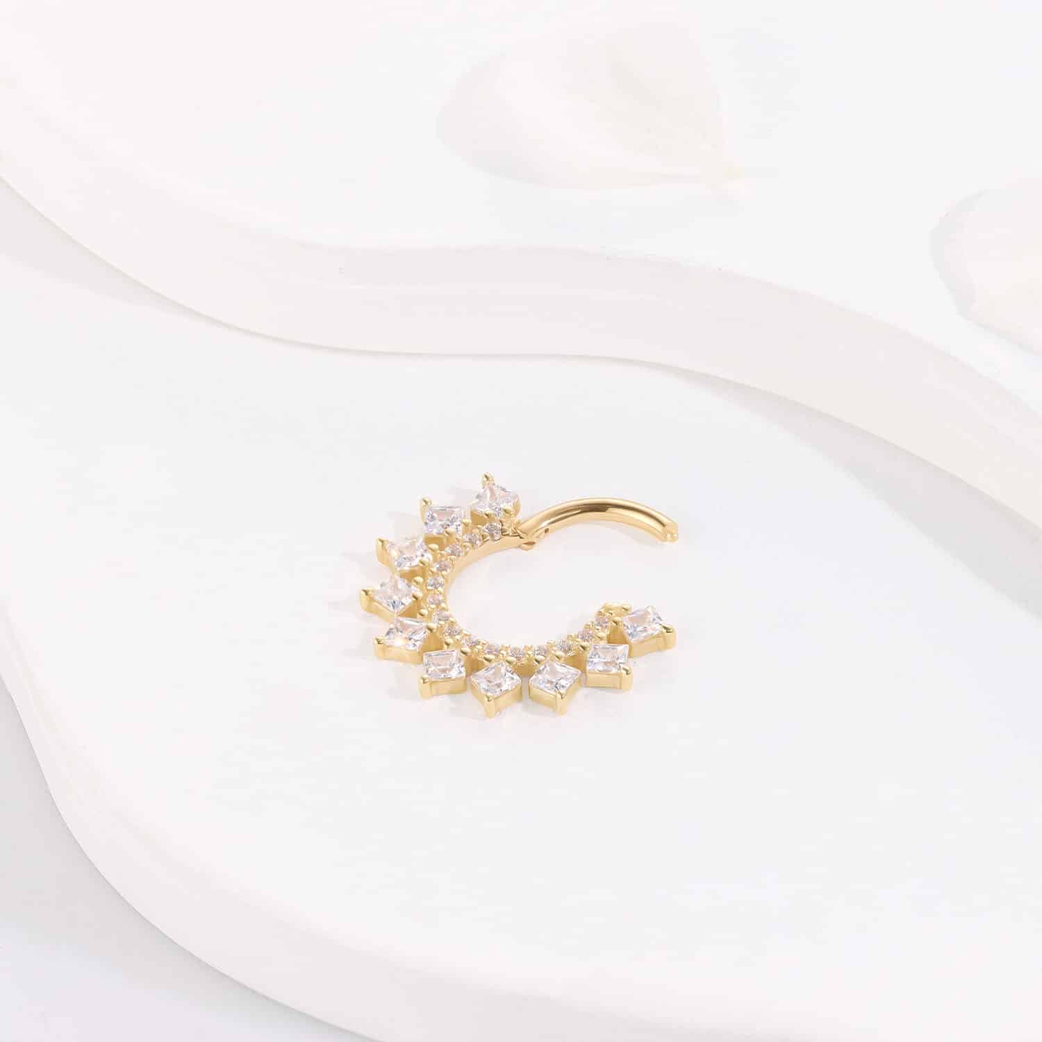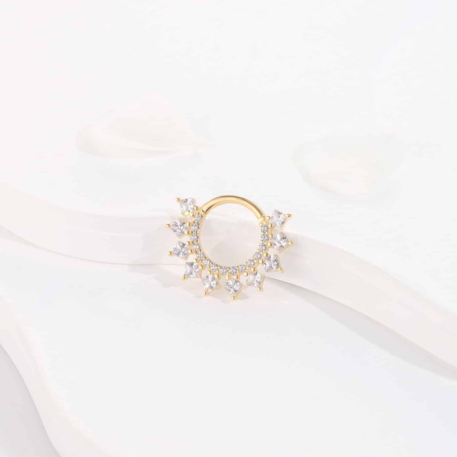 Behold the GZ84G-1608, a stunning 14k solid gold hinged segment ring illuminated by the brilliance of cubic zircon. Its celestial design brings a touch of heavenly charm to your body jewelry, perfect for making a luminous statement. 1.2*8mm;RD: 1.1*15 ;SQ:2.0*10