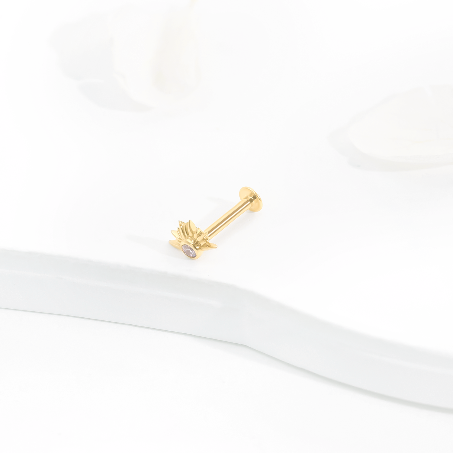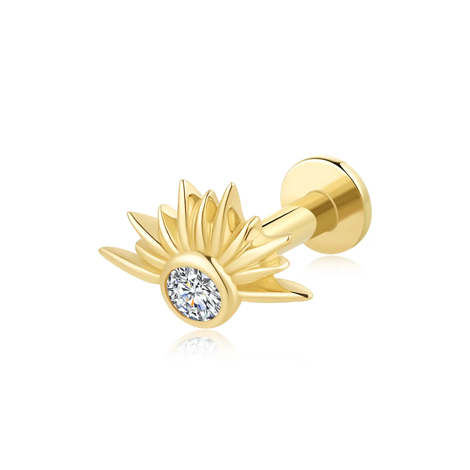 Introducing GUB241526: Elevate your body jewelry collection with this 14K solid gold threadless labret stud, featuring a radiant sunrise design adorned with a sparkling CZ stone. This unique piece adds a touch of elegance and brilliance to your style. Pin:0.45*4.5mm