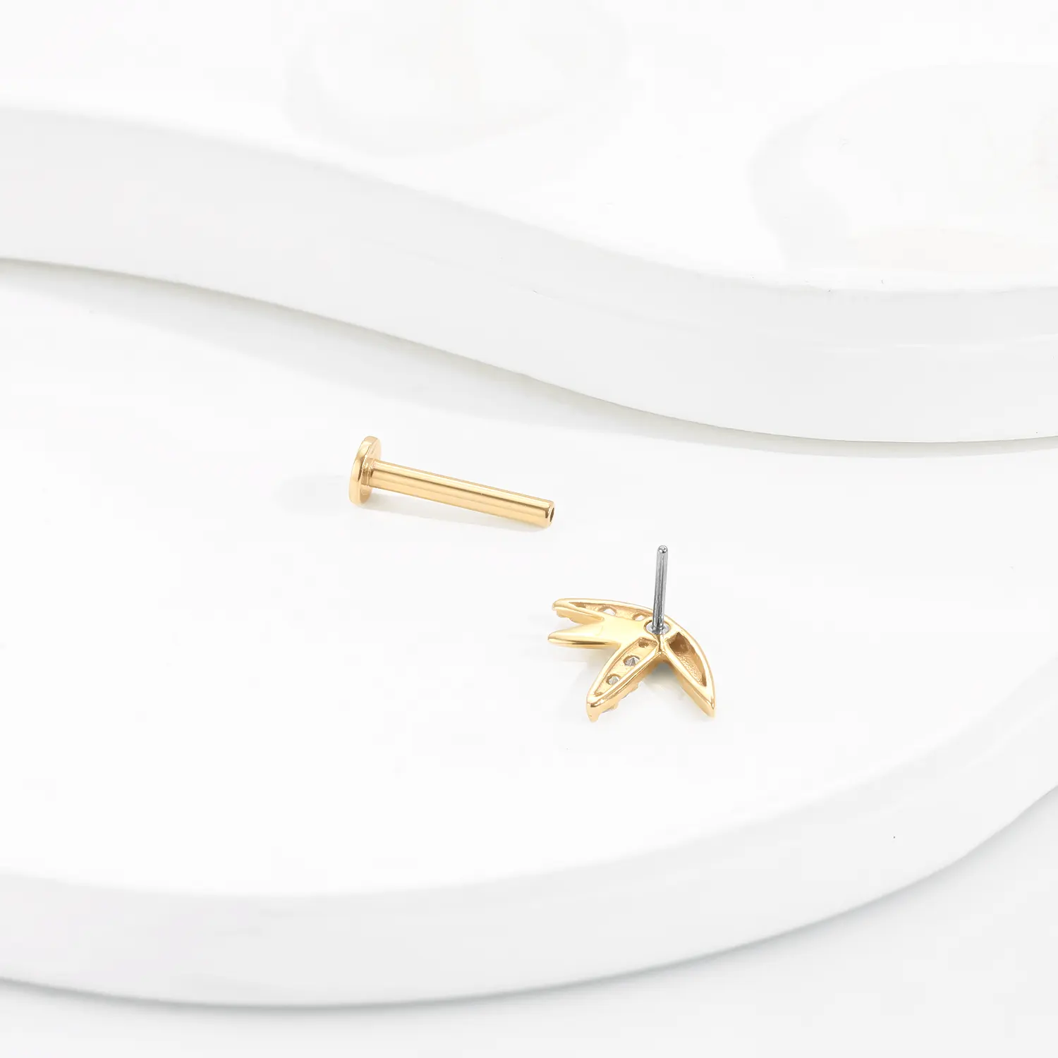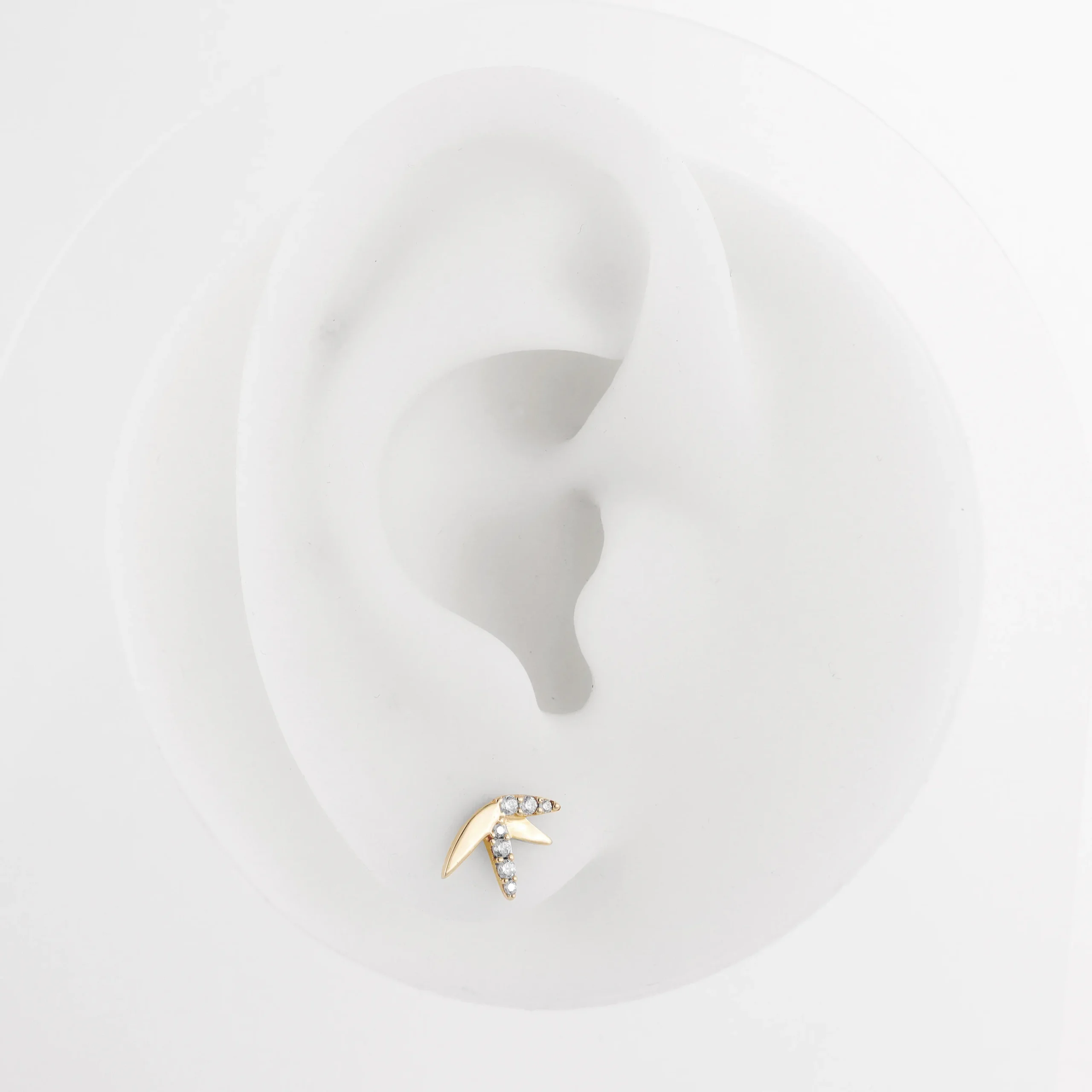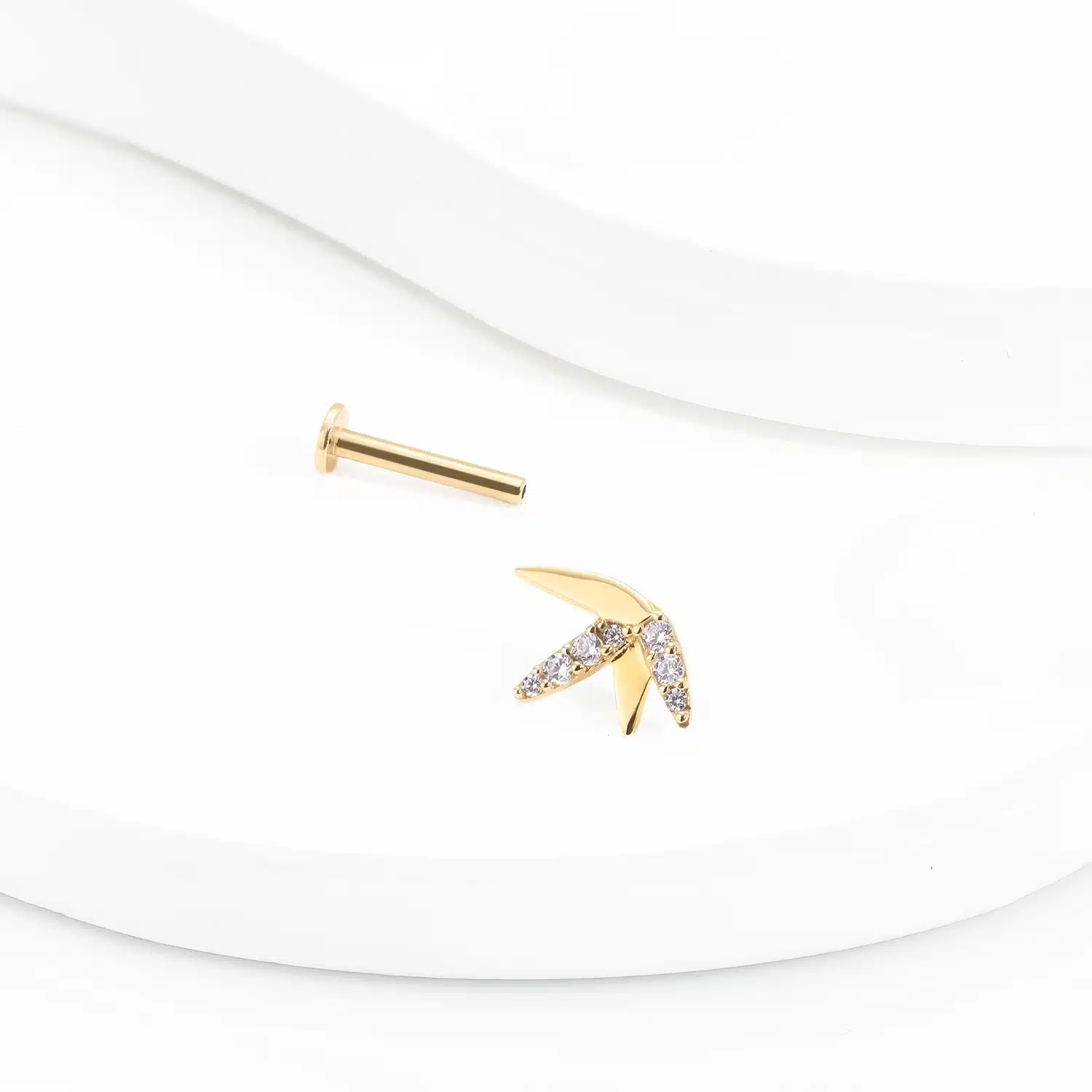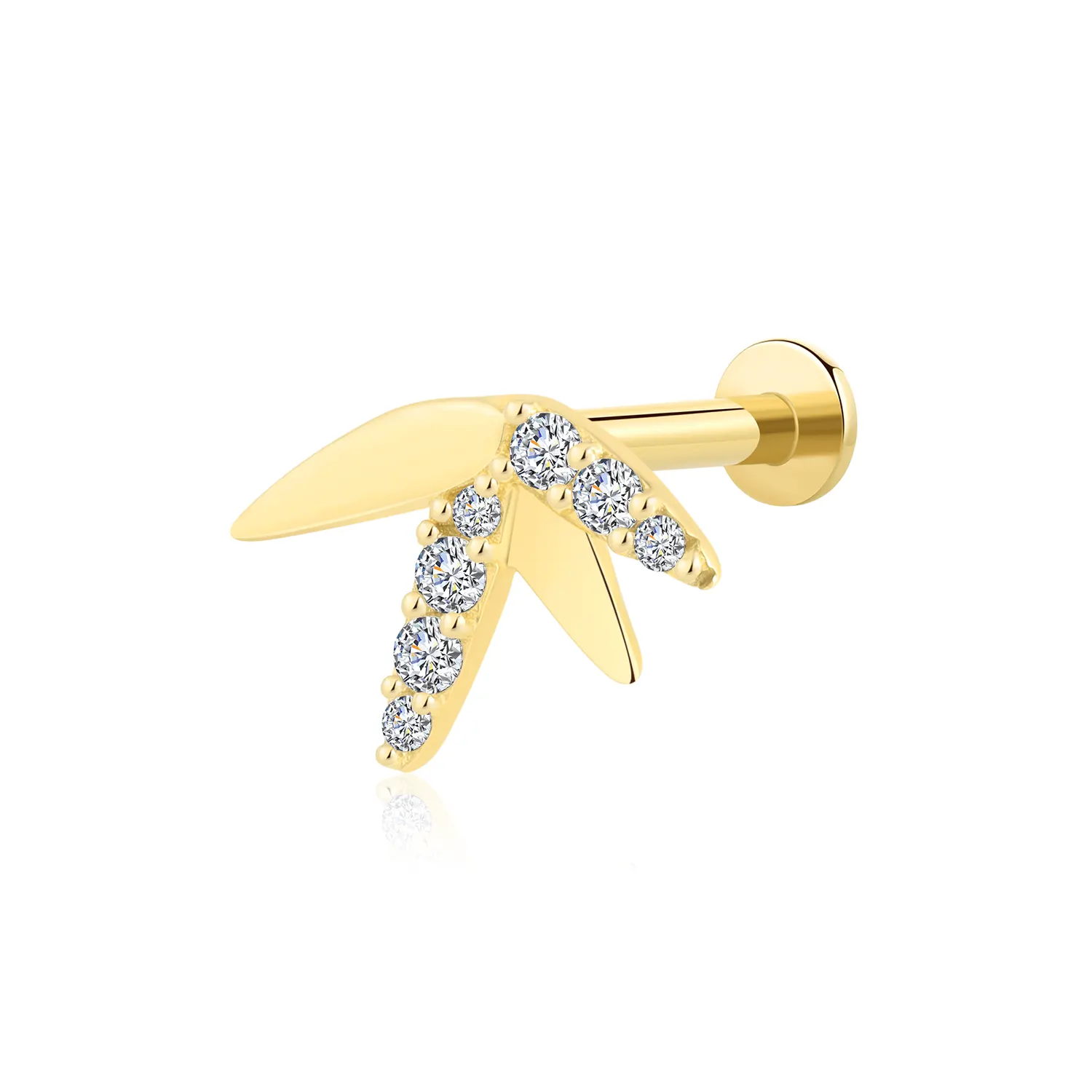 Nature-inspired elegance: GUD48, a 14K gold threadless labret stud shaped like a bamboo leaf, with a CZ stone for a touch of sparkle.
