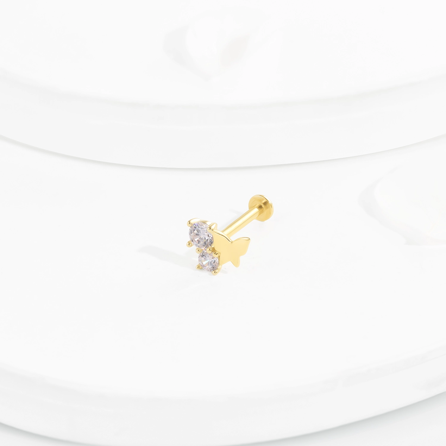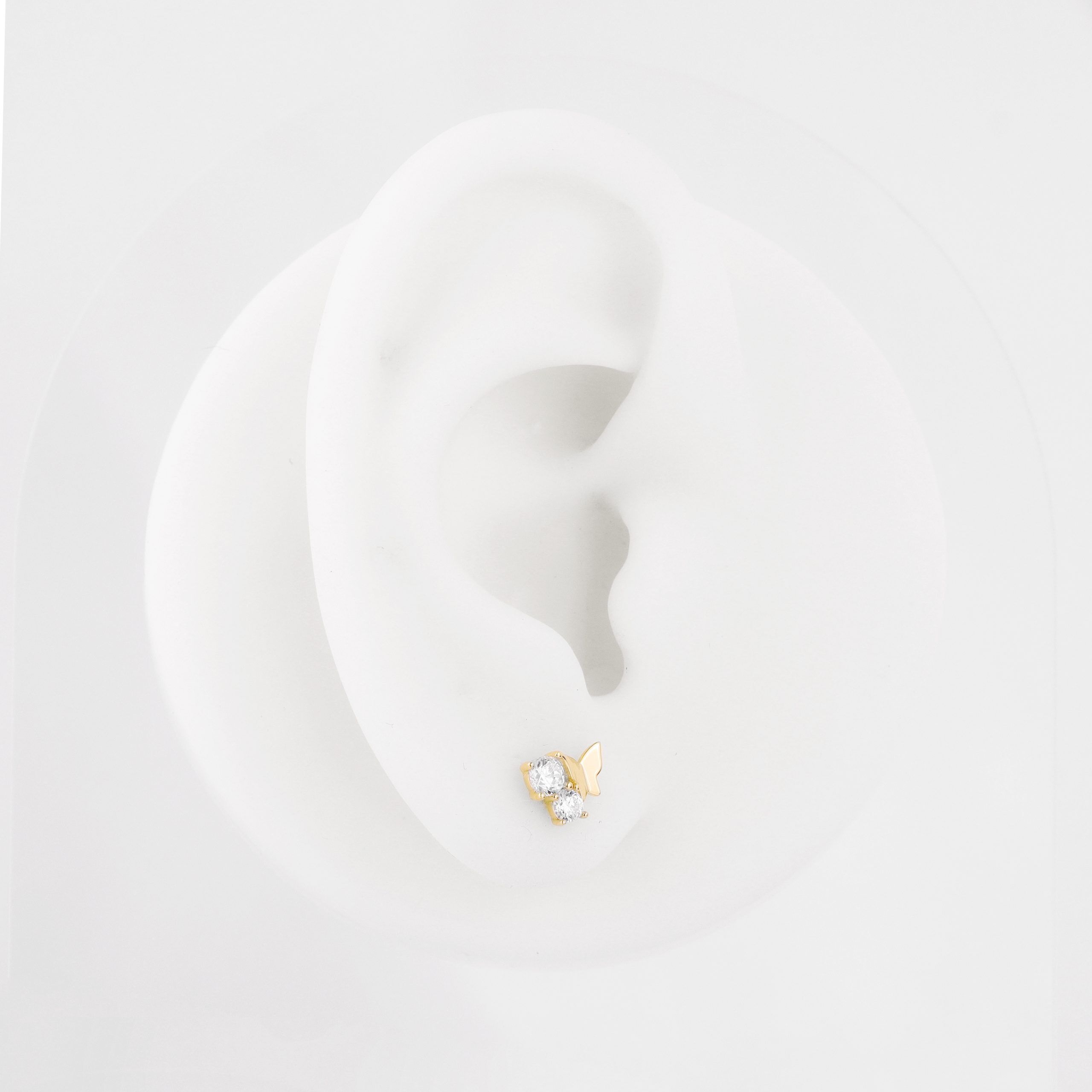 Introducing GUE4019G, a 14K solid gold threadless labret stud featuring a charming butterfly design adorned with sparkling CZ stones. This elegant piece adds a touch of whimsy and sophistication to your body jewelry collection, perfect for any occasion.