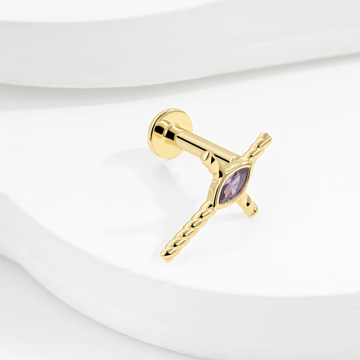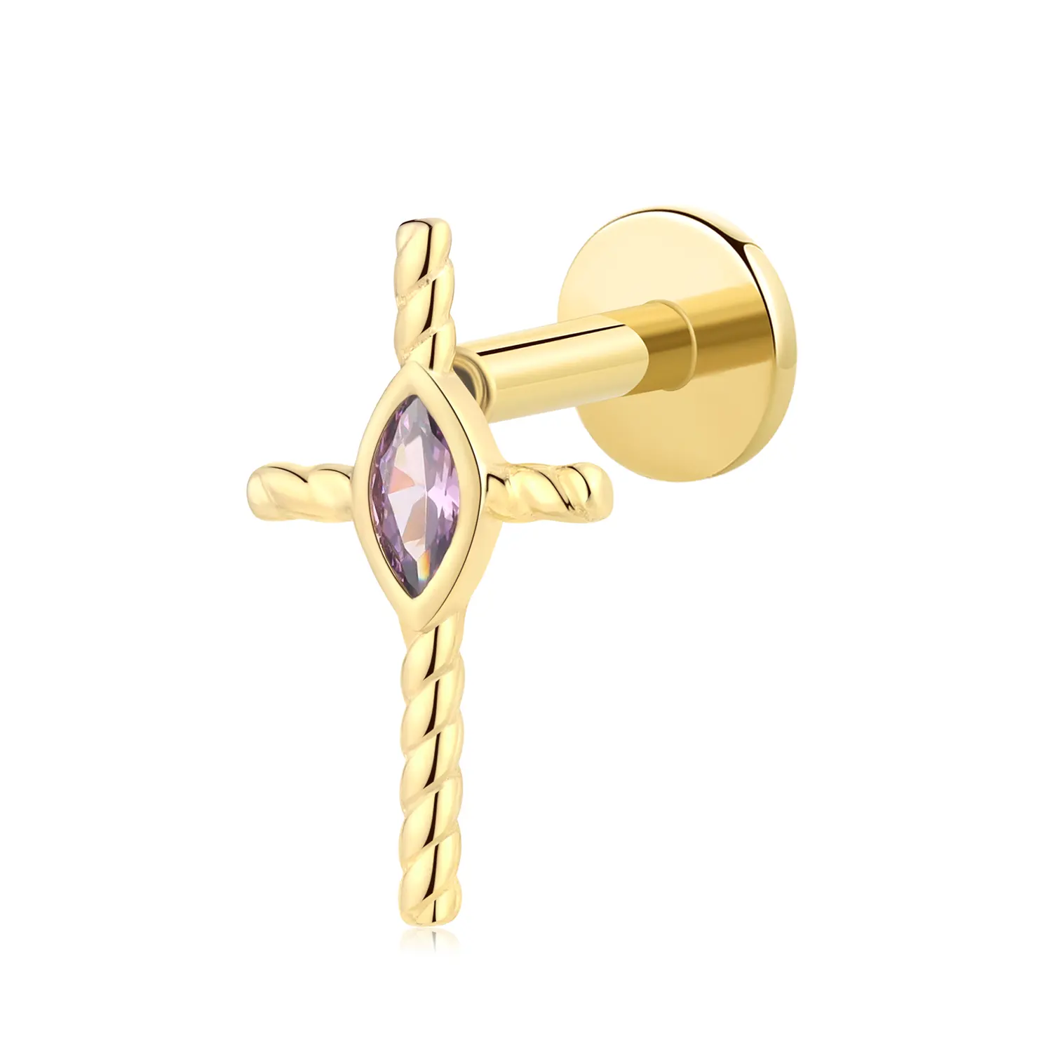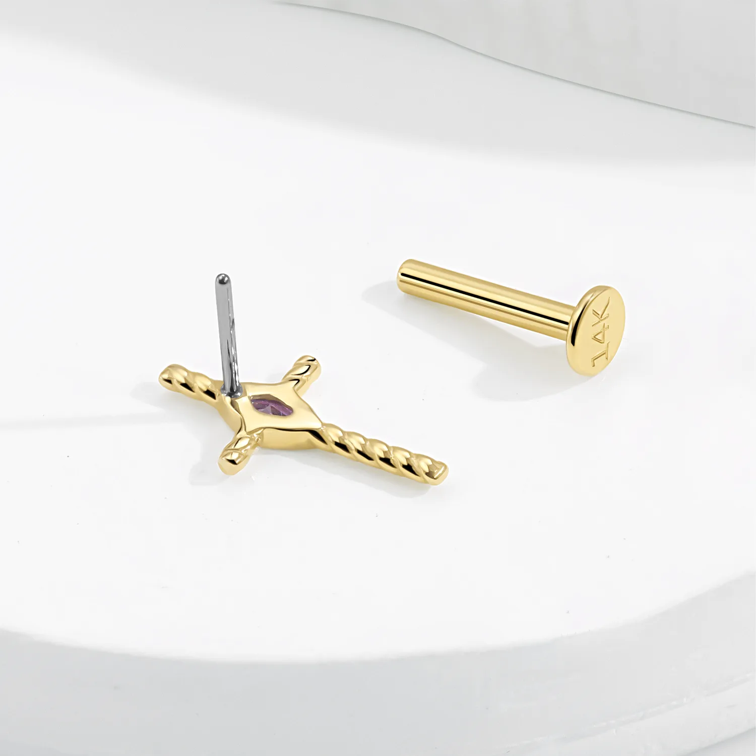 Introducing GUE31170G – a 14K solid gold threadless labret stud featuring a twisted rope-style cross design with a marquise-cut lavender CZ at the center. Bold, symbolic, and made for standout body piercing looks.