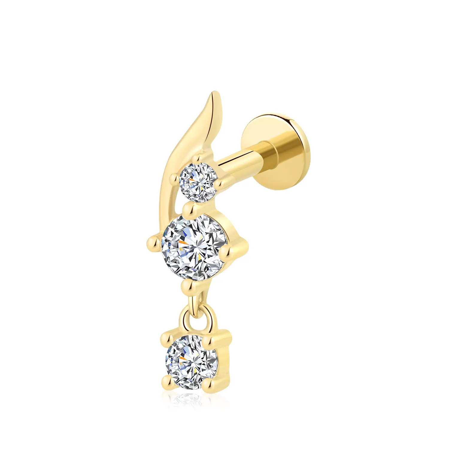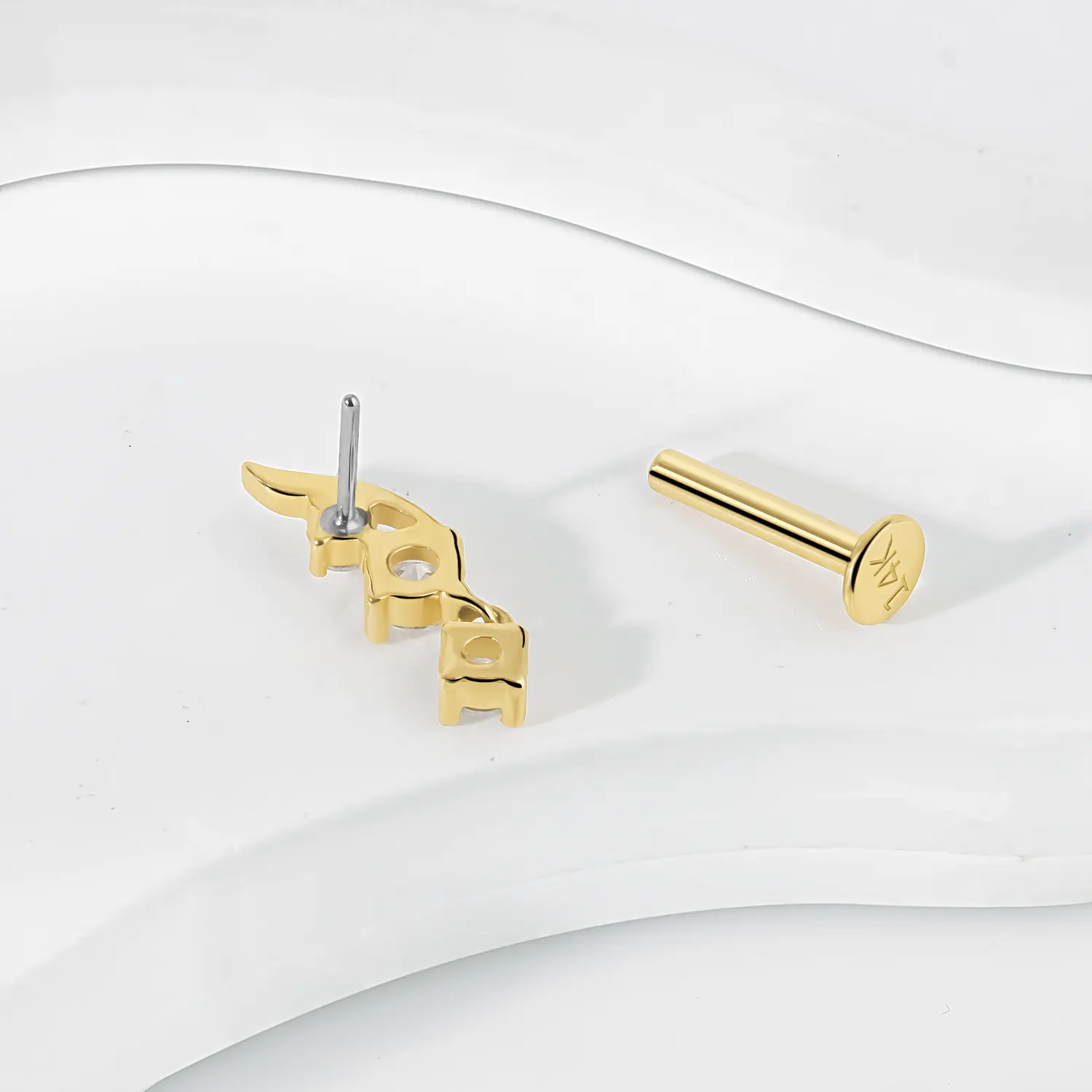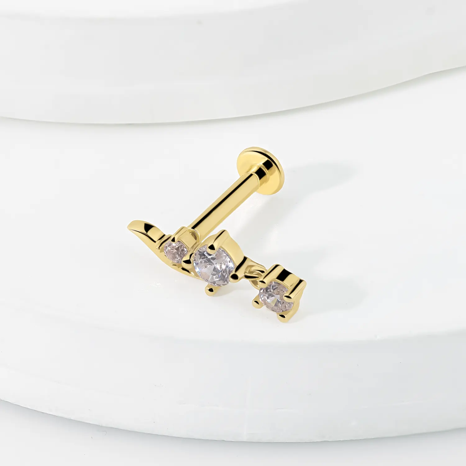 Introducing GUE40485G, a 14K solid gold threadless labret stud featuring an elegant curved design with three sparkling cubic zirconia stones. The secure steel push-pin system offers comfort and style for any body piercing.