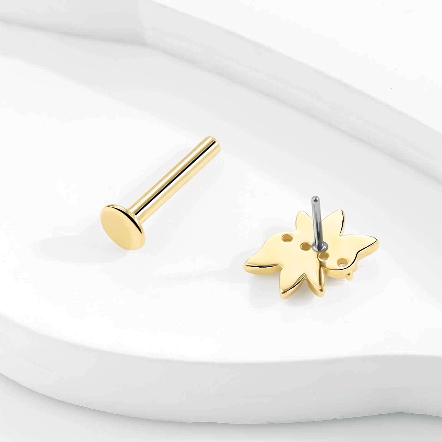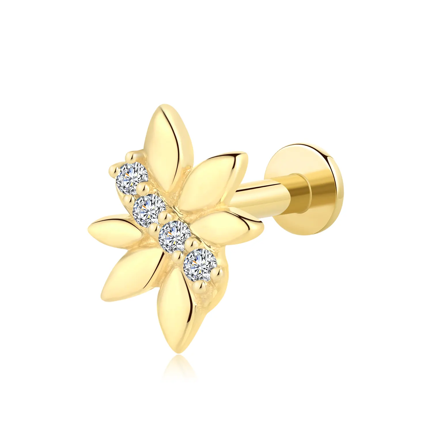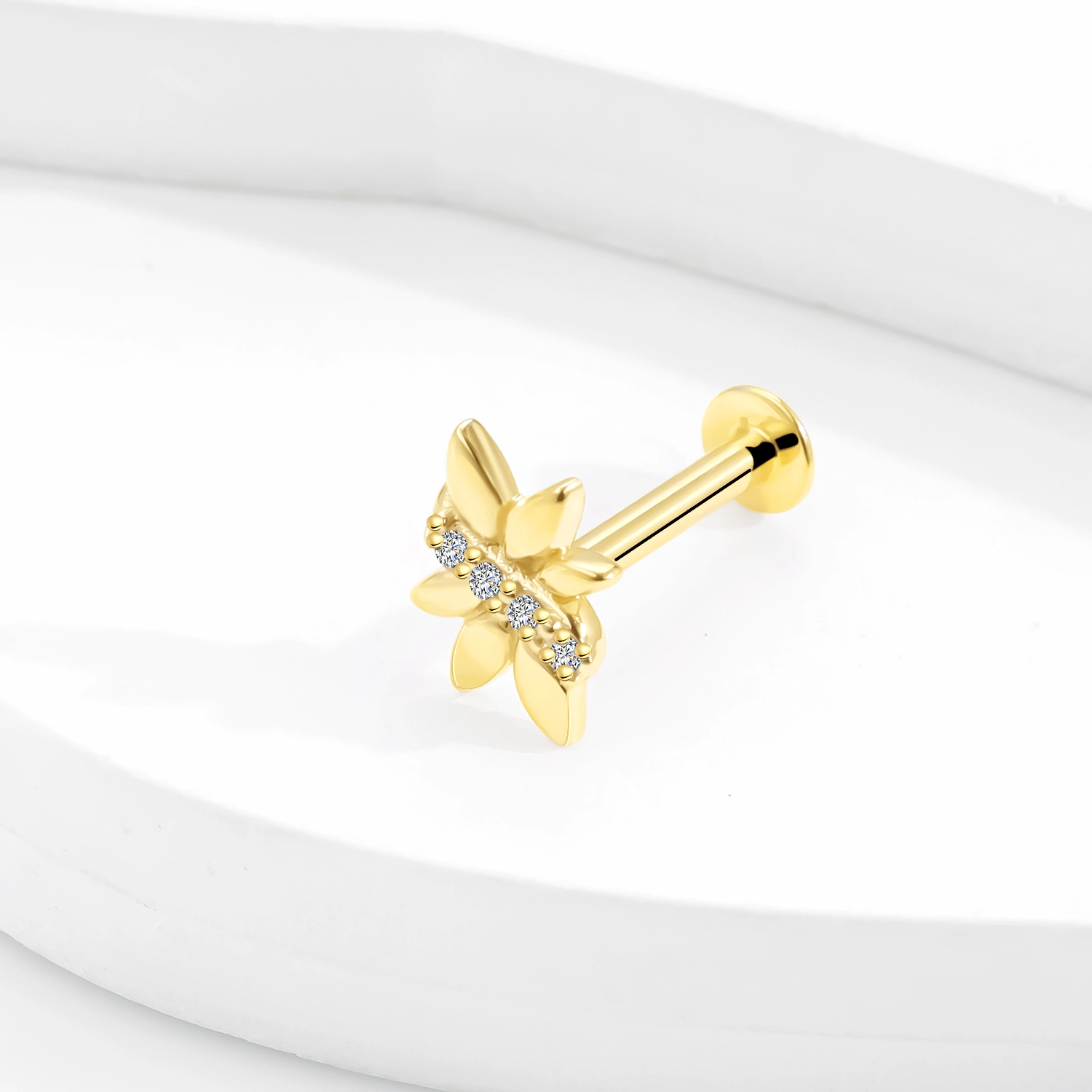 Introducing GUE40393G – A charming 14K solid gold threadless labret stud shaped like a blooming flower, accented with four brilliant CZ stones. A delicate yet eye-catching piece for your body jewelry collection.