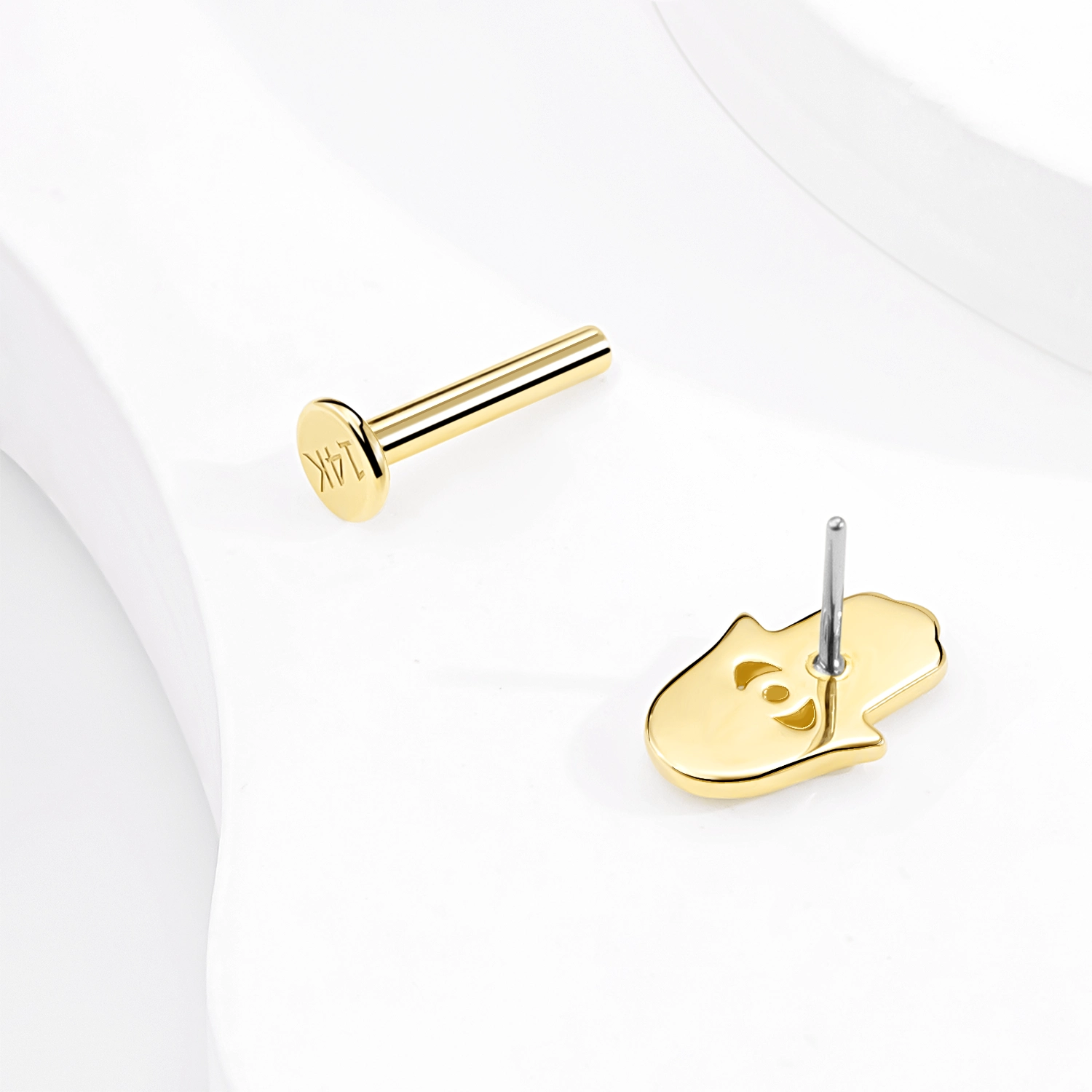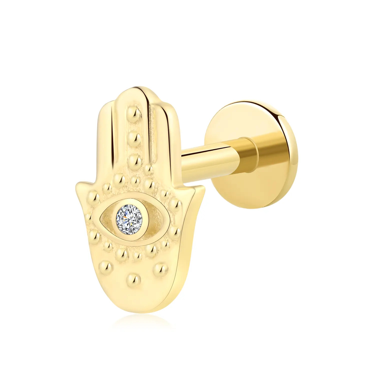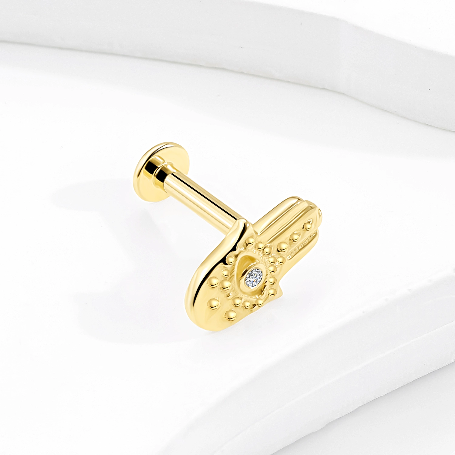 Introducing GUE31126G – a 14K solid gold threadless labret stud featuring a detailed Hamsa hand shape with an evil eye design, highlighted by a sparkling CZ stone at the center. A symbolic piece of body jewelry perfect for any piercing.
