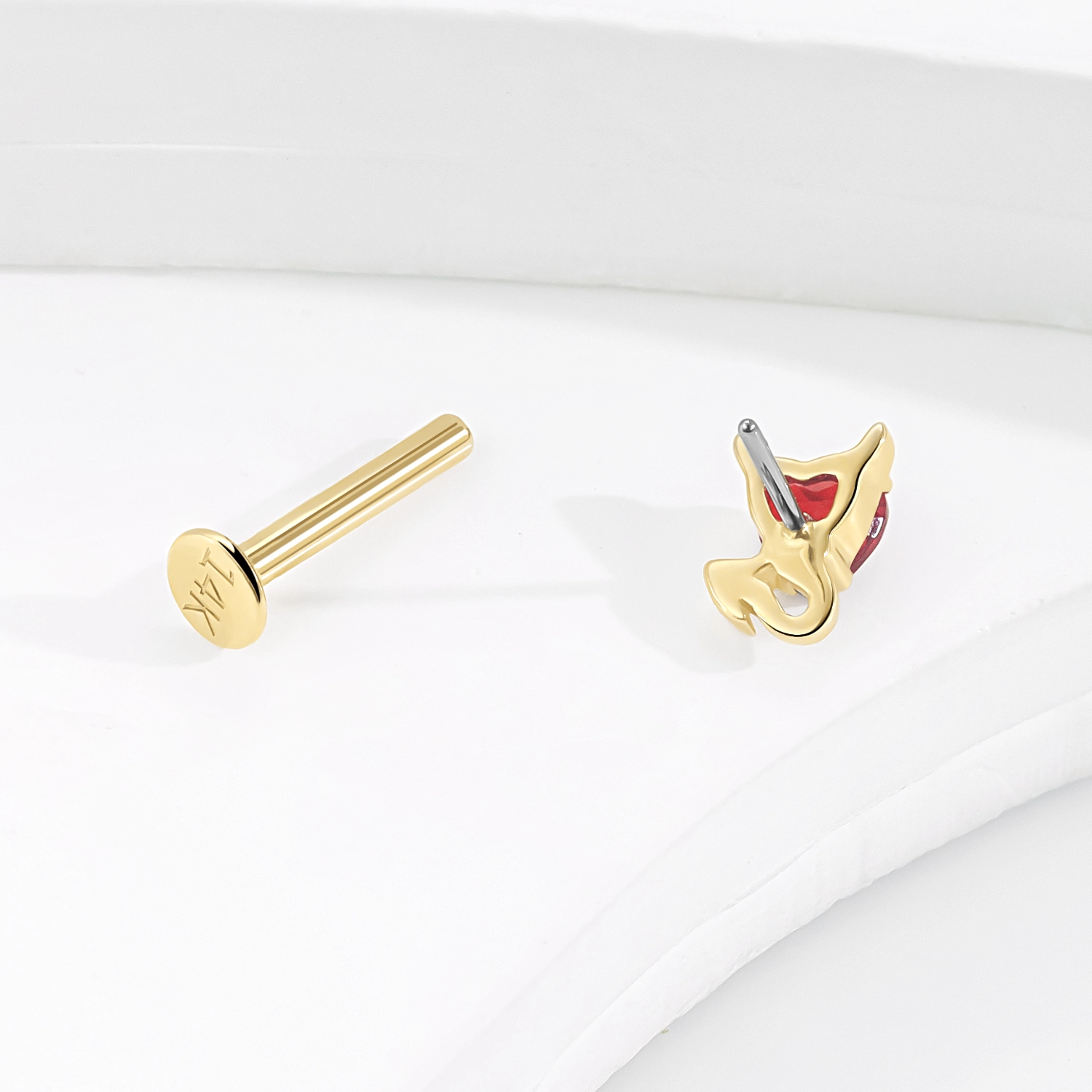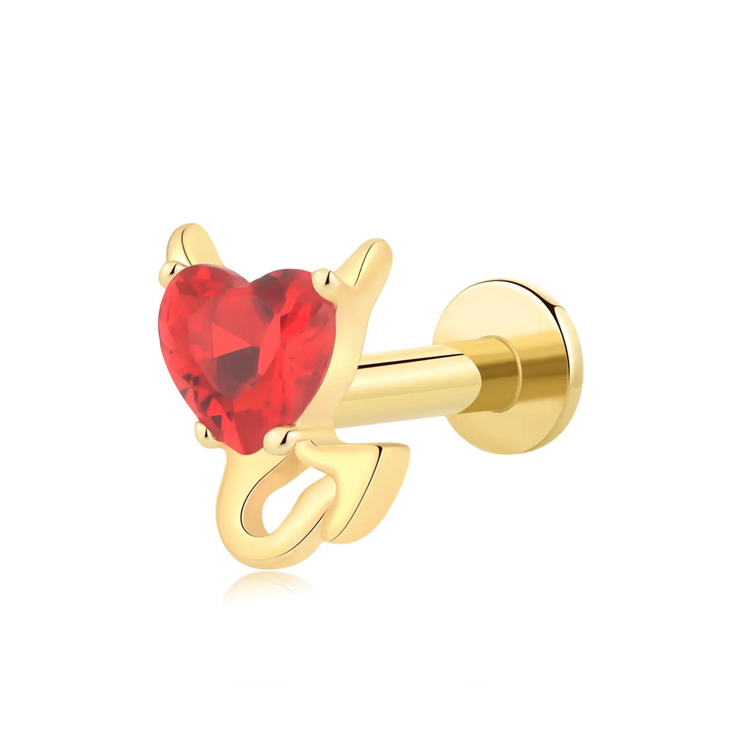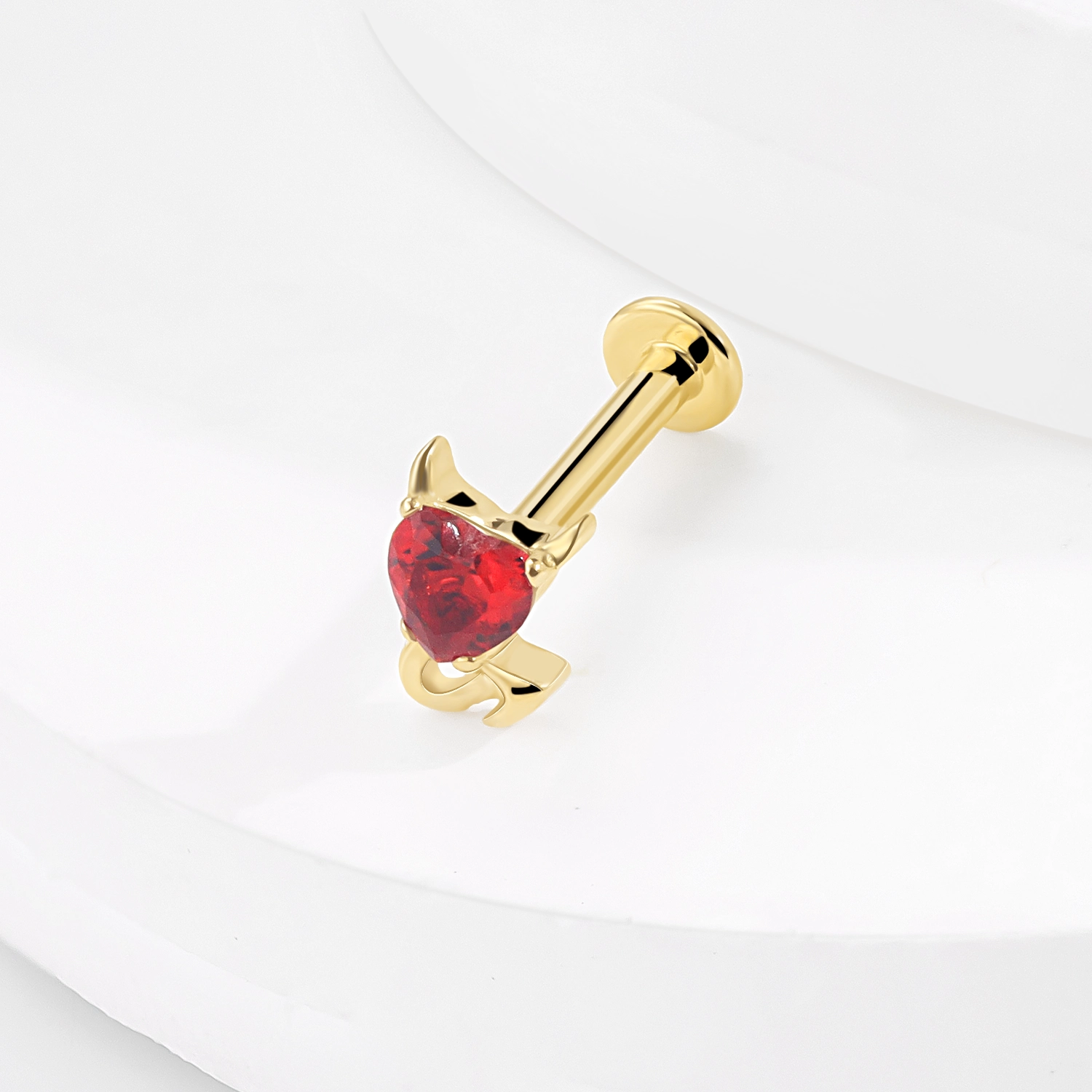 Introducing GUB43211G – A playful and bold threadless labret stud in 14K solid gold, featuring a fiery red heart-shaped CZ stone with devil horn and tail accents. Complete with a steel push pin for secure, stylish wear.