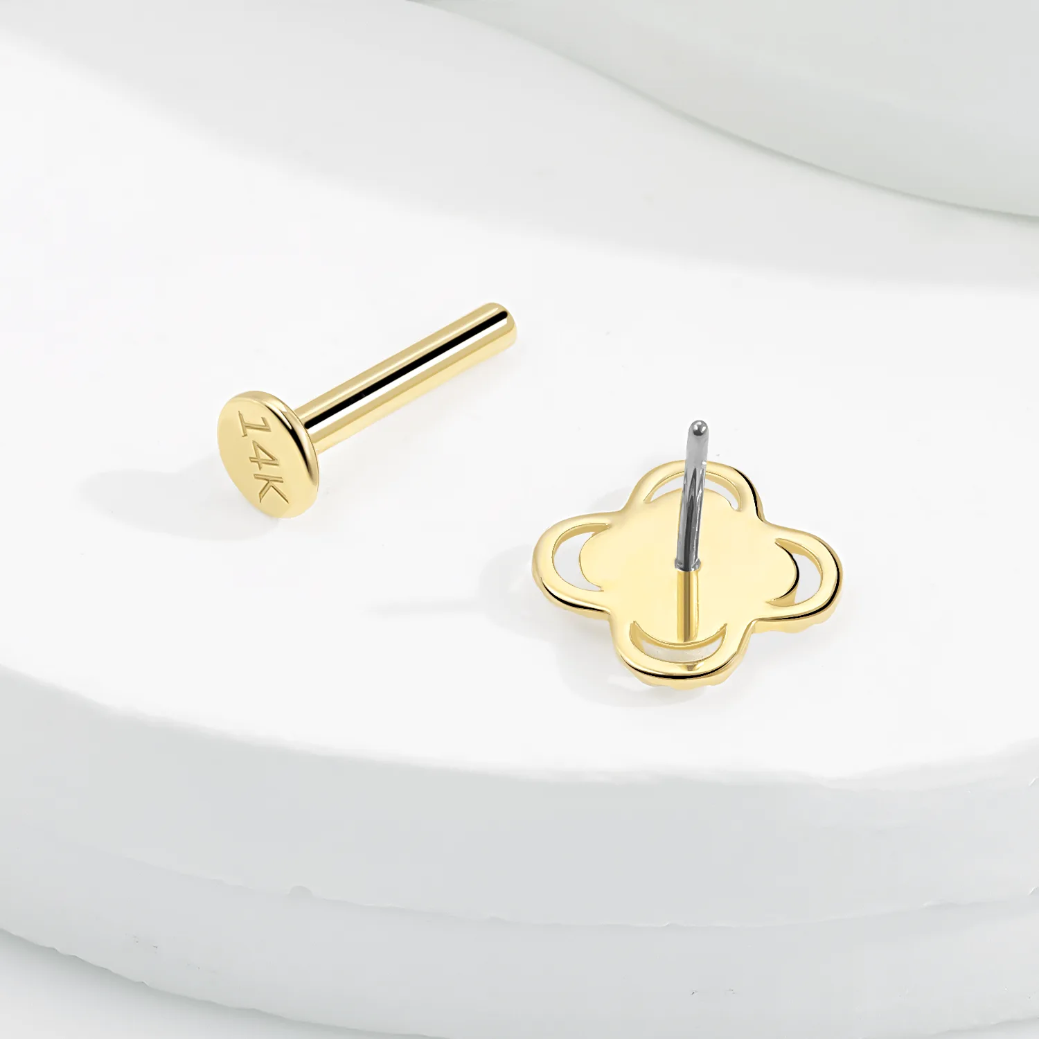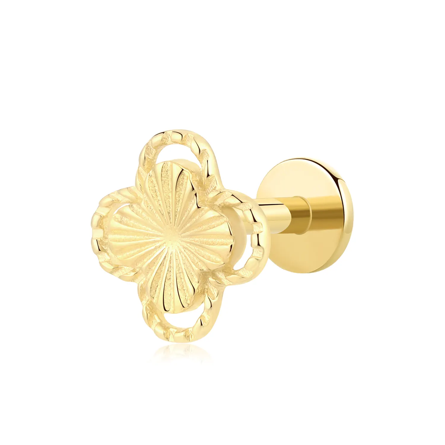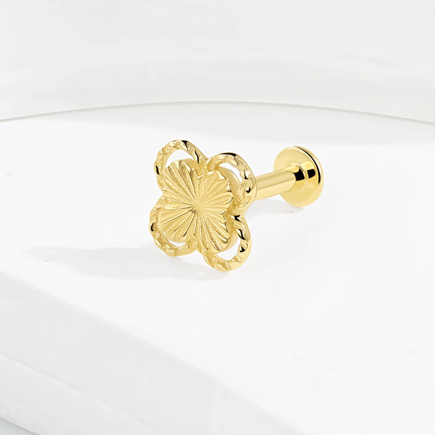Introducing GUE31160G – a 14K solid gold threadless labret stud with a radiant clover-inspired floral motif. The embossed petal texture and steel push-pin design deliver timeless style and secure comfort for your body piercings.