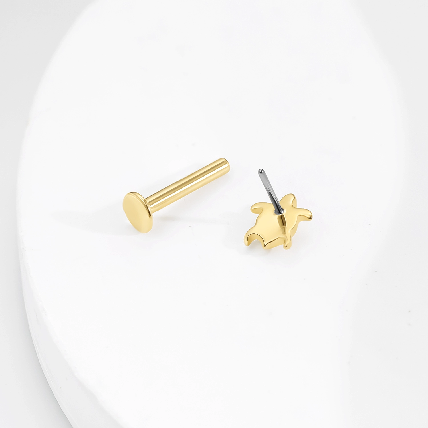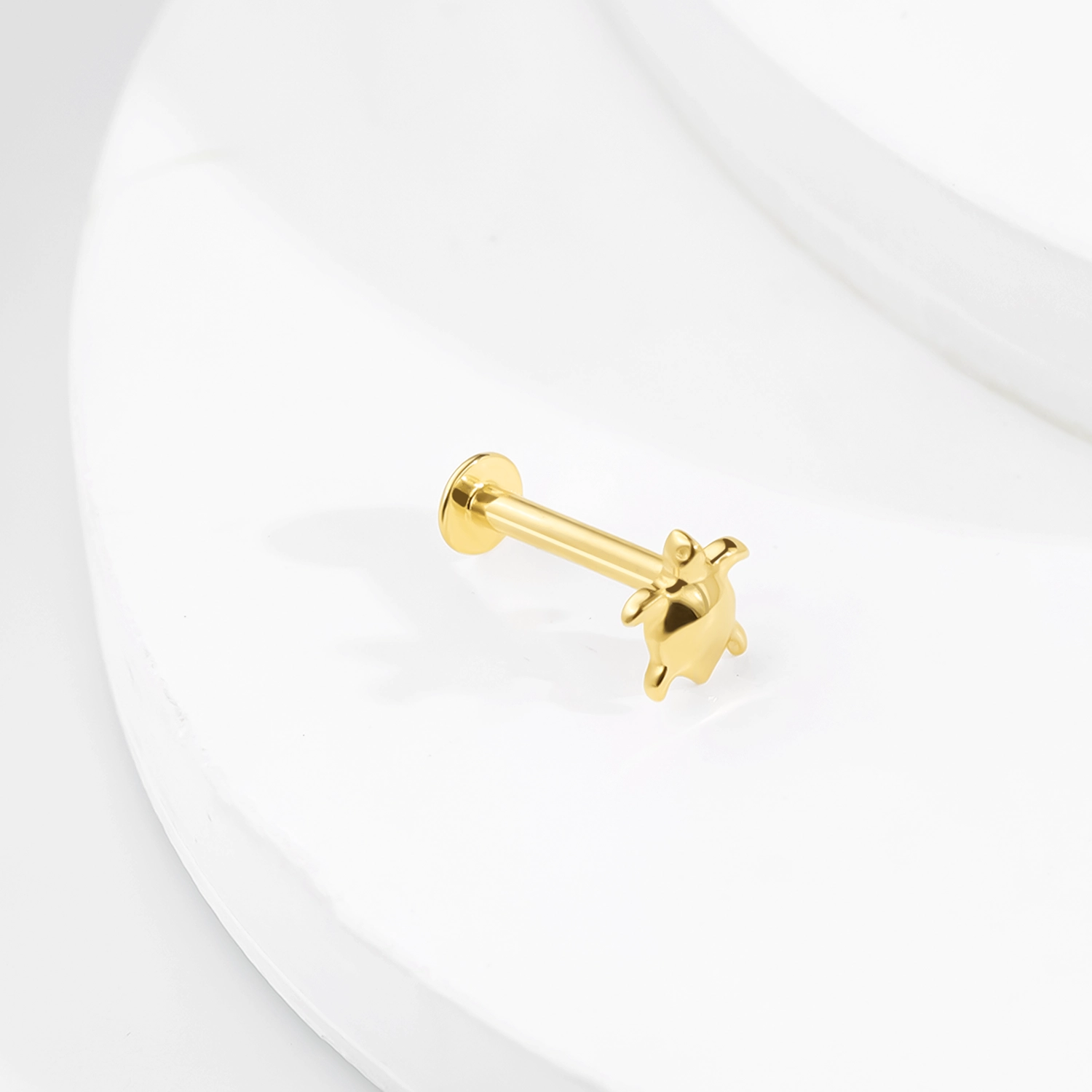 Introducing GUE31259G: This 14K solid gold threadless labret stud features a beautifully detailed turtle design, symbolizing longevity and wisdom. Its sleek, polished surface adds a touch of elegance, while the steel push pin ensures secure and comfortable wear. Perfect for those who appreciate nature-inspired jewelry, this piece adds charm and personality to any piercing.