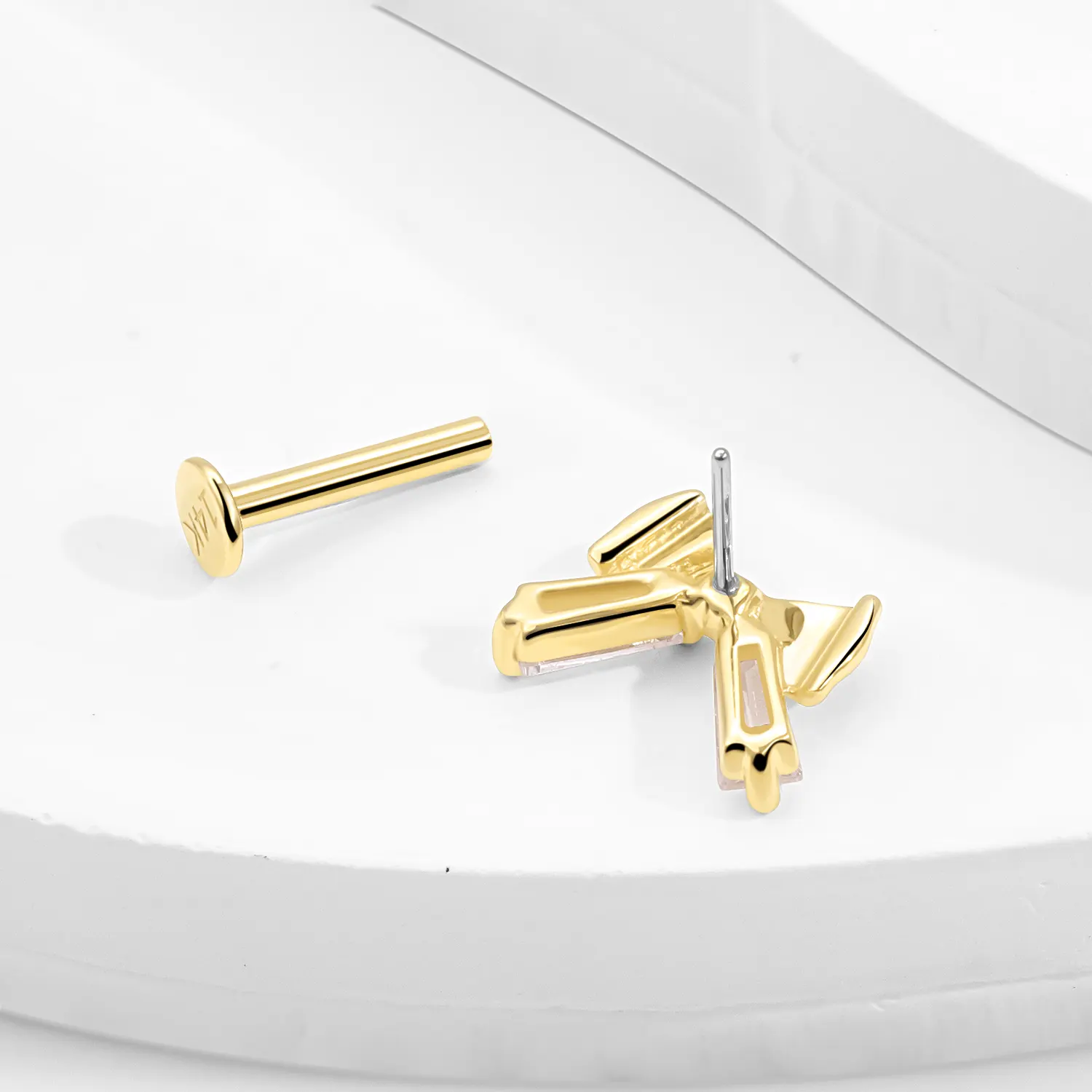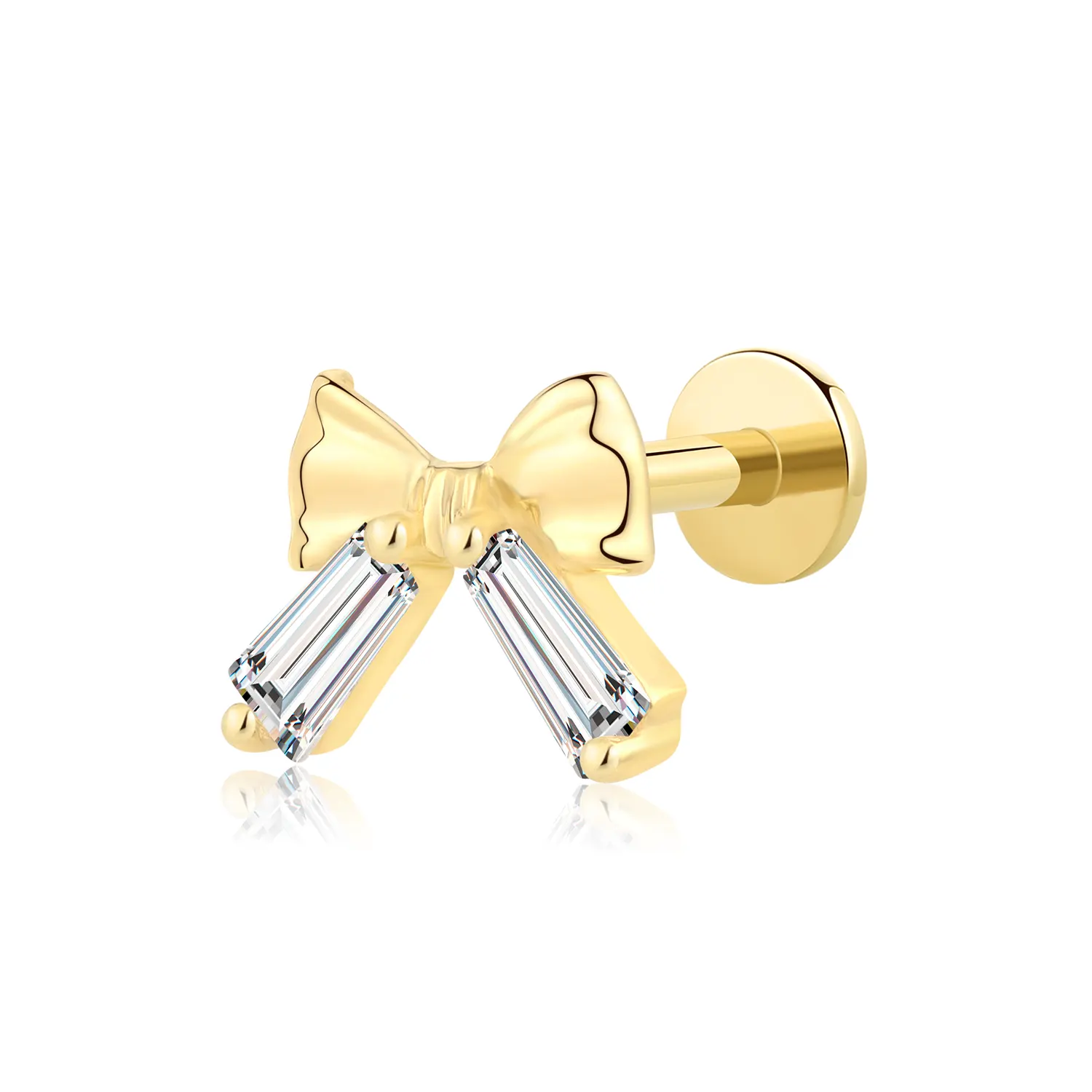 Introducing GUE31180G: a dainty threadless labret stud made of 14K solid gold, showcasing a sculpted bow with two vertical baguette-cut CZ stones. A sweet, polished touch to any piercing.